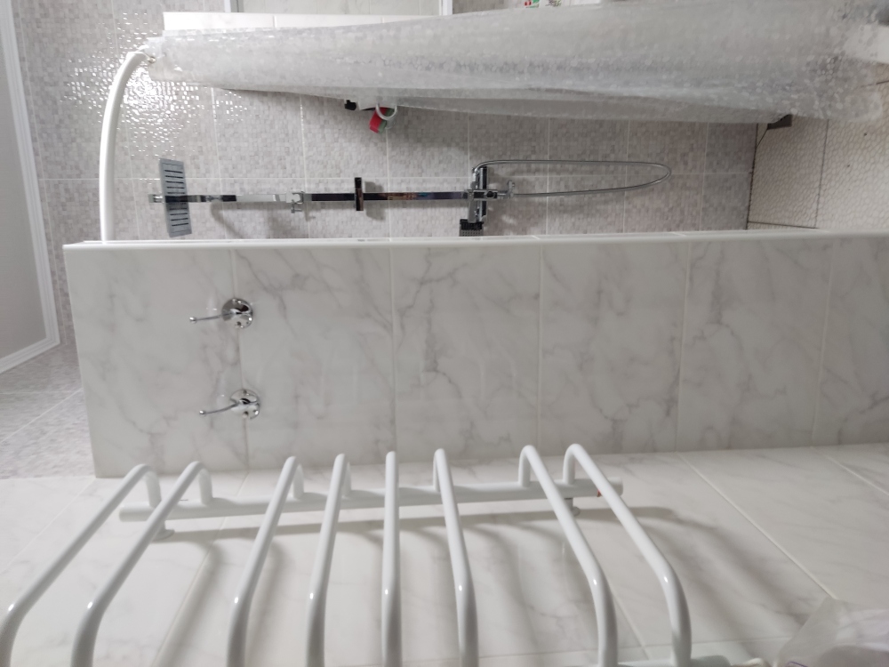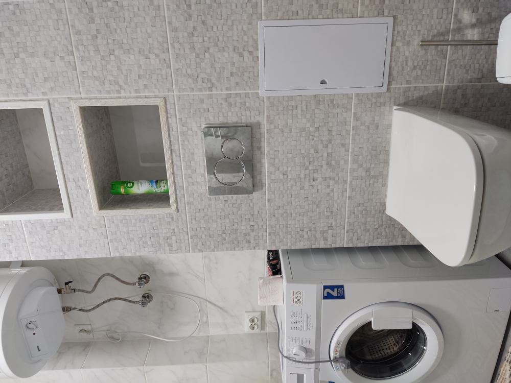 В санузле: душевая кабинка, бойлер, стиральная машинка , унитаз и полотенцесушитель .