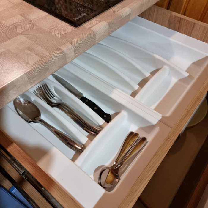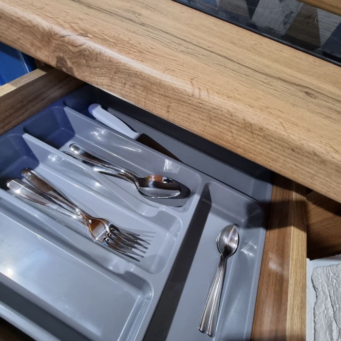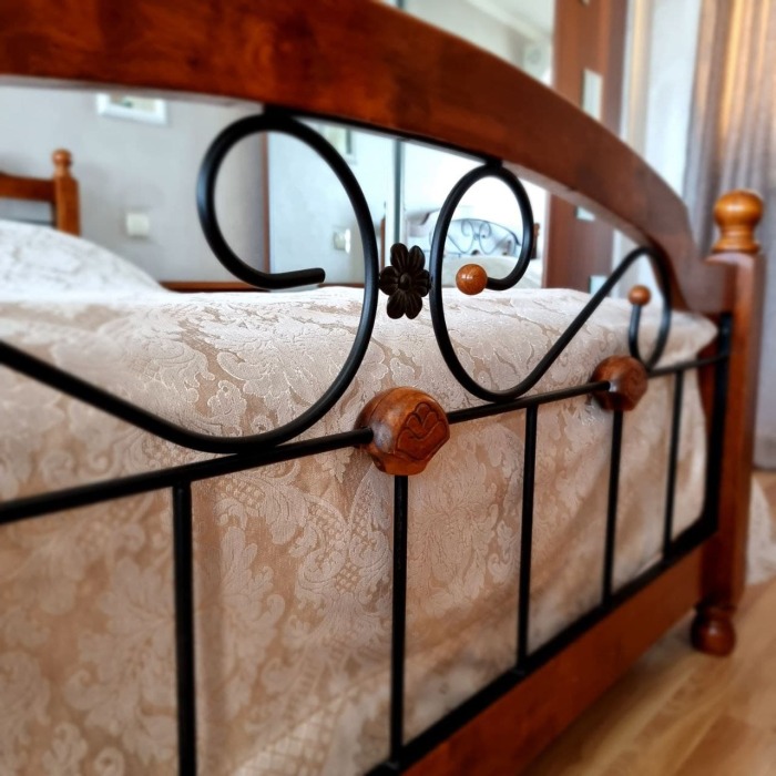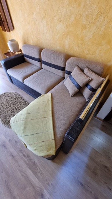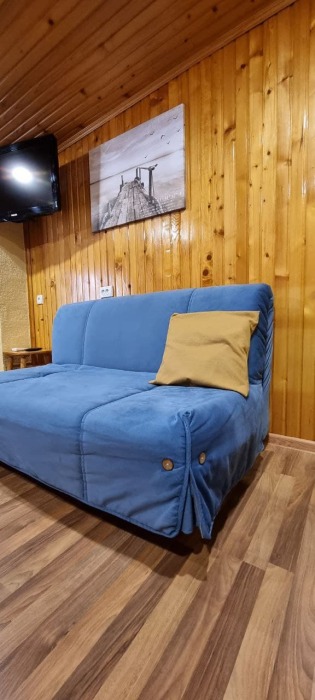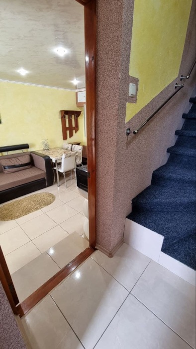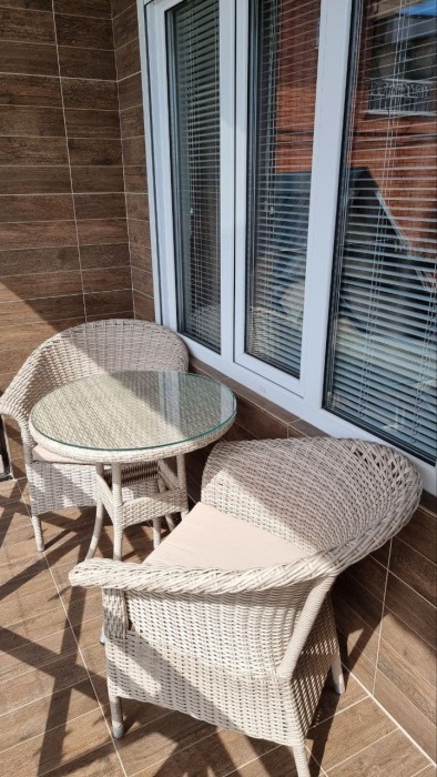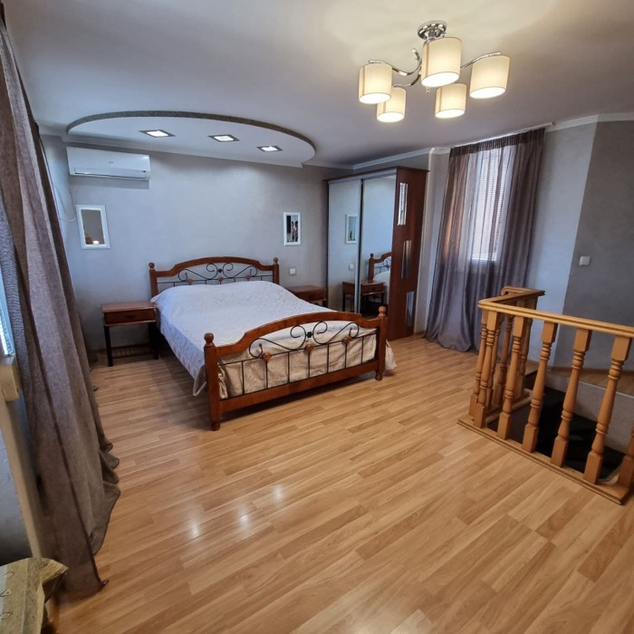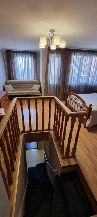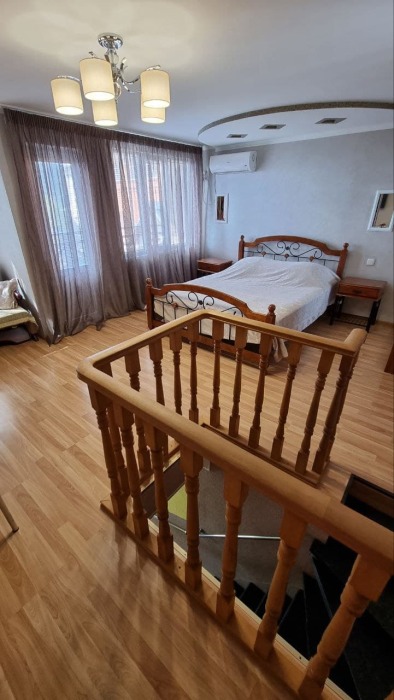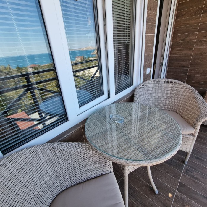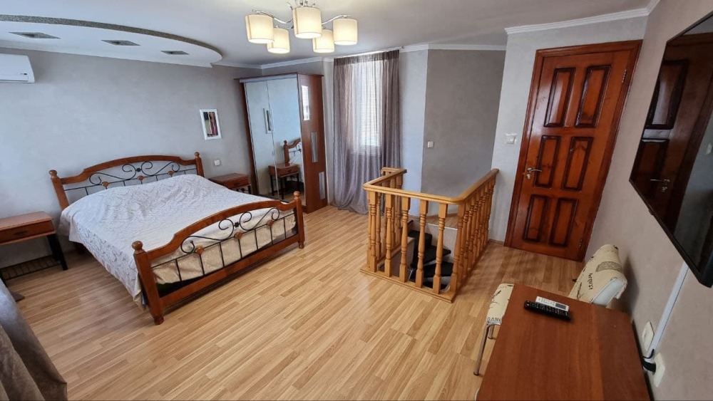 На первом этаже кухня и диван 2-местный, душ и туалет - раздельно, на втором этаже - двухспальная кровать и софа 2-спальная, балкон с видом на море.