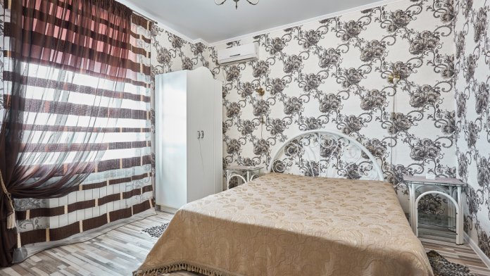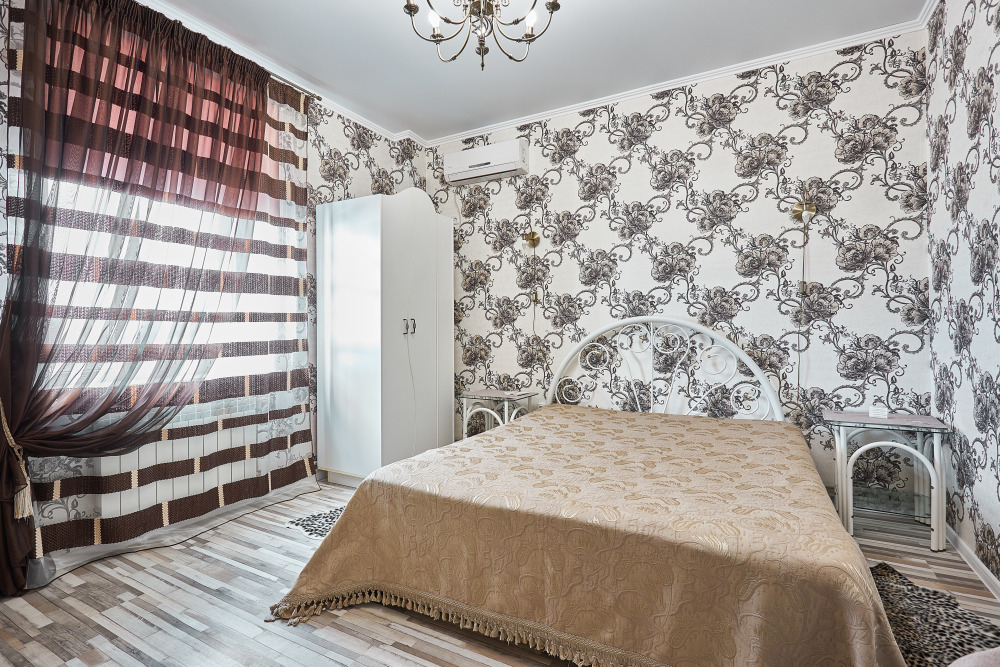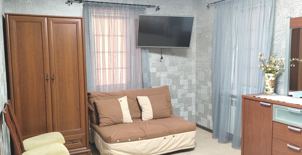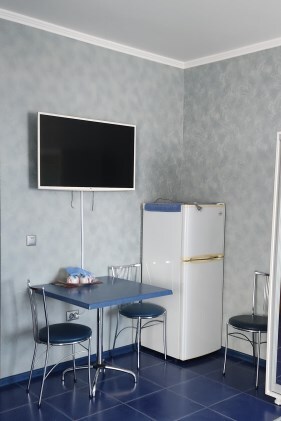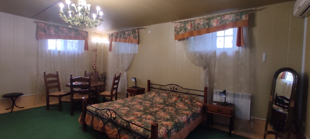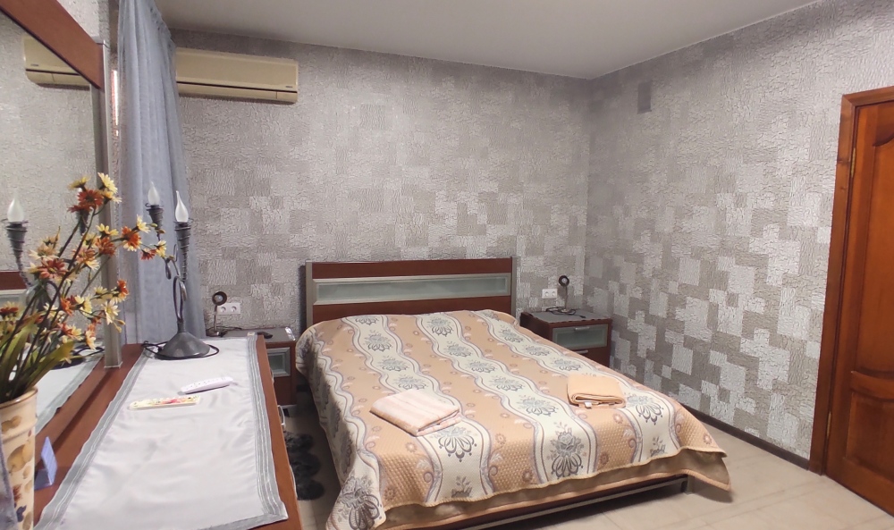 Комфортабельный однокомнатный номер с одной двуспальной кроватью и всеми удобствами. В номере кондиционер, телевизор, холодильник, стол, набор посуды и всё, что нужно для комфортного отдыха.