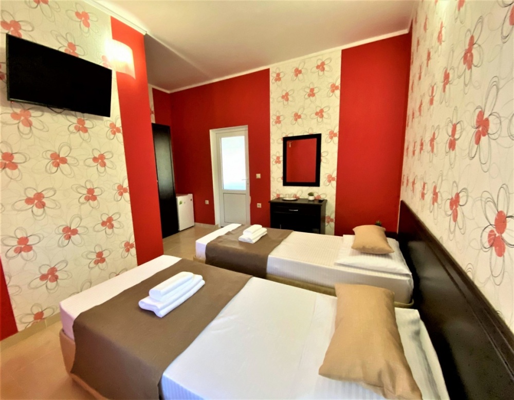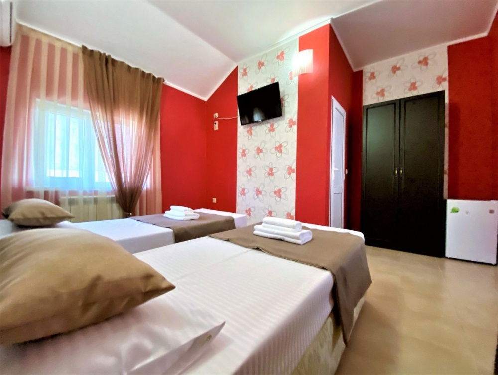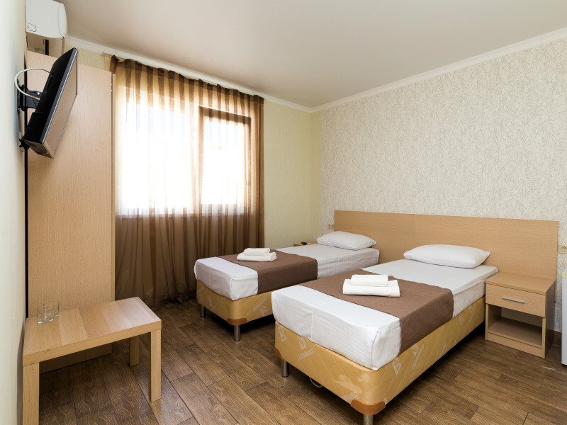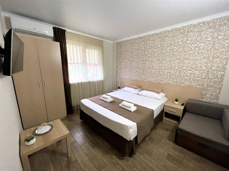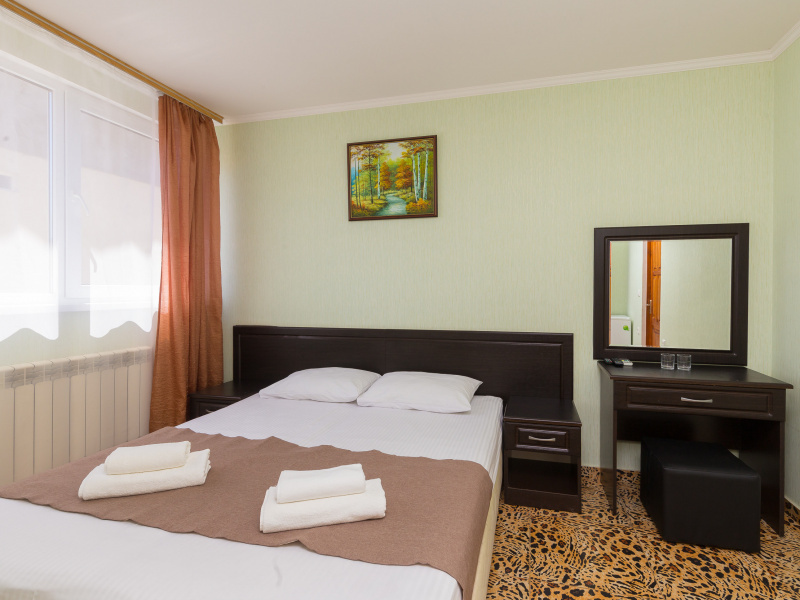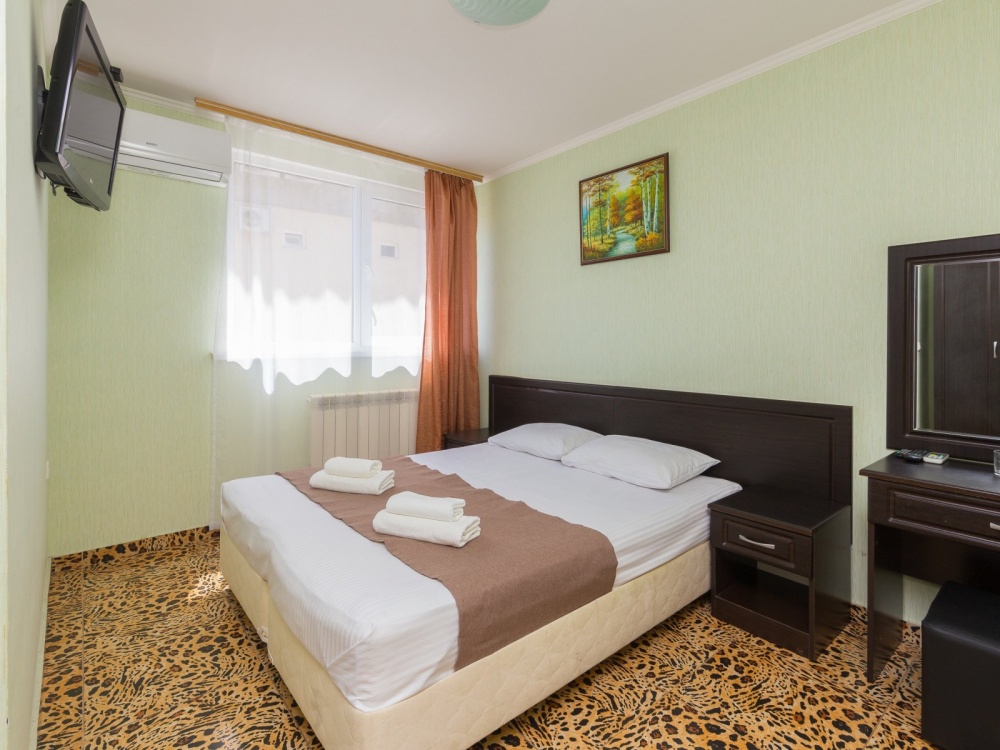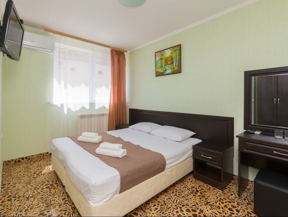 В номере: кровать duble или twin, телевизор, зеркало, кондиционер, гардероб, холодильник, стаканы, душ и санузел, пуфик, комплект полотенец, косметические принадлежности. Дополнительное место - еврораскладушка. Максимальное количество человек – 3.