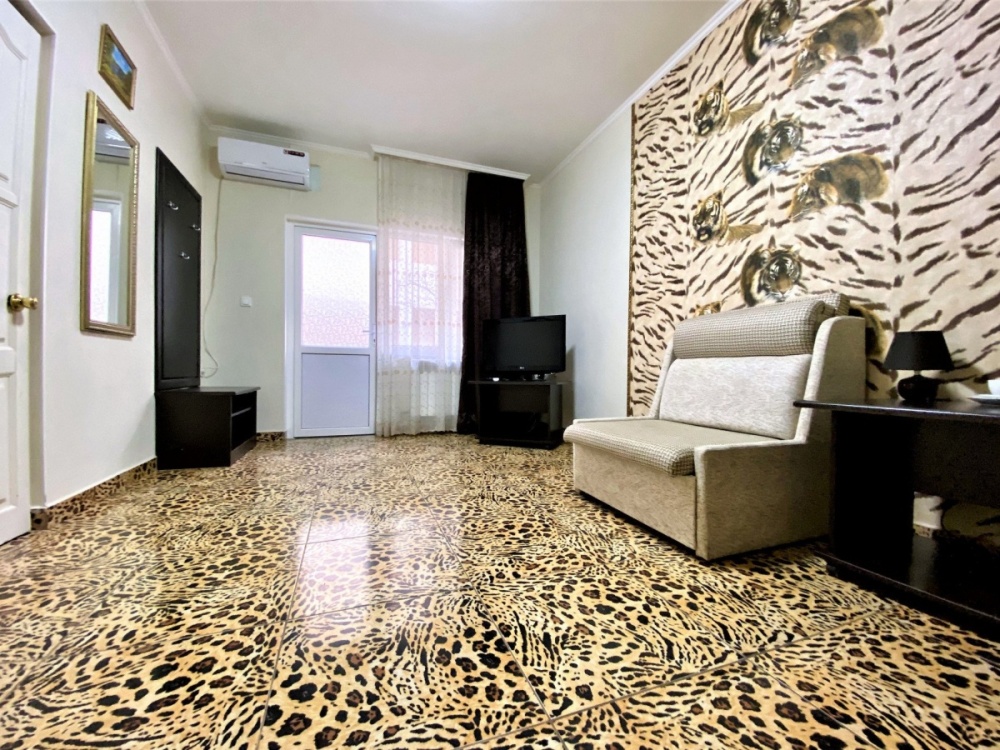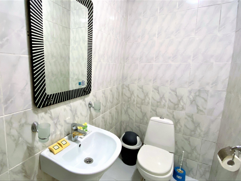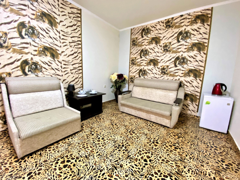 В номере: кровать duble/twin, мягкая мебель, TV, зеркало, кондиционер, гардероб, холодильник, посуда, электрический чайник, душ и санузел, стол, пуфик, комплект полотенец, косметика, фен. Дополнительное место - диван или кресло-кровать. Максимальное количество человек – 5.