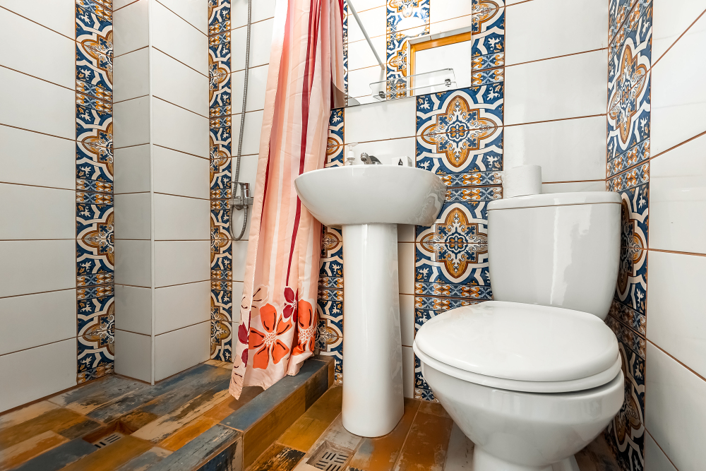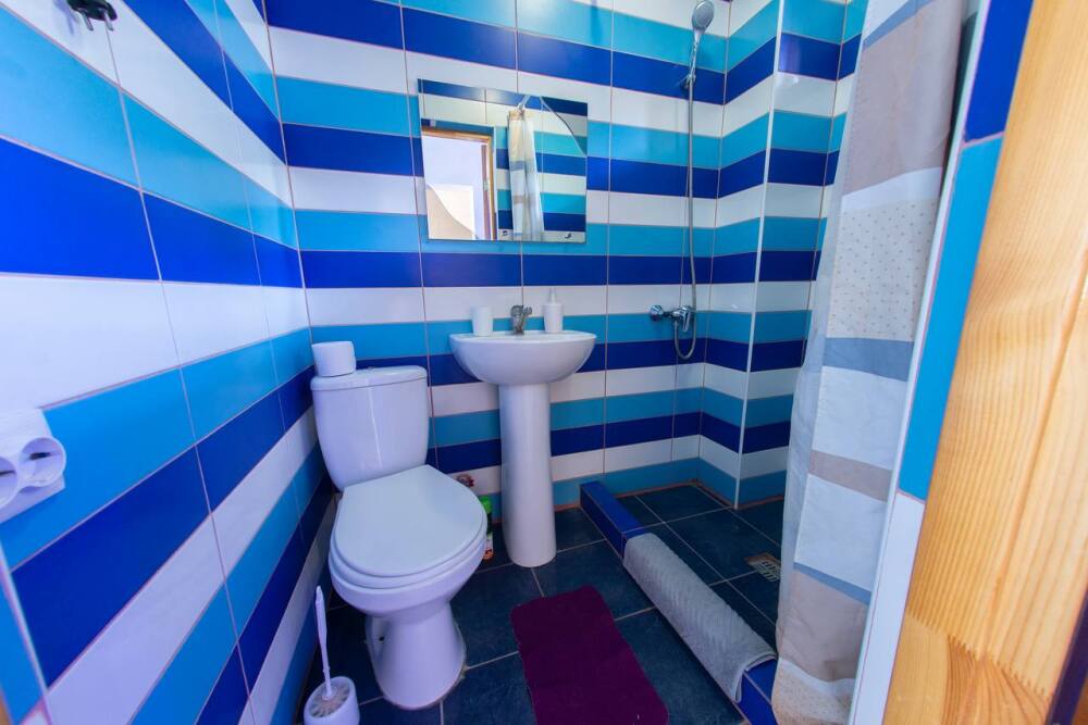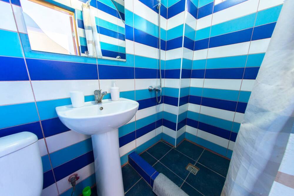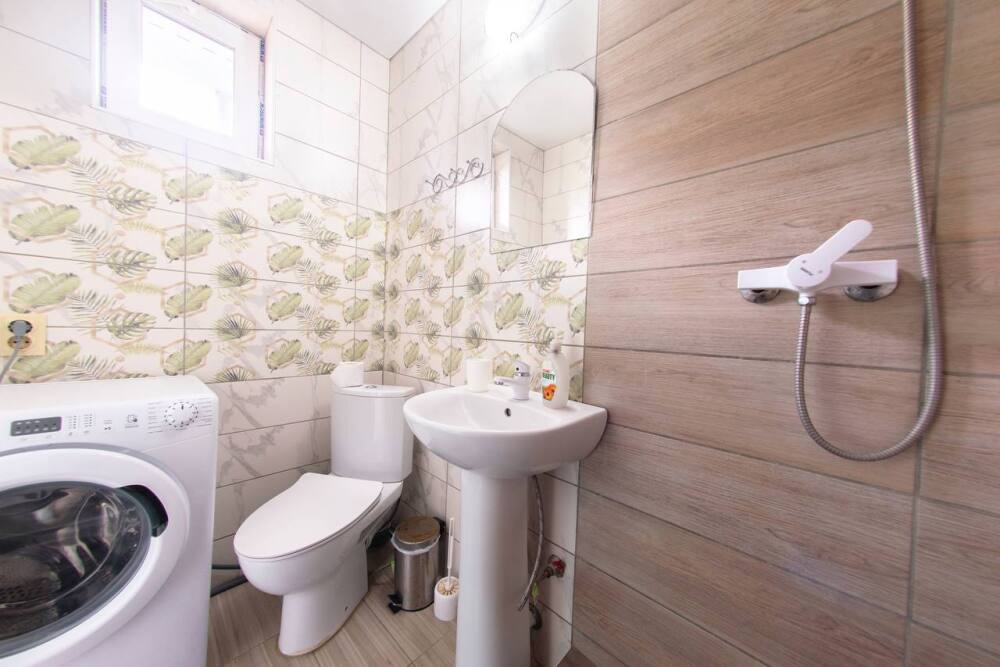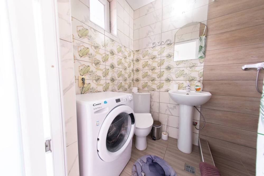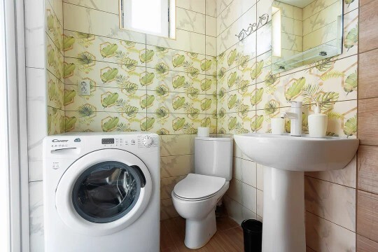Удобства: душ, туалет, раковина, зеркало и стиральная машинка.