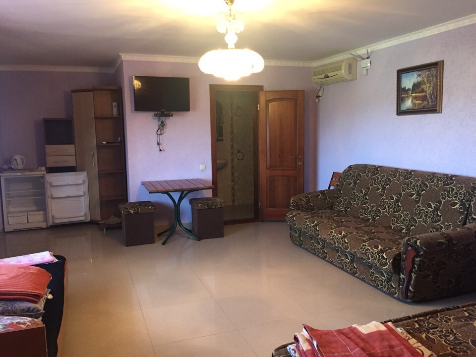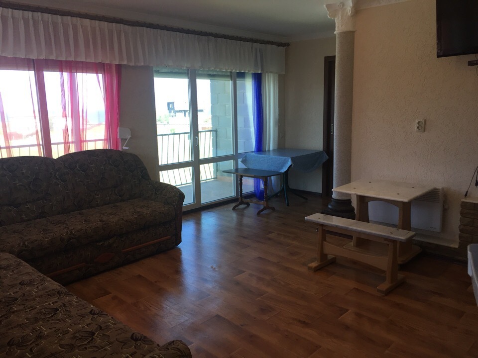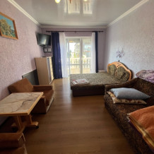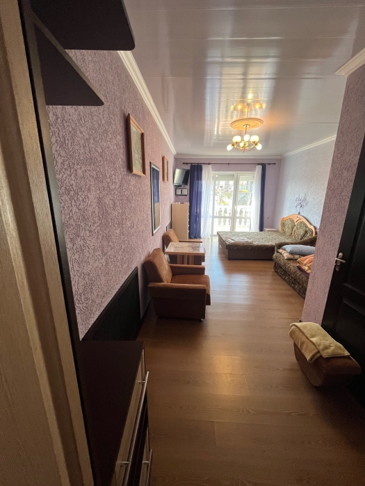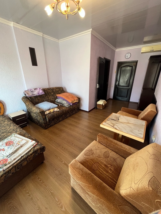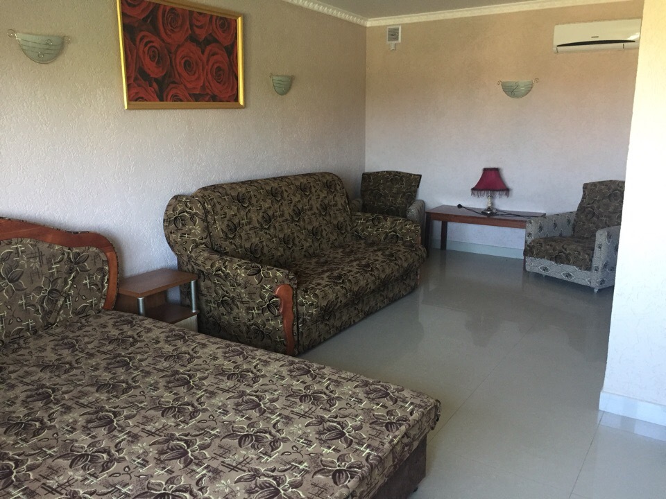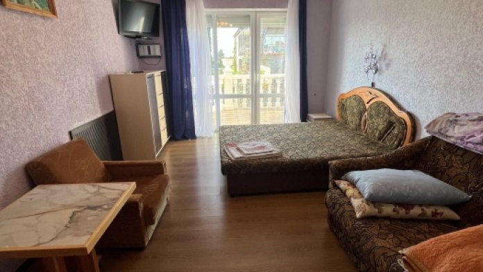 Номер рассчитан на комфортное размещение 2-5 человек. В номере есть отдельный санузел. Вода, как холодная, так и горячая подается круглосуточно и бесперебойно. Нагрев воды обеспечивается бойлерами достаточной мощности, чтобы в любое время суток не испытывать дискомфорта. Номер имеет широкое двухметровое окно и просторный балкон, откуда открывается вид на море. Две отдельные комнаты, своя кухня. Санузел в номере. Гостиная. Если Вы приехали компанией либо привыкли чувствовать себя, как дома, имея все под рукой, то этот номер для Вас.