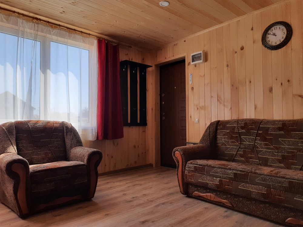 Номер рассчитан на комфортное размещение 2-5 человек. В номере есть отдельный санузел. Вода, как холодная, так и горячая подается круглосуточно и бесперебойно. Нагрев воды обеспечивается бойлерами достаточной мощности, чтобы в любое время суток не испытывать дискомфорта. Номер имеет широкие окна и просторный вид на палисадник. Две отдельные комнаты, своя кухня. Санузел в номере. Гостиная.