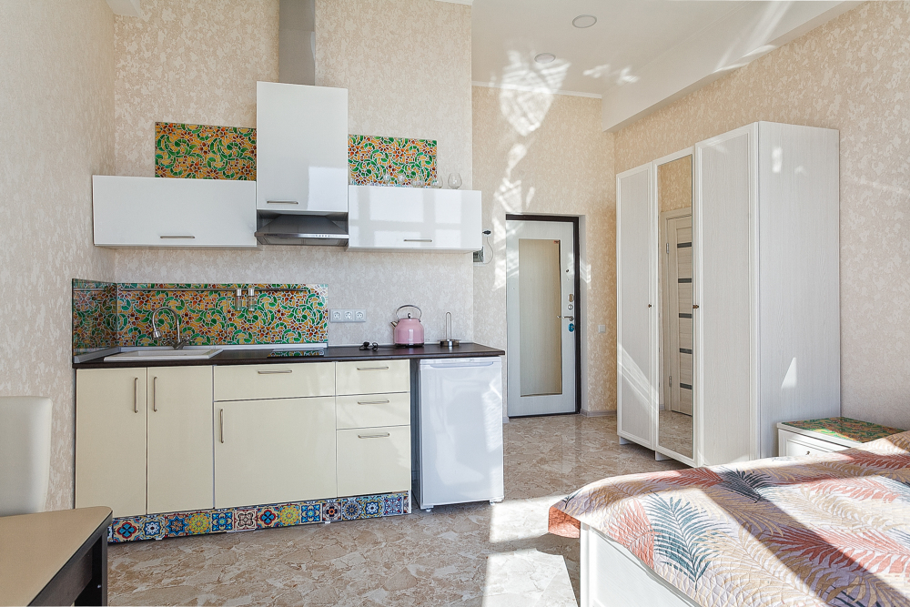 Однокомнатная квартира-студия с потрясающим видом на бескрайнее море и парк на четвертом этаже напротив санатория имени Боброва.
