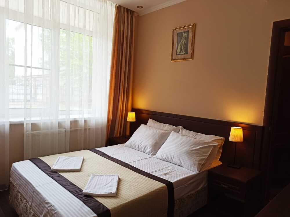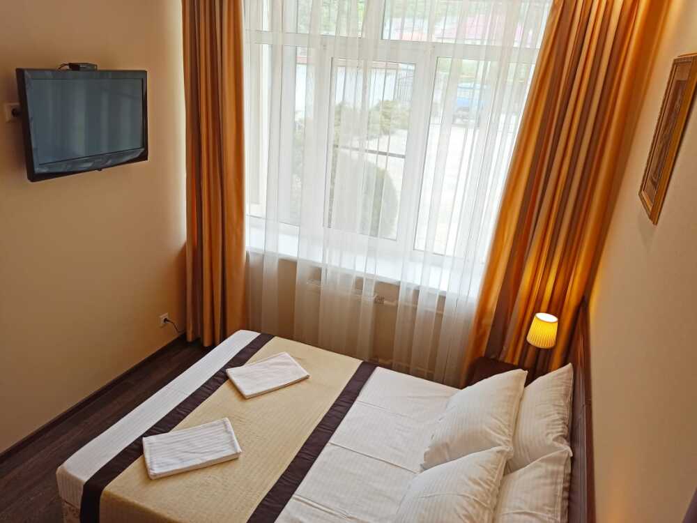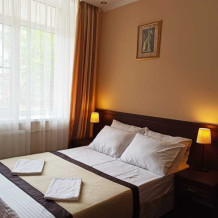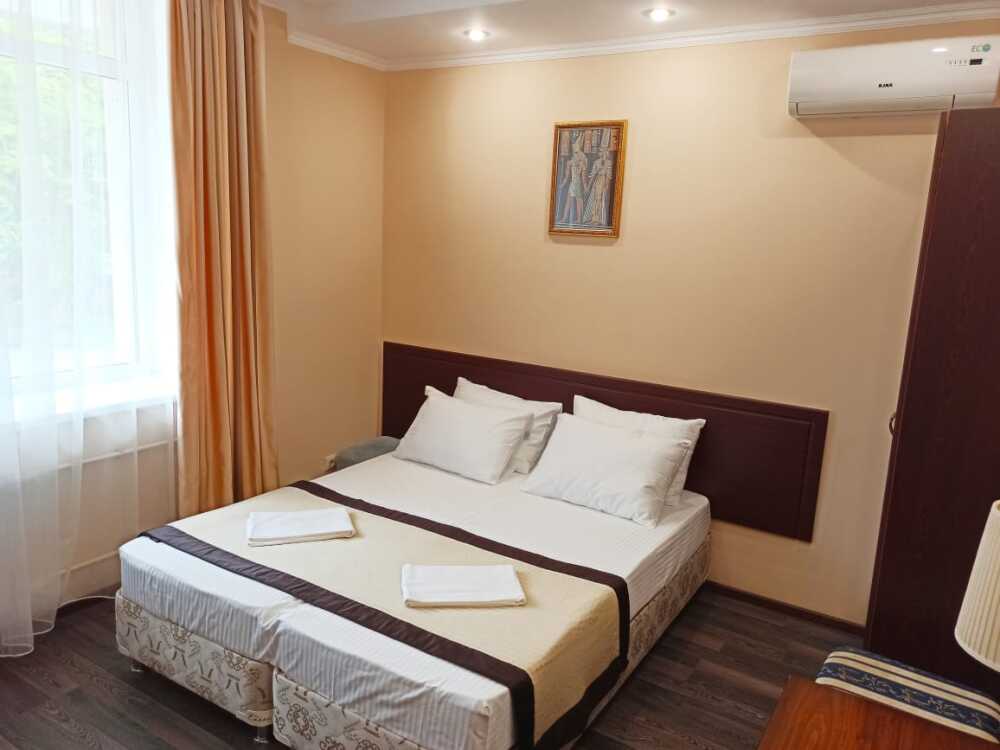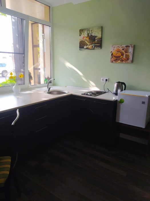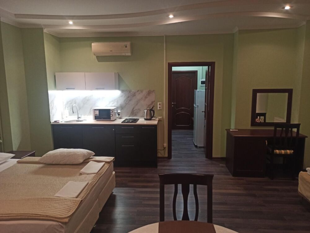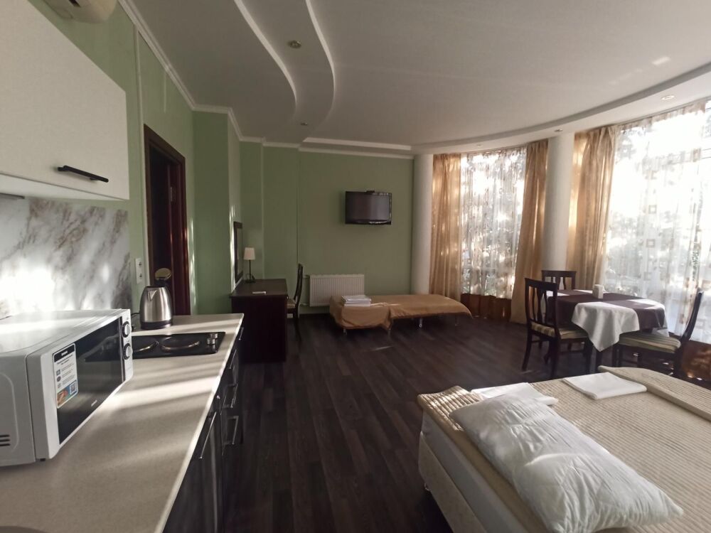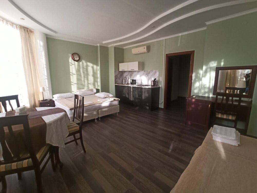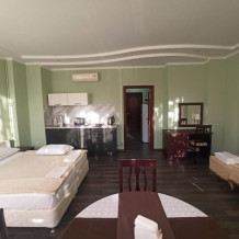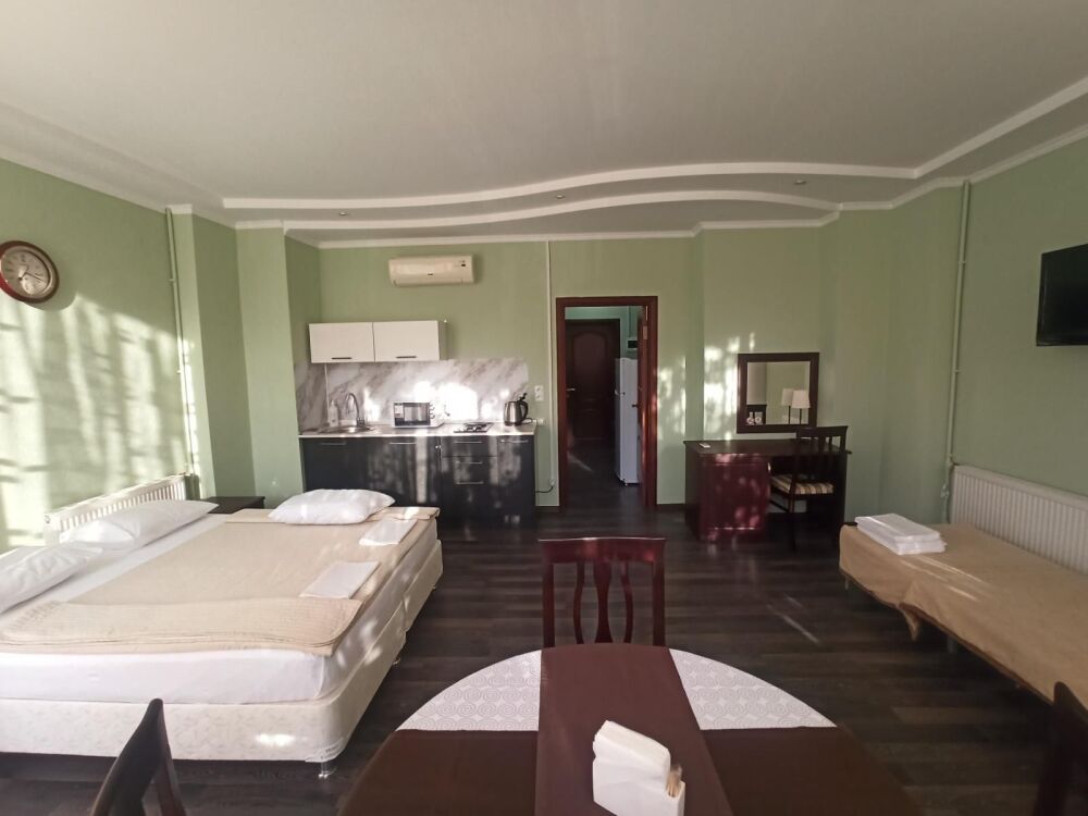 Апартаменты, вместимостью до 4-х человек, расположены на первом этаже с видом на горы и детскую площадку. Две раздельные комнаты, в одной из которых оборудована мини-кухня оснащенная всей необходимой посудой и бытовой техникой. Санузел с душевой кабиной и феном. В комнатах установлены ТВ и кондиционеры. Так же есть утюг и гладильные принадлежности.