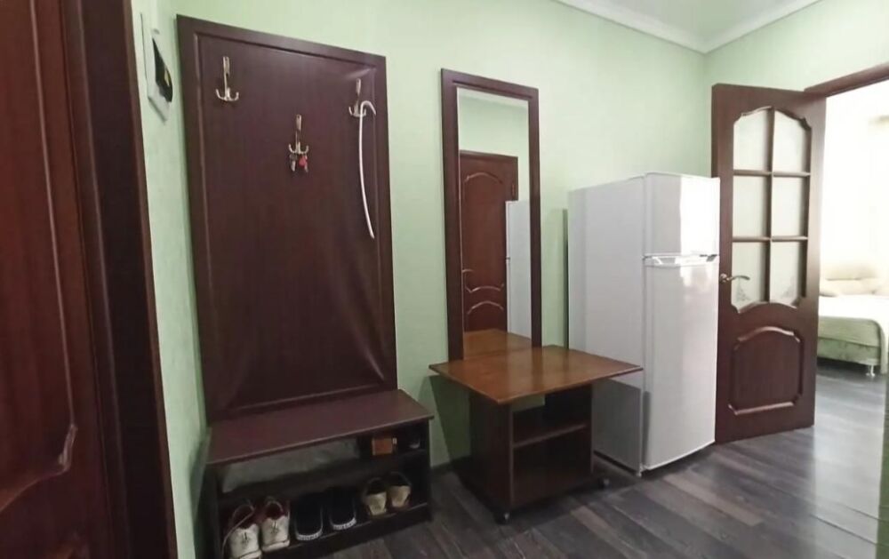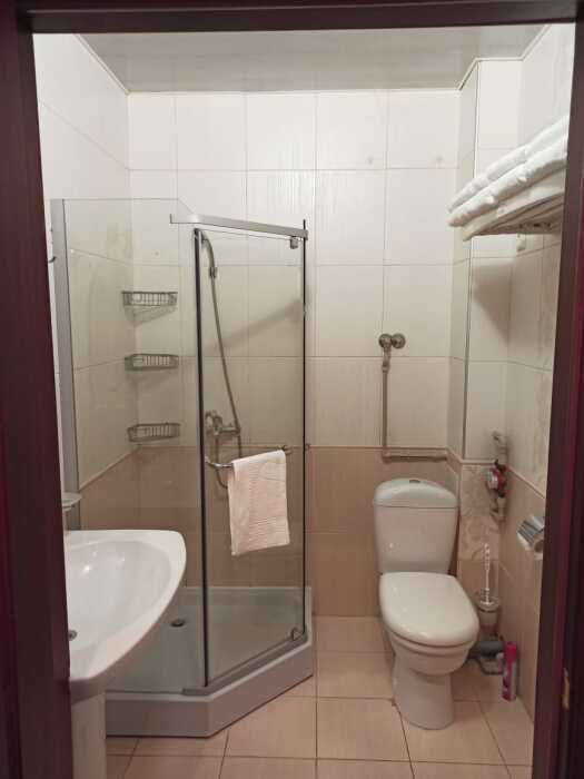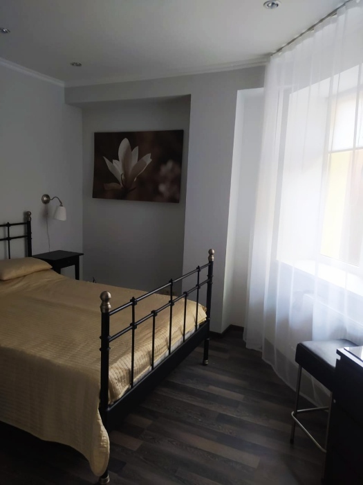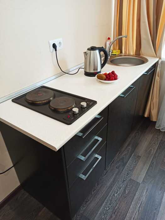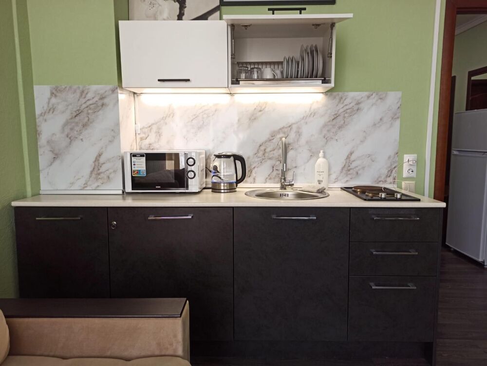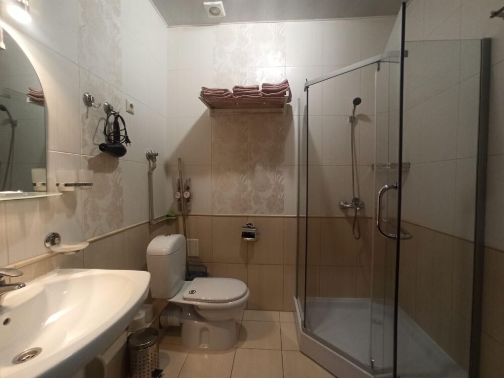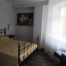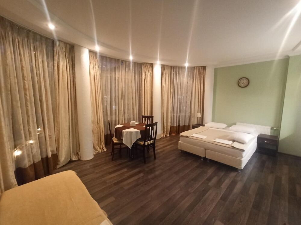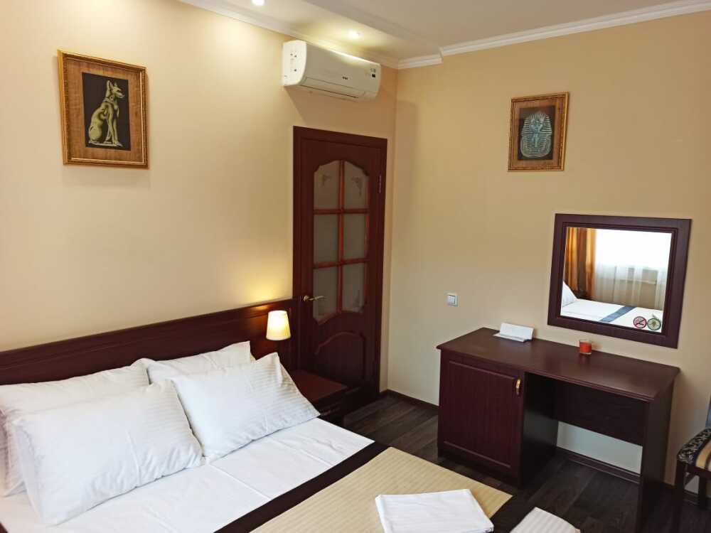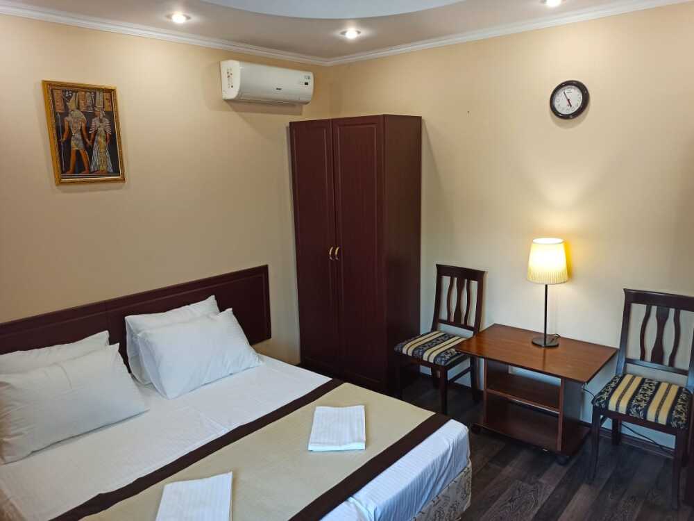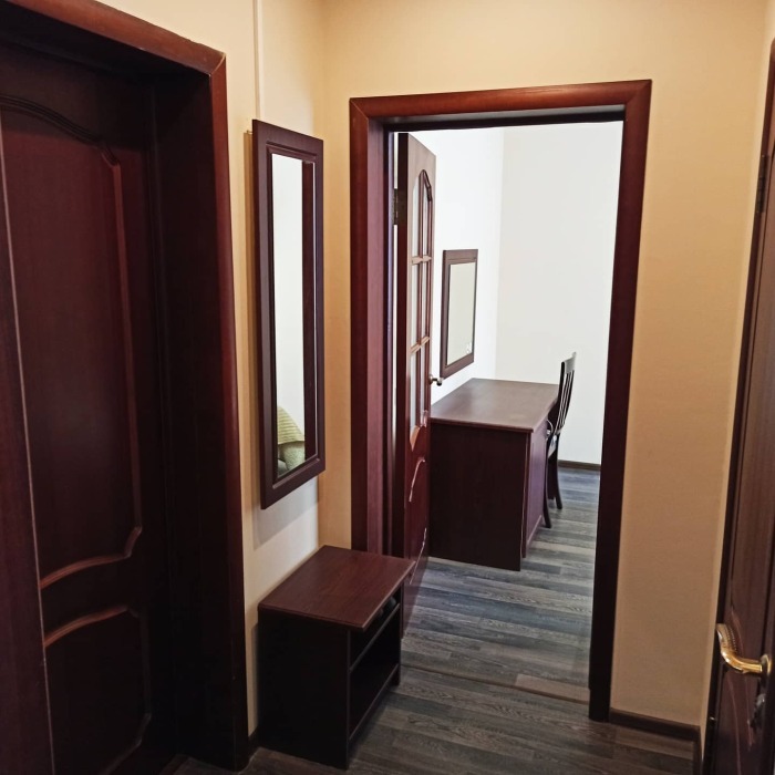 Апартаменты, вместимостью до 4-х человек, расположены на первом этаже с видом на горы и детскую площадку. Две раздельные комнаты, в одной из которых оборудована мини-кухня оснащенная всей необходимой посудой и бытовой техникой. Санузел с душевой кабиной и феном. В комнатах установлены ТВ и кондиционеры. Так же есть утюг и гладильные принадлежности.