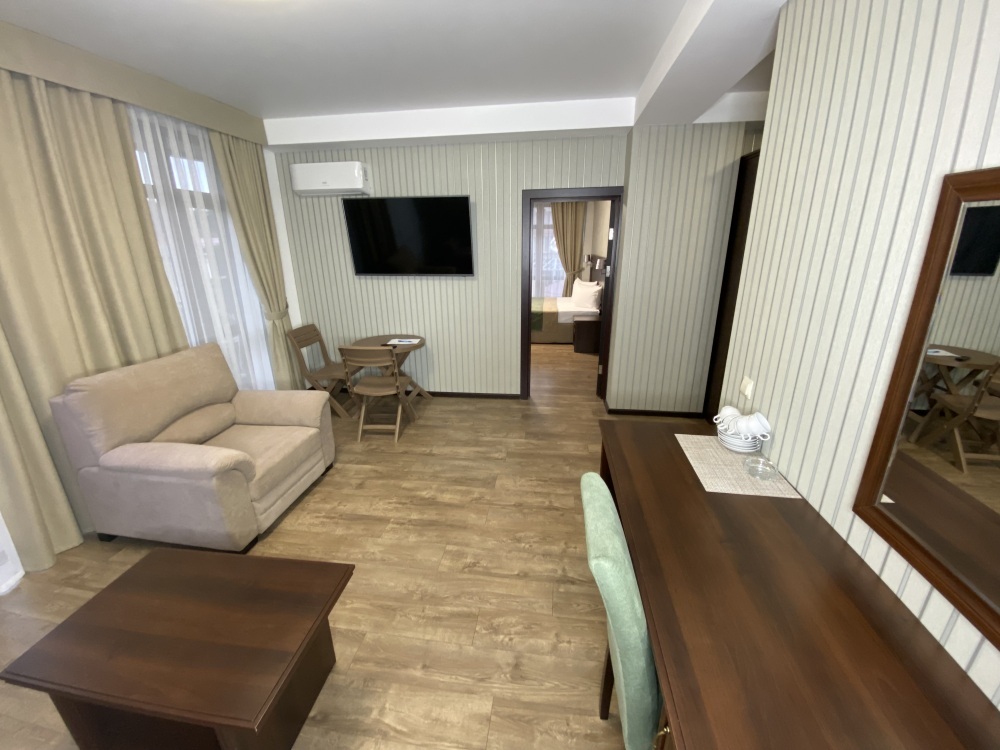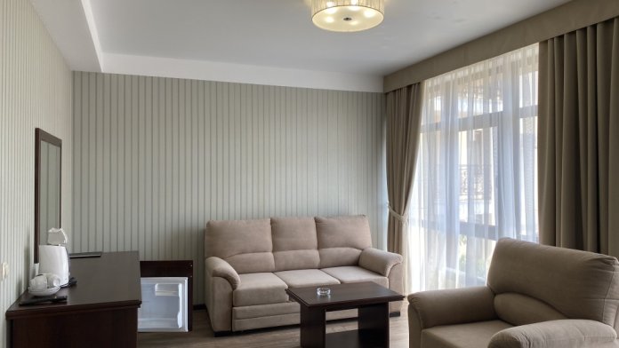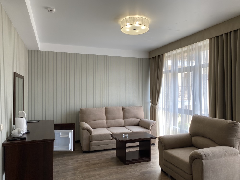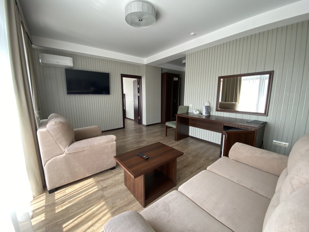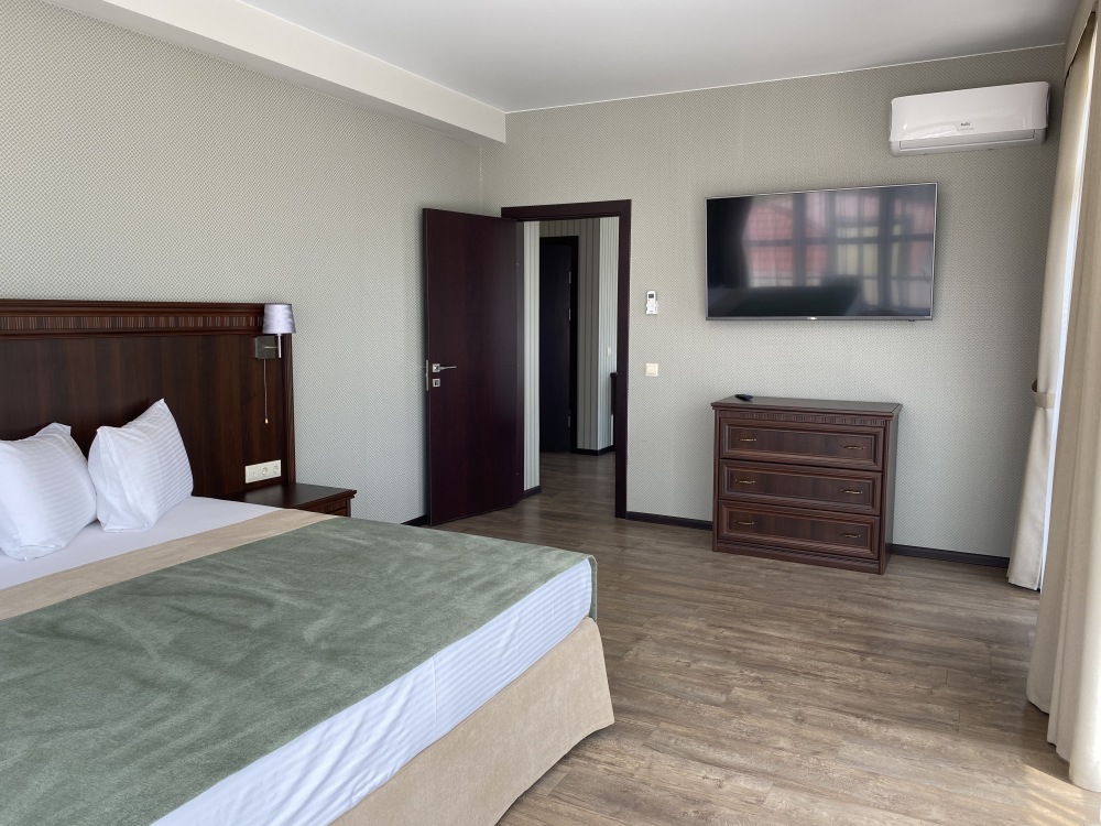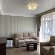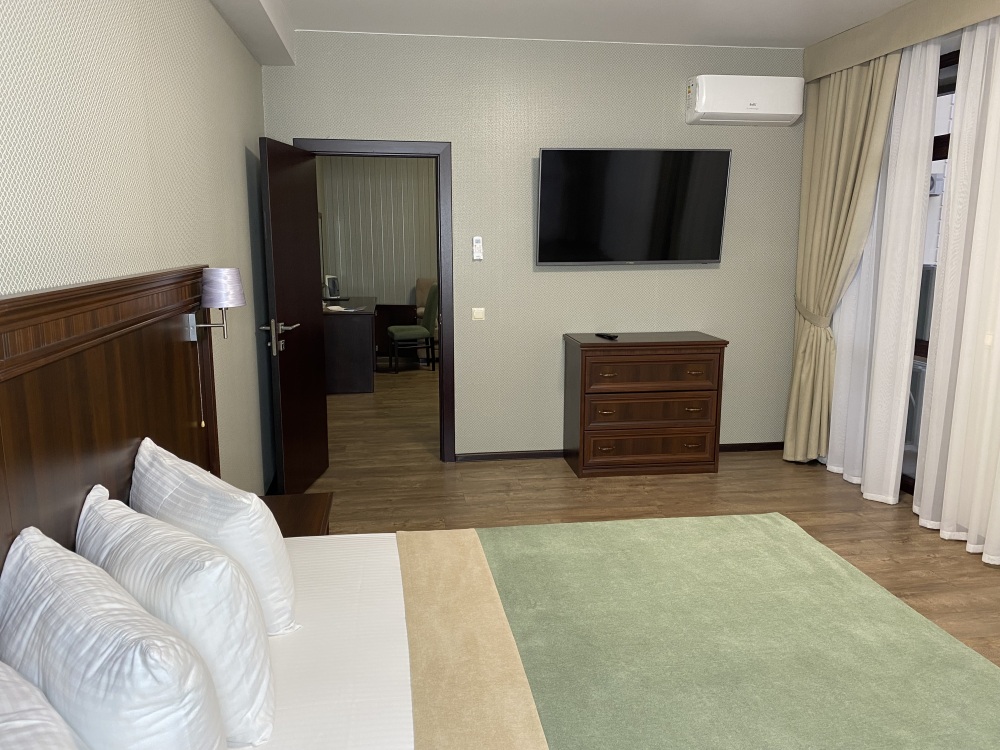 Роскошный большой двухкомнатный номер с балконом и видом на внутренний двор. Эксклюзивный дизайн и насыщенные яркие тона создают неповторимую атмосферу сочетания стиля и комфорта. Каждая из комнат номера, гостиная и спальня, оборудована системой климат-контроля, выходом в интернет (Wi-Fi), SMART-телевизором, а также дверью для выхода на балкон. В Вашем распоряжении ванная комната с душевой кабиной, феном, комплектом полотенец и косметическим зеркалом.