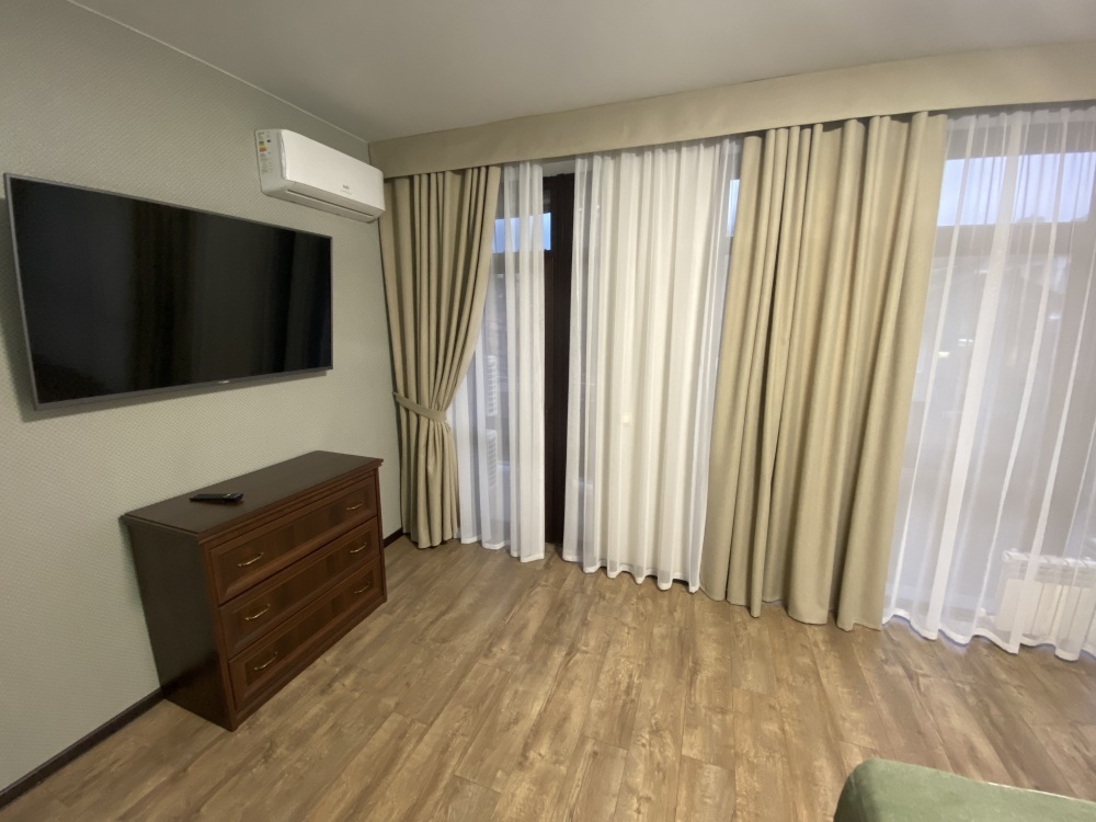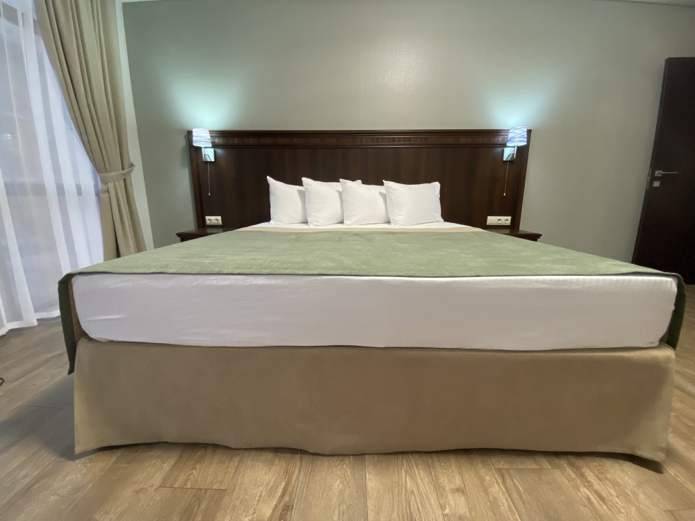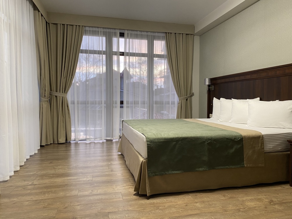 Стандартный двухместный номер со всеми удобствами и балконом с видом на улицу. Номер оборудован большой двуспальной кроватью с ортопедическим матрацем, системой климат-контроля, выходом в интернет (Wi-Fi), телевизором с плоским экраном и 20 каналами. В Вашем распоряжении ванная комната с душевой кабиной, феном, комплектом полотенец и косметическим зеркалом. Все, что нужно, для беззаботного отдыха!
