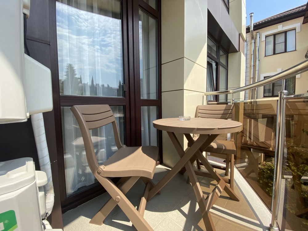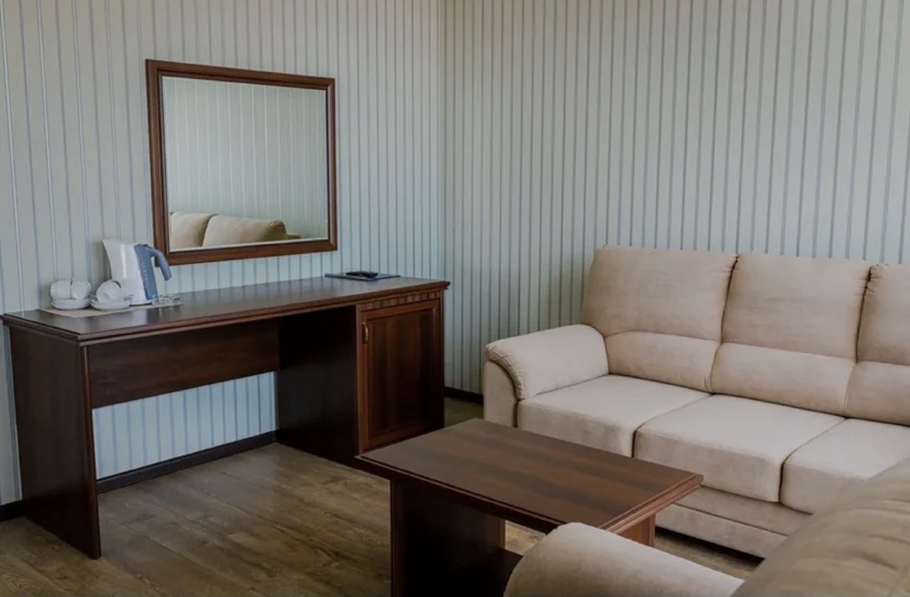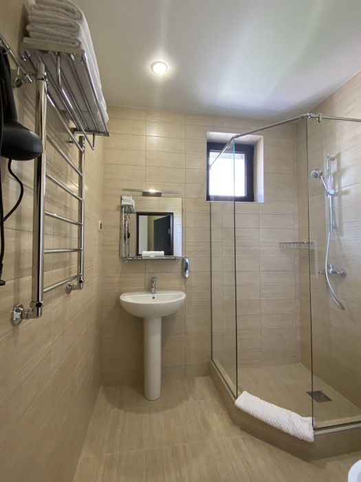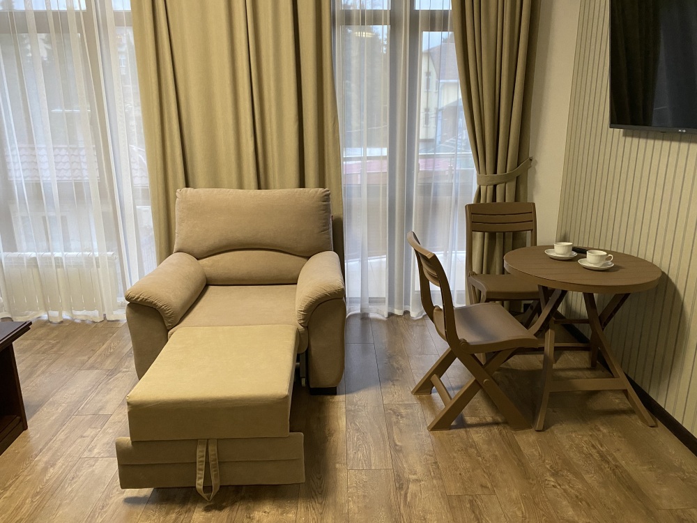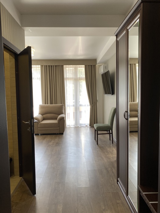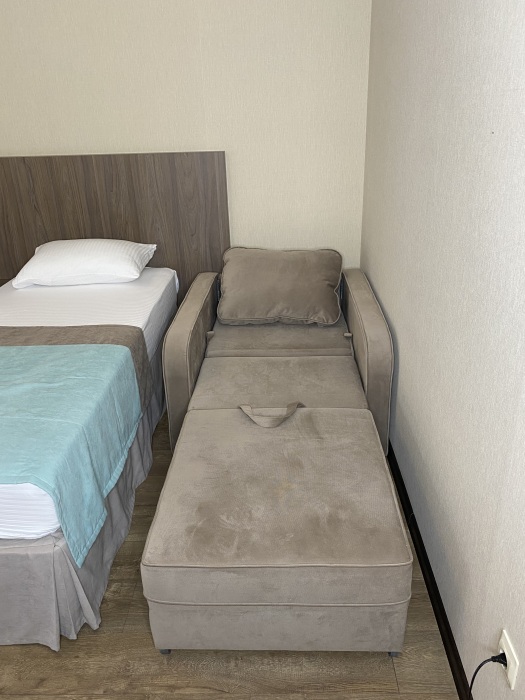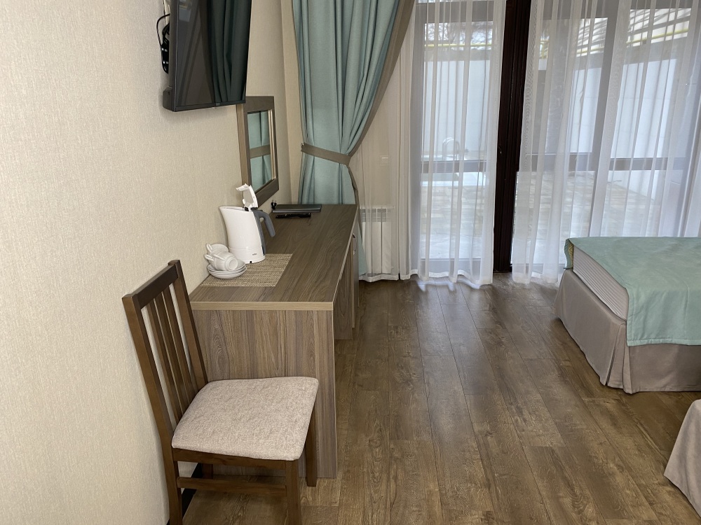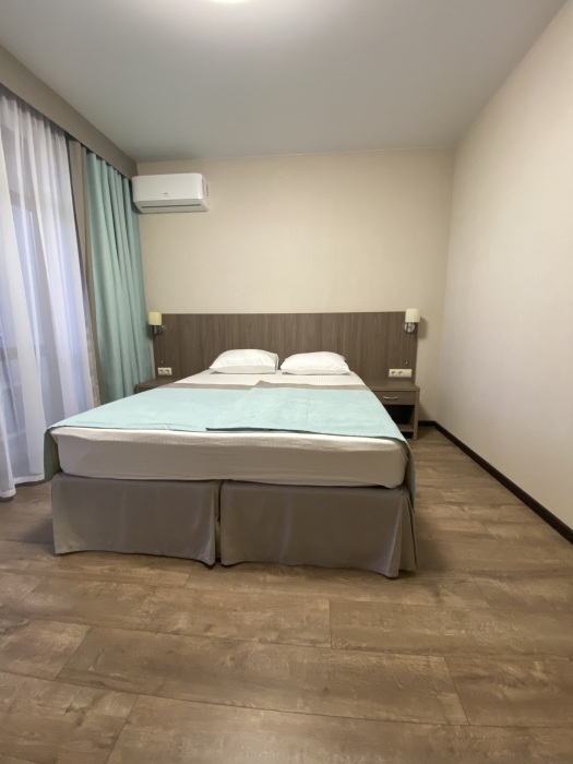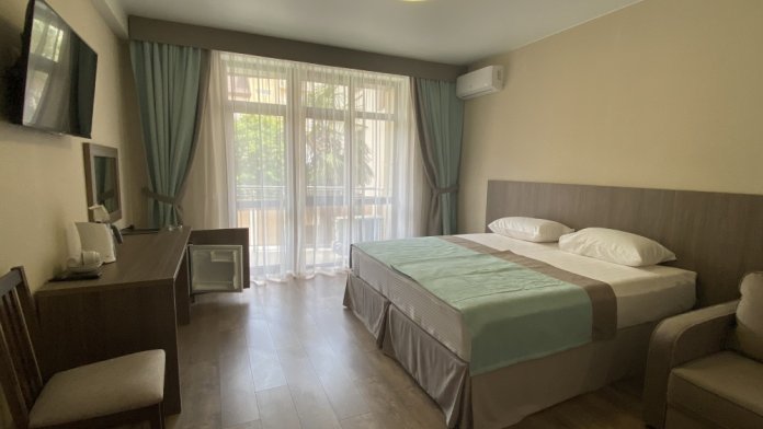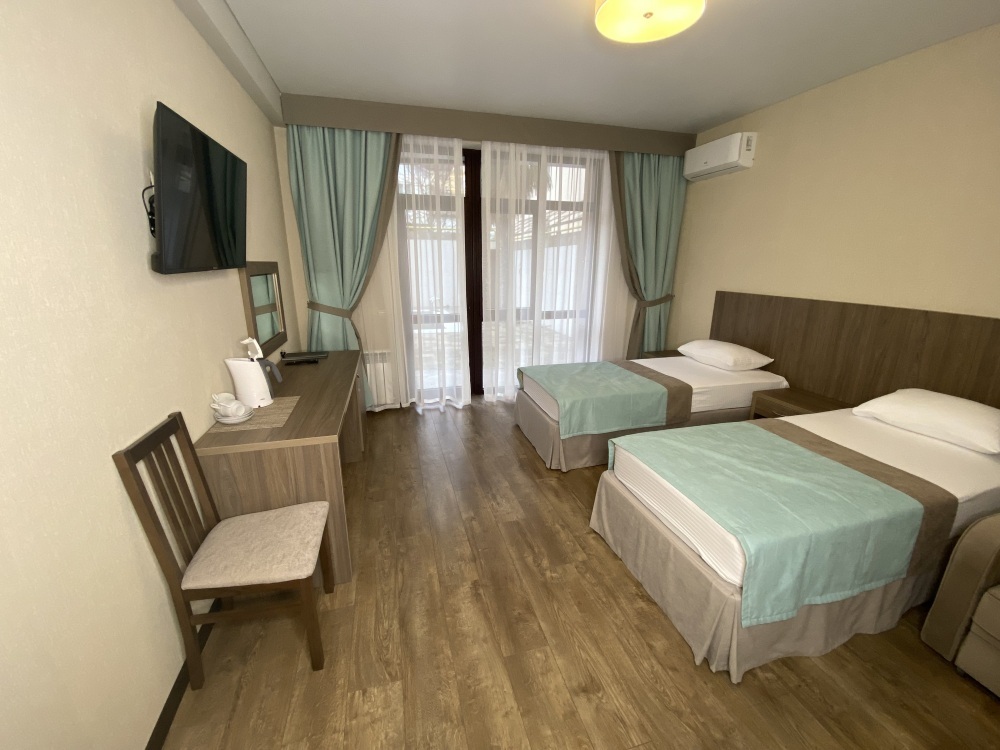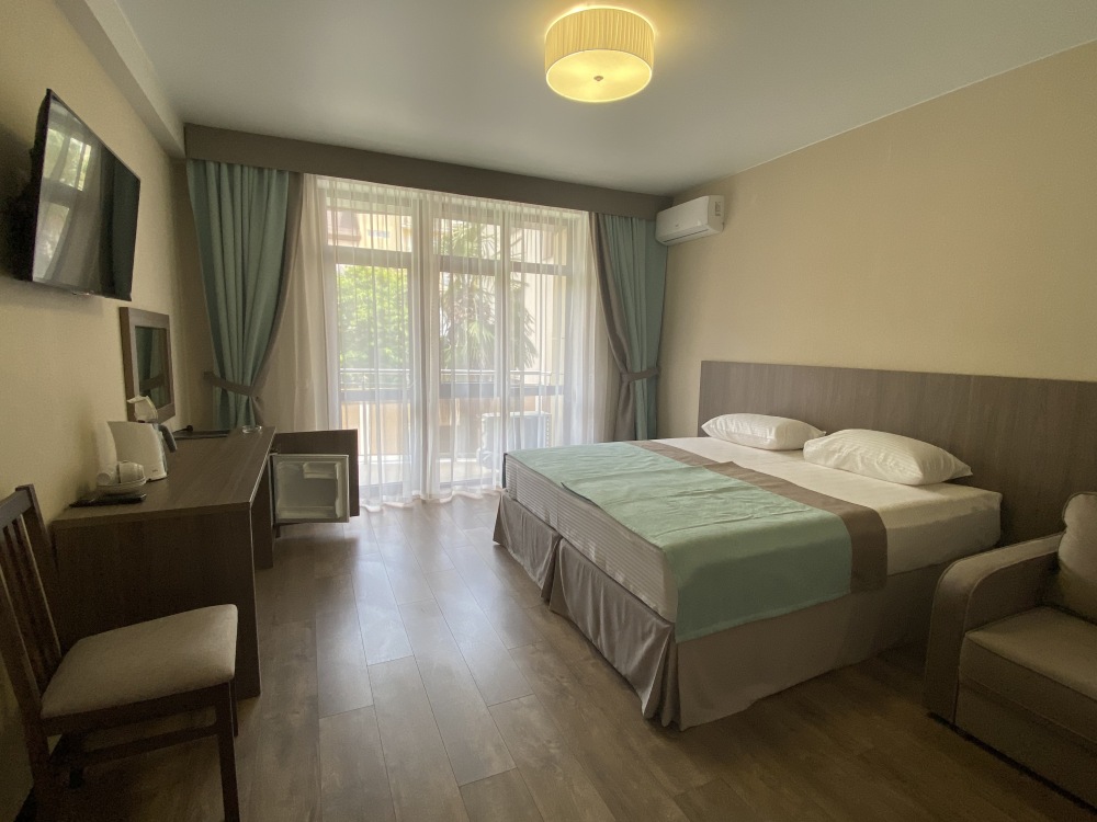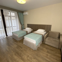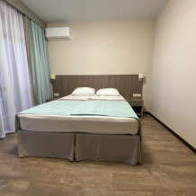 Стандартный трехместный номер со всеми удобствами и балконом с видом на террасу и бассейн. Номер оборудован большой двуспальной кроватью с ортопедическим матрацем, кресло-кроватью, системой климат-контроля, выходом в интернет (Wi-Fi), телевизором с плоским экраном и 20 каналами. В Вашем распоряжении ванная комната с душевой кабиной, феном, комплектом полотенец и косметическим зеркалом. Все, что нужно, для беззаботного отдыха!
