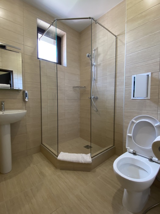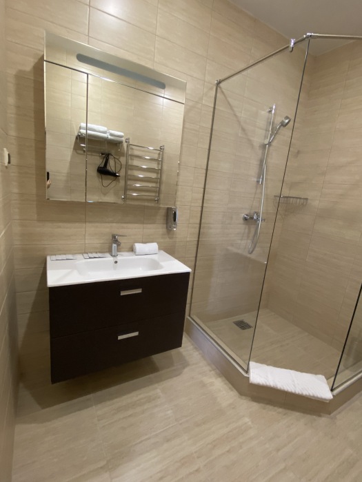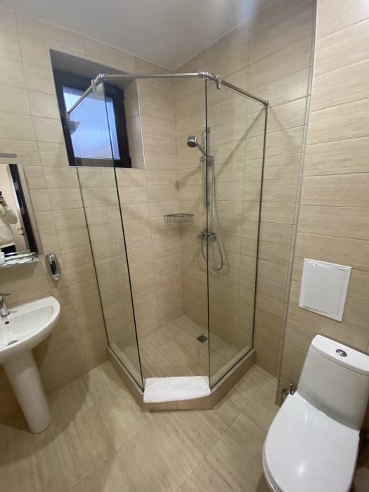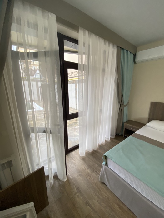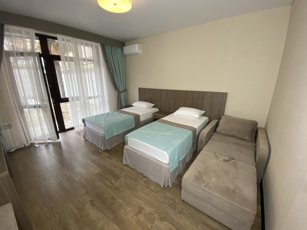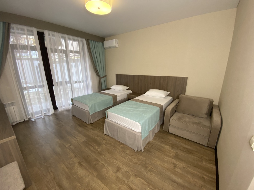 Комфортный трехместный номер на первом этаже с прямым выходом на террасу и бассейн - идеальный вариант для тех, кто не любит много ходить. Номер оборудован большой двуспальной кроватью с ортопедическим матрацем, кресло-кроватью, системой климат-контроля, выходом в интернет (Wi-Fi), телевизором с плоским экраном и 20 каналами. В Вашем распоряжении ванная комната с душевой кабиной, феном, комплектом полотенец и косметическим зеркалом.