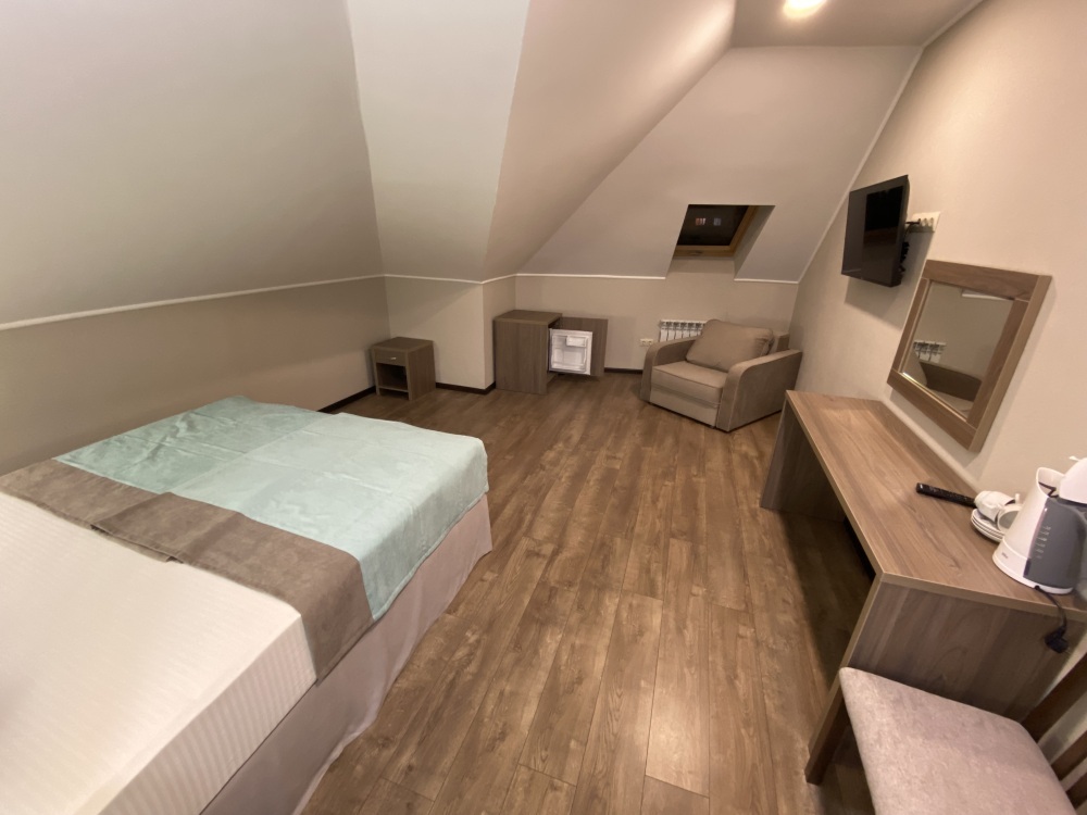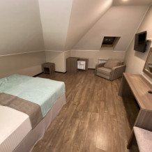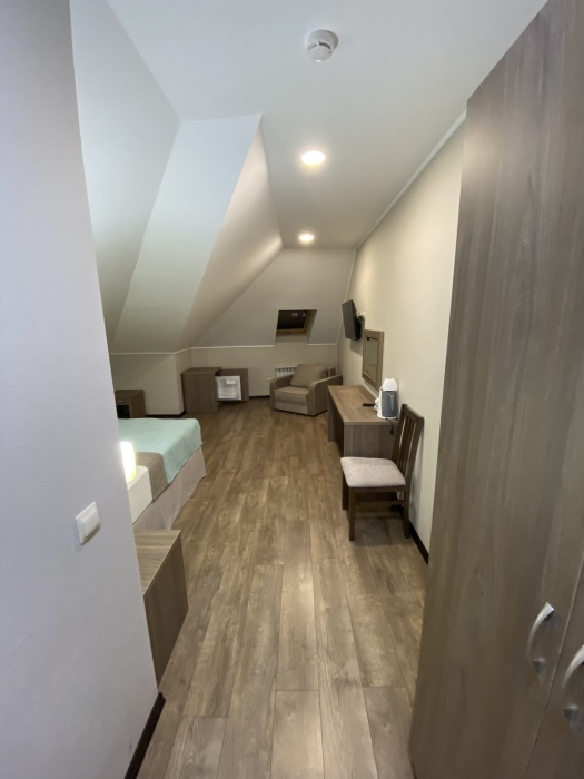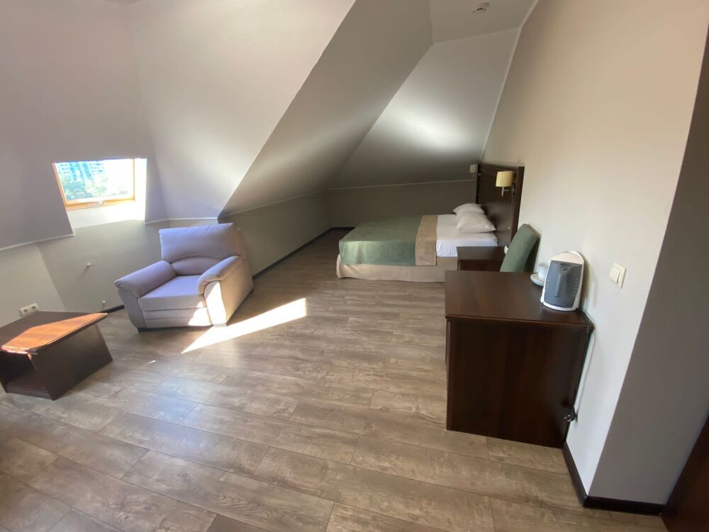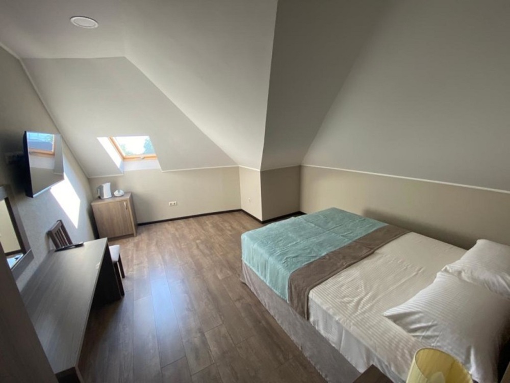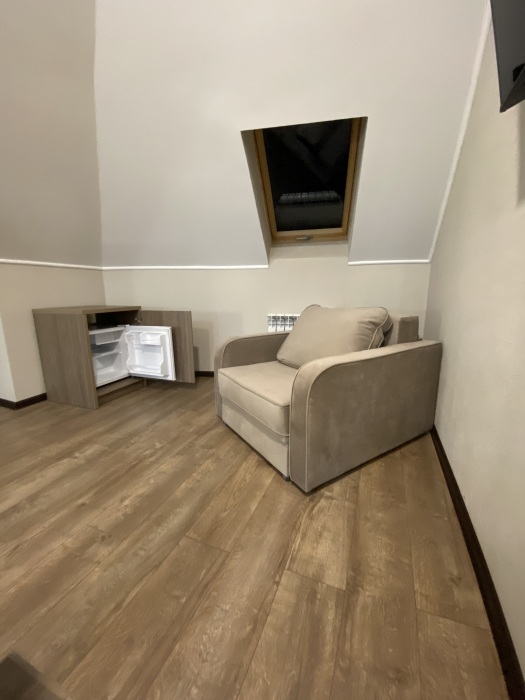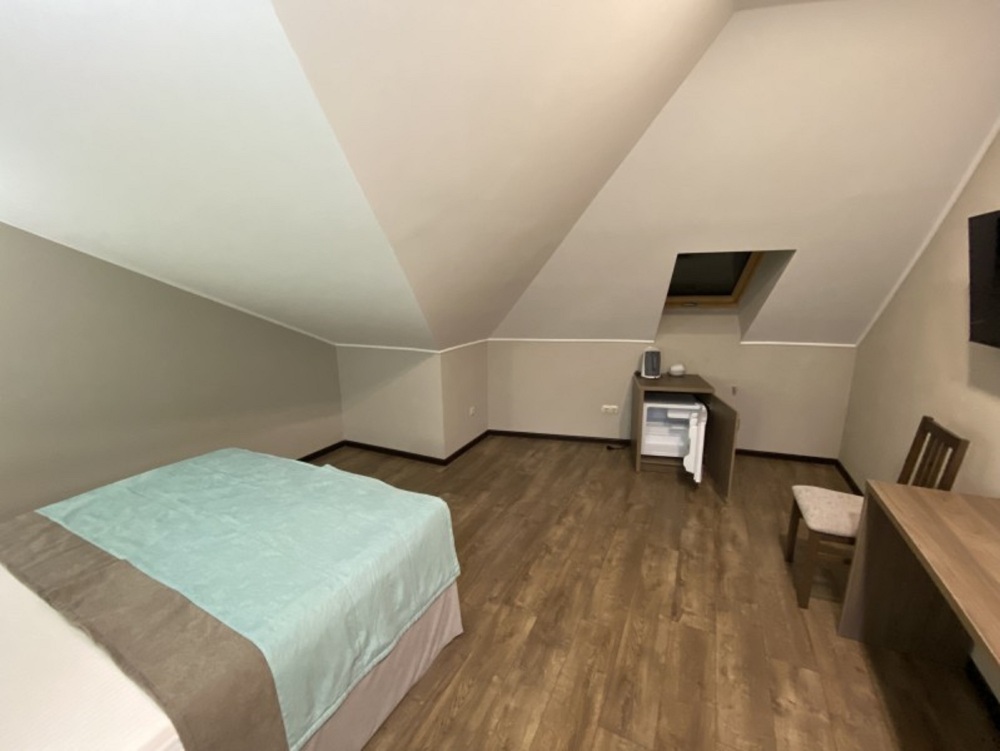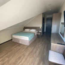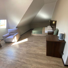 Трехместный экономный люкс - номер на 6 этаже (мансарда) со всеми удобствами, скошенными потолками, без балкона и с окном с видом на небо и на улицу. Номер для некурящих и любящих спорт людей, т. к. в отеле лифта нет. Оборудован системой климат-контроля, выходом в интернет (Wi-Fi), телевизором с плоским экраном и 20 каналами. В Вашем распоряжении большая двуспальная кровать с ортопедическим матрацем, кресло-кровати, двухспальный диван и ванная комната с душевой кабиной, феном, комплектом полотенец и косметическим зеркалом.