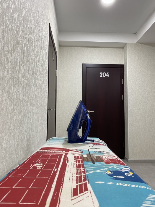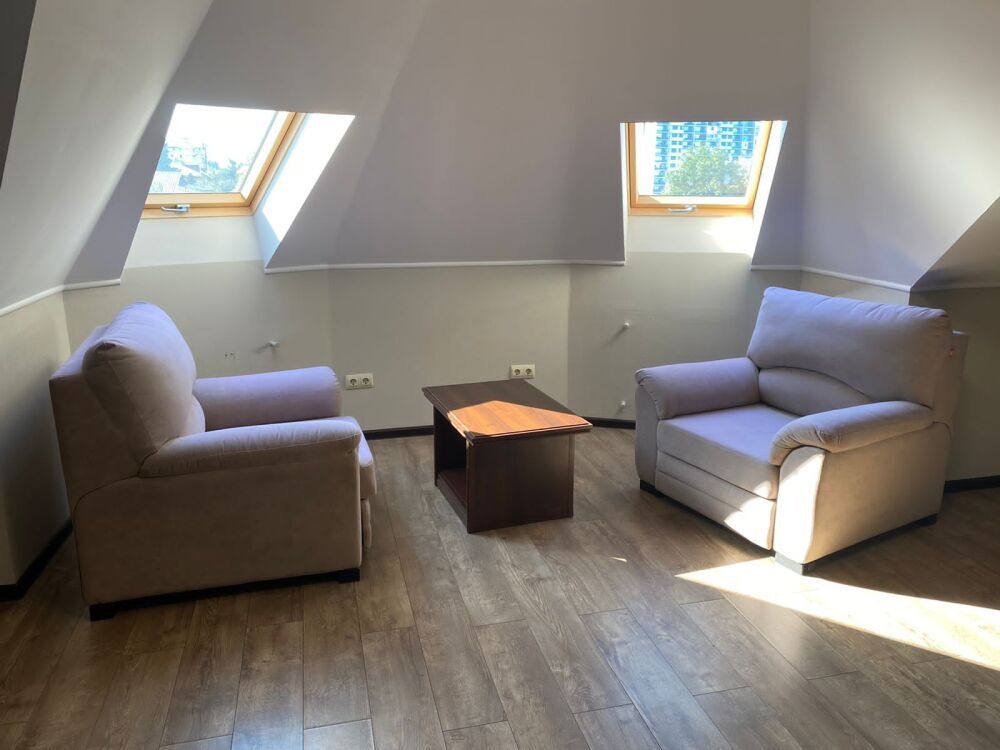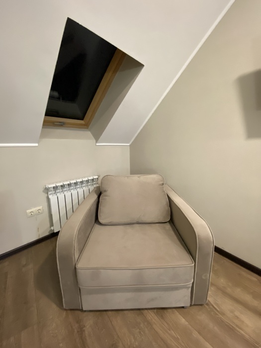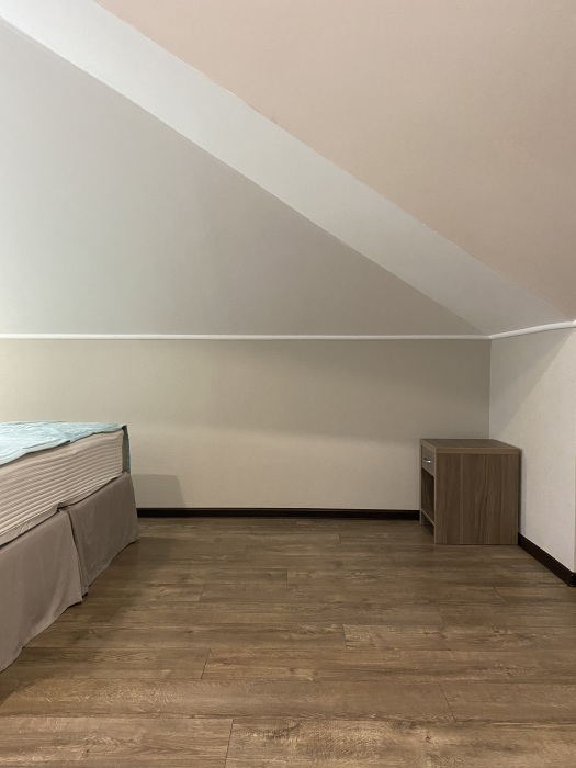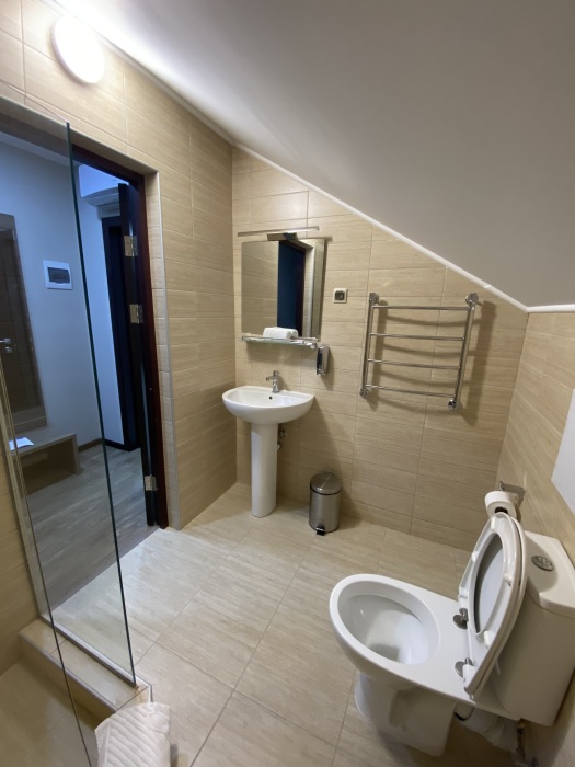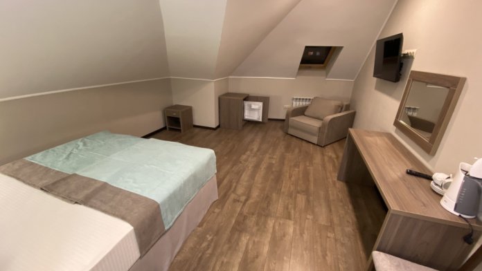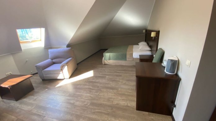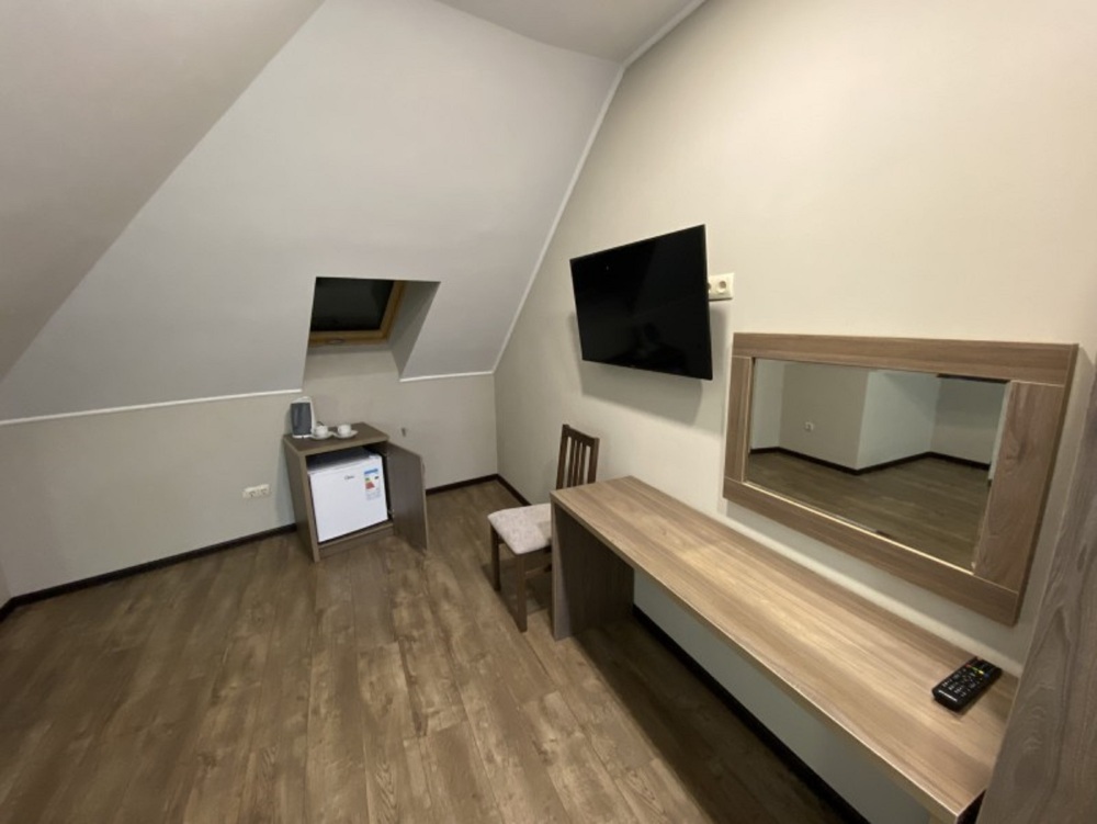 Трехместный экономный люкс - номер на 6 этаже (мансарда) со всеми удобствами, скошенными потолками, без балкона и с окном с видом на небо и на улицу. Номер для некурящих и любящих спорт людей, т. к. в отеле лифта нет. Оборудован системой климат-контроля, выходом в интернет (Wi-Fi), телевизором с плоским экраном и 20 каналами. В Вашем распоряжении большая двуспальная кровать с ортопедическим матрацем, кресло-кровати, двухспальный диван и ванная комната с душевой кабиной, феном, комплектом полотенец и косметическим зеркалом.