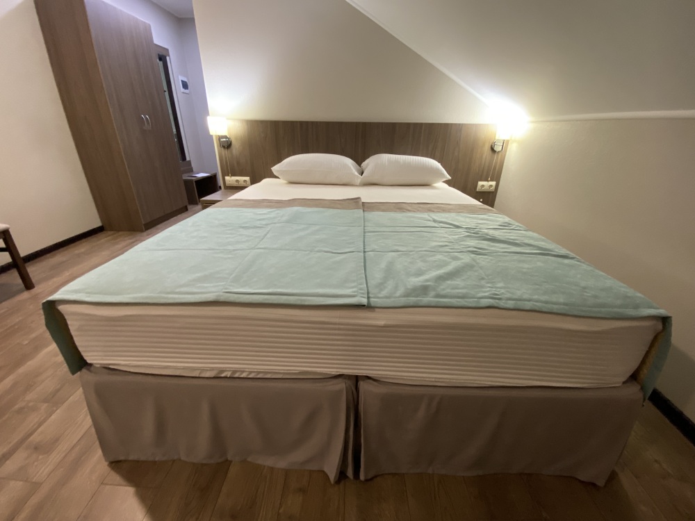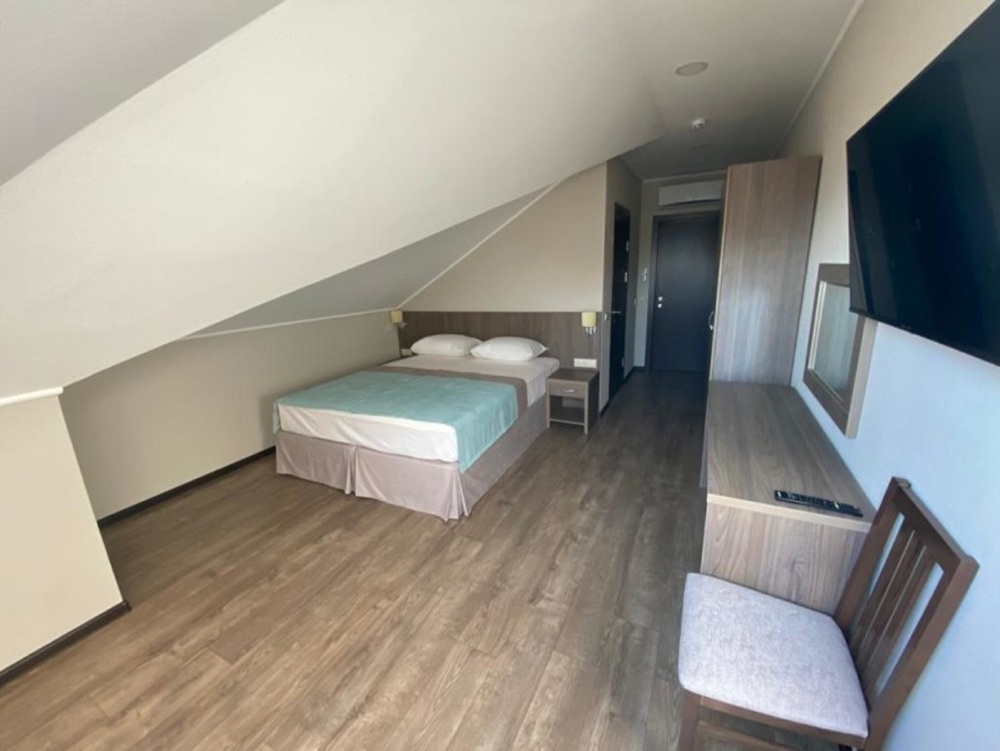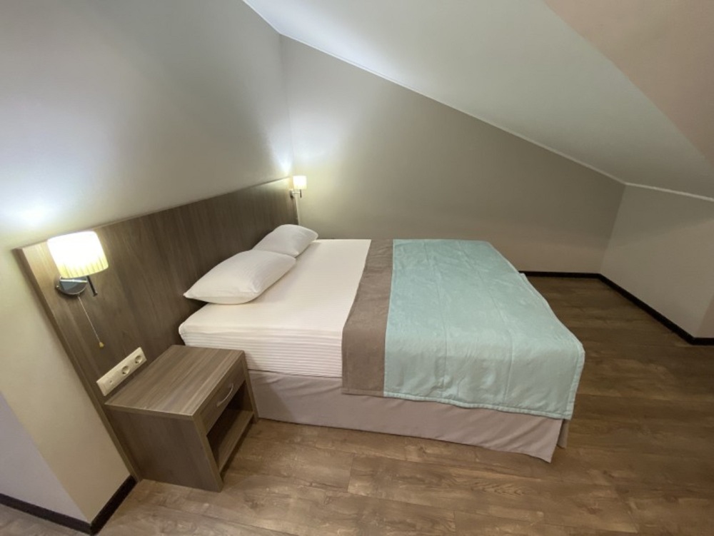 Двухместный номер на 6 этаже (мансарда) со всеми удобствами, скошенными потолками, без балкона и с окном с видом на небо и на море. Номер для некурящих и любящих спорт людей, т. к. в отеле лифта нет. Оборудован системой климат-контроля, выходом в интернет (Wi-Fi), телевизором с плоским экраном и 20 каналами. В Вашем распоряжении большая двуспальная кровать с ортопедическим матрацем и ванная комната с душевой кабиной, феном, комплектом полотенец и косметическим зеркалом.
