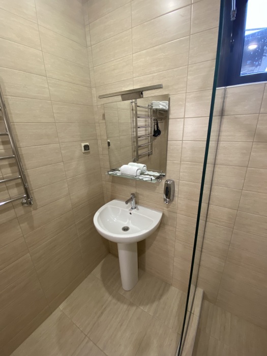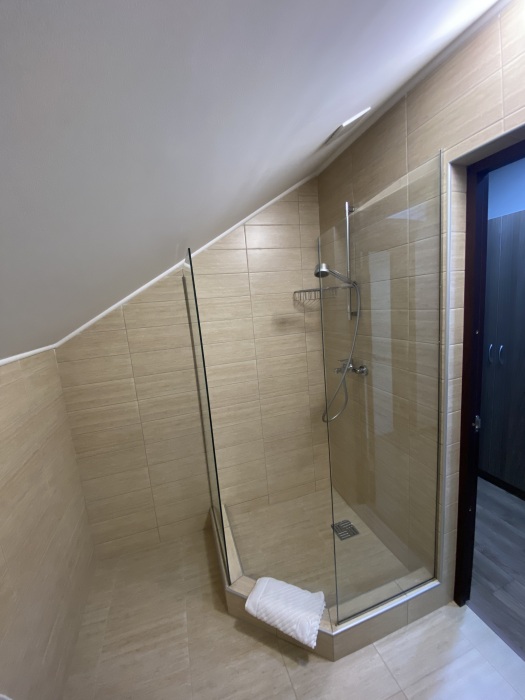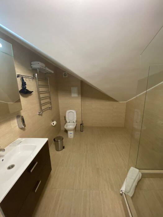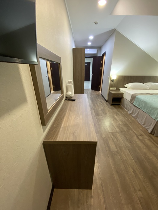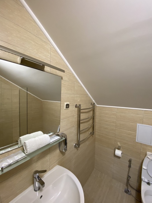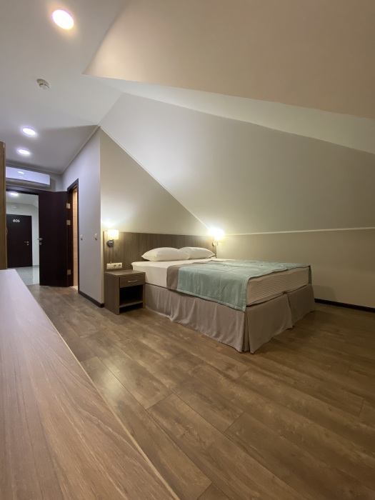 Трехместный номер на 6 этаже (мансарда) со всеми удобствами, скошенными потолками, без балкона и с окном с видом на небо и на улицу. Номер для некурящих и любящих спорт людей, т. к. в отеле лифта нет. Оборудован системой климат-контроля, выходом в интернет (Wi-Fi), телевизором с плоским экраном и 20 каналами. В Вашем распоряжении большая двуспальная кровать с ортопедическим матрацем, кресло-кровать и ванная комната с душевой кабиной, феном, комплектом полотенец и косметическим зеркалом.