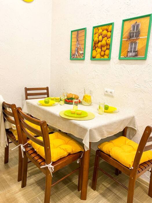 3. Квартира упакована всем необходимым для комфортного отдыха, есть стиральная машинка, в каждой комнате по телевизору, кондиционеры как в комнатах, так и на балконе. Кухня просторная, вмещает одновременно до 6 человек (4 стула и 2 табурета).