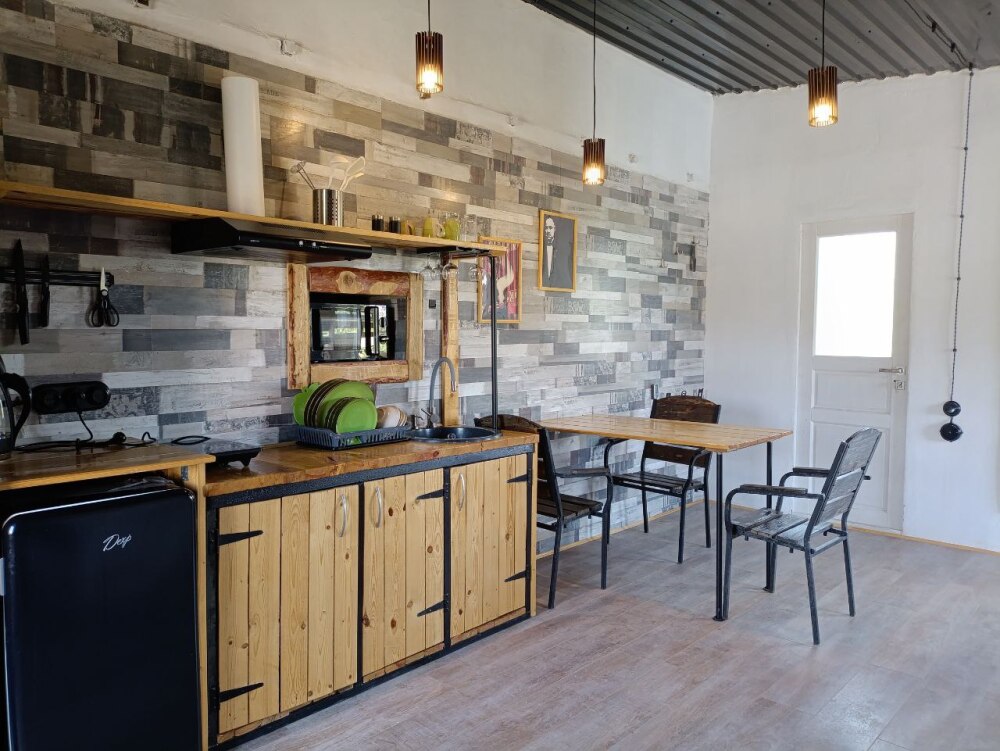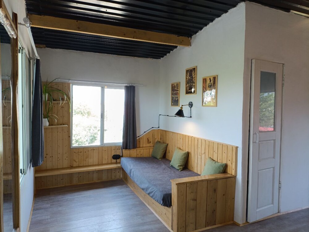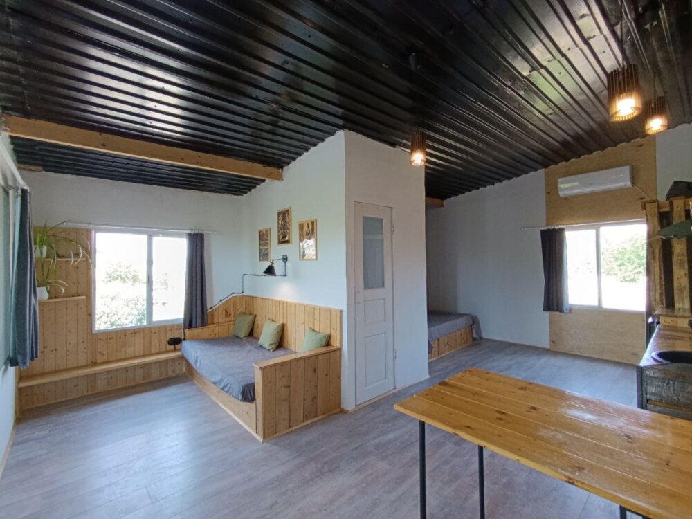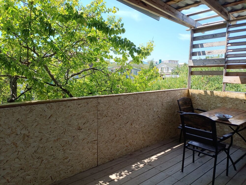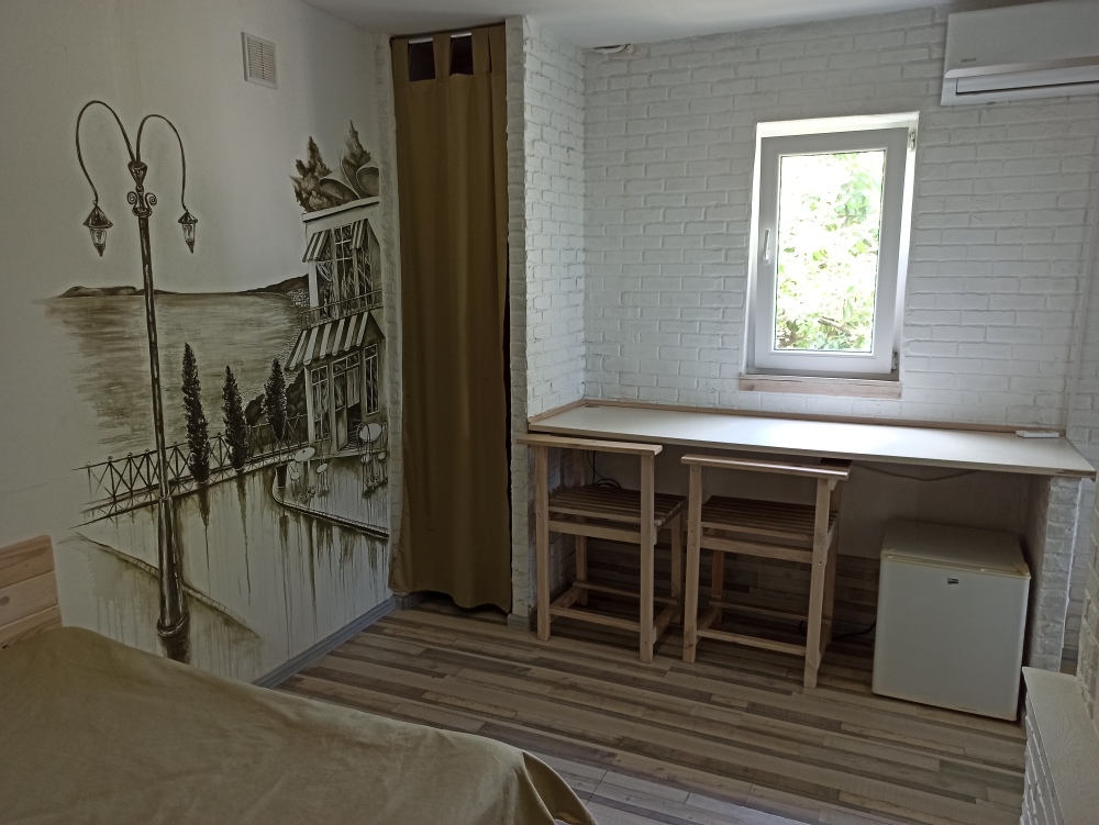 Комната-студия с двуспальной и односпальной кроватями, санузлом (туалет, душ), кухней и террасой, кондиционером. Зона кухни оборудована холодильником, мойкой, плитой, свч-печью, чайником, вытяжкой, столом для приготовления и приёма пищи; имеется вся необходимая посуда. Три раздвижных окна с видом на сад, улицу и террасу. С террасы открывается живописный вид на рядом растущее дерево (сливу) и на близлежащие сады; на террасе есть стол со стульями. Комната с высокими потолками, выполнена в ретро-стиле с натуральным деревом в интерьере. По договорённости возможно проживание с животными.