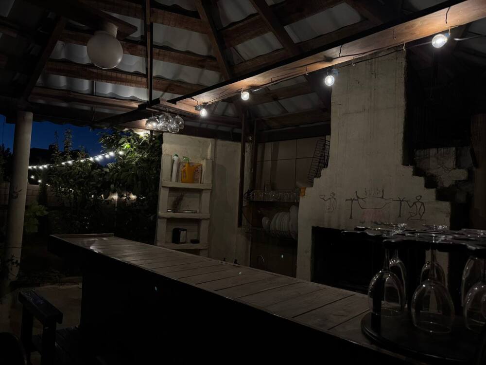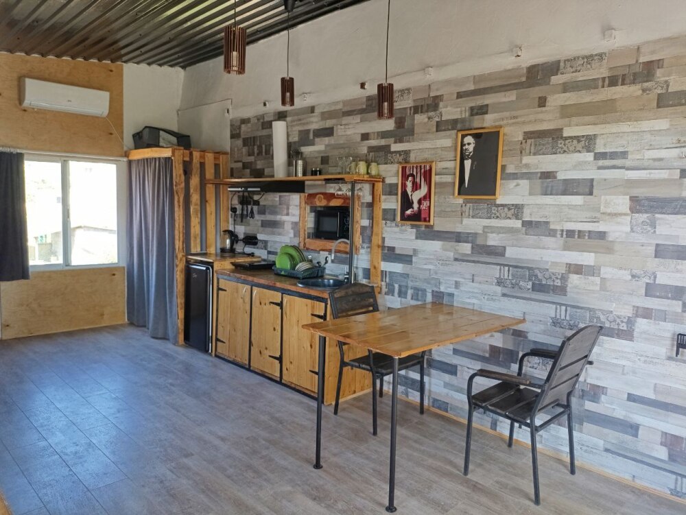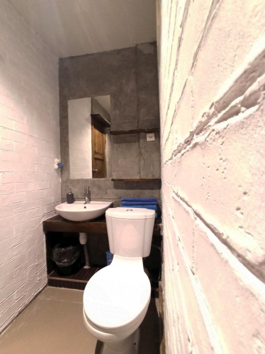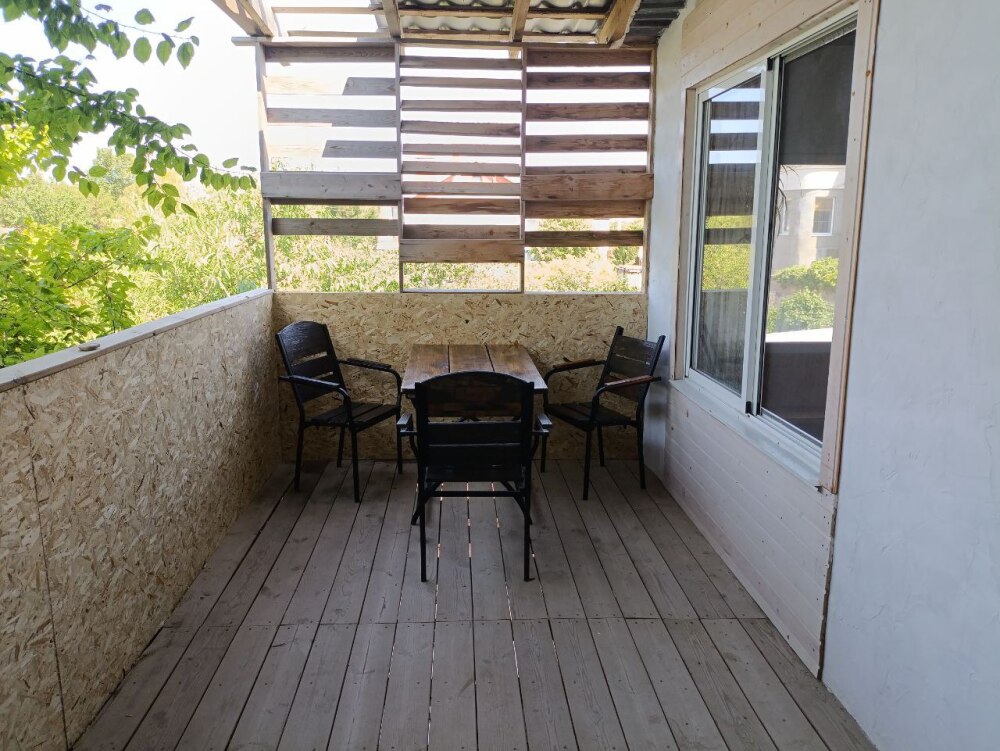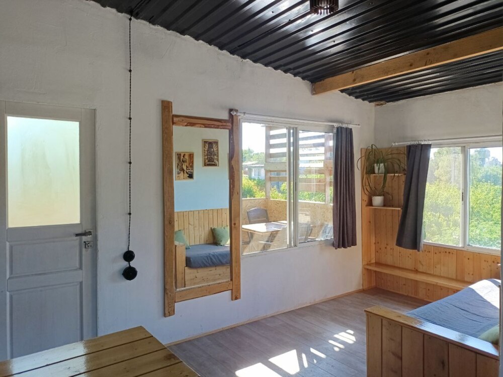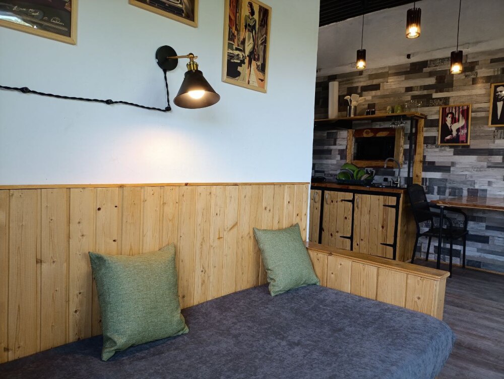 Комната-студия с двуспальной и односпальной кроватями, санузлом (туалет, душ), кухней и террасой, кондиционером. Зона кухни оборудована холодильником, мойкой, плитой, свч-печью, чайником, вытяжкой, столом для приготовления и приёма пищи; имеется вся необходимая посуда. Три раздвижных окна с видом на сад, улицу и террасу. С террасы открывается живописный вид на рядом растущее дерево (сливу) и на близлежащие сады; на террасе есть стол со стульями. Комната с высокими потолками, выполнена в ретро-стиле с натуральным деревом в интерьере. По договорённости возможно проживание с животными.