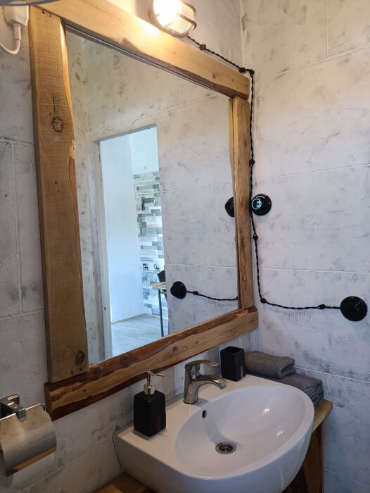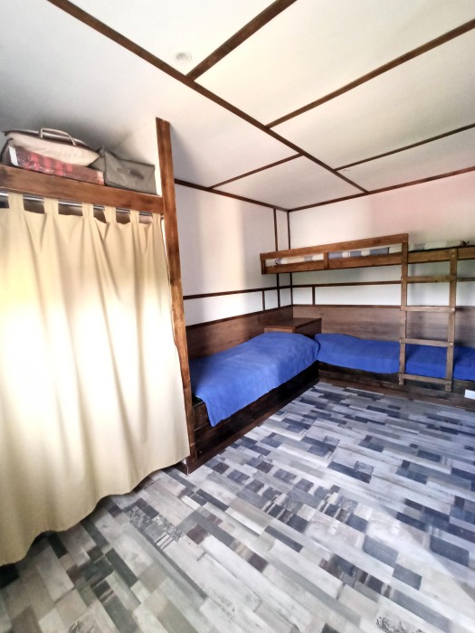Номер с тремя односпальными кроватями из дерева, одна из которых во втором ярусе.