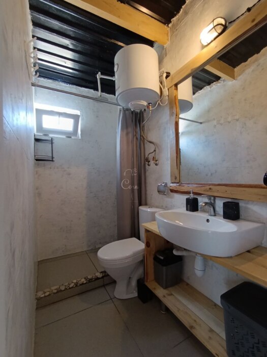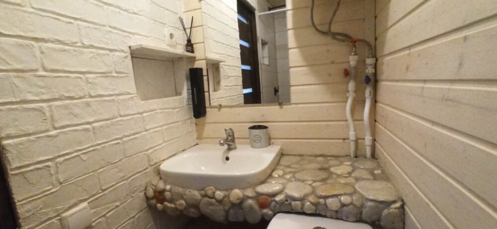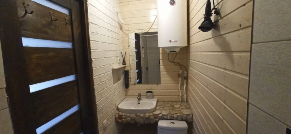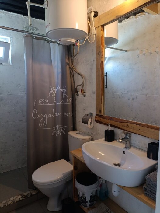 Санузел с унитазом, умывальником, душем; горячая вода (бойлер).
