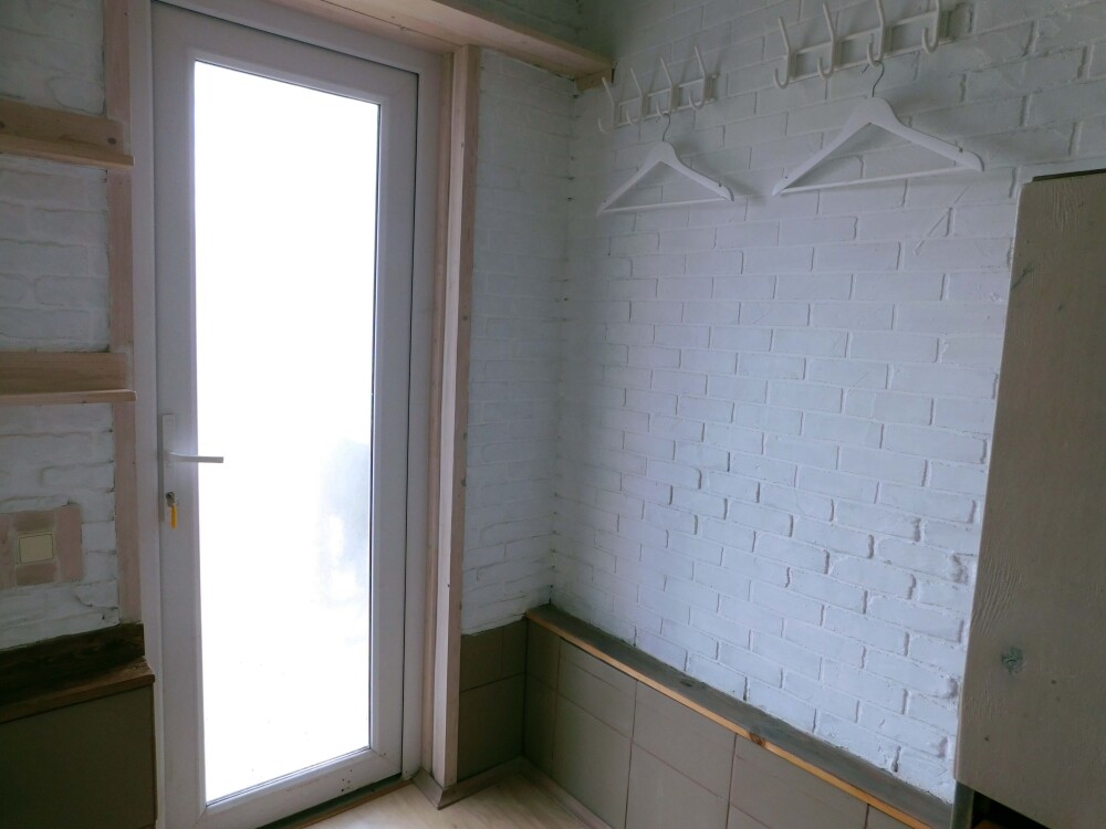 Отдельная проходная комната с холодильником, шкафом, столом и тремя стульями.
