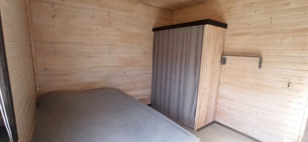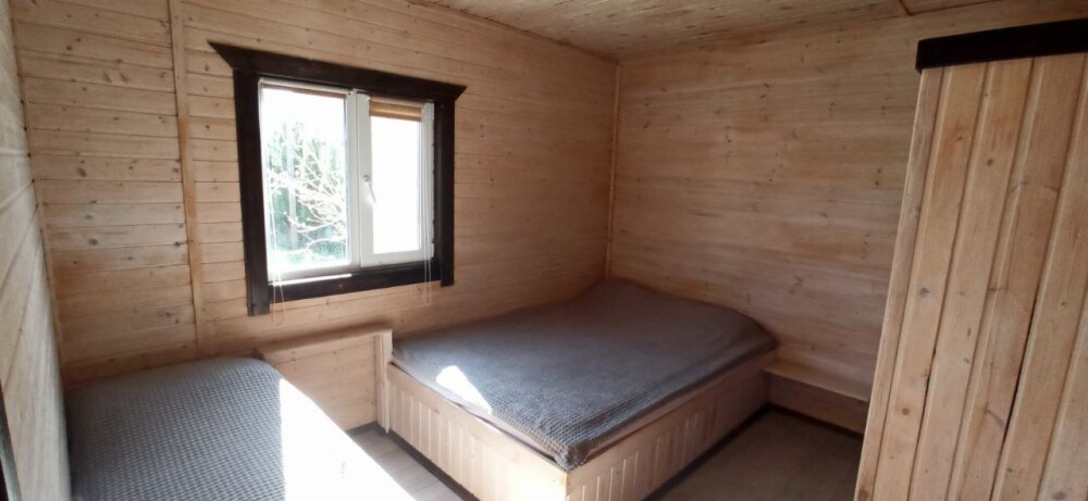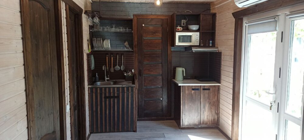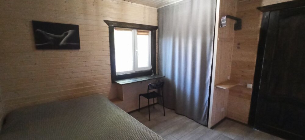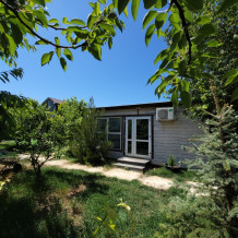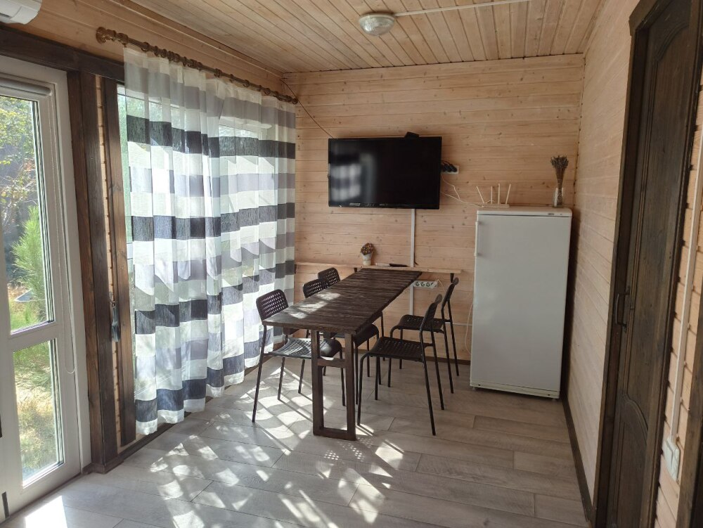 Отдельно стоящий гостевой дом (флигель) с двумя спальнями, общей комнатой с кухней и столовой. Кухня оборудована мойкой, плитой, свч-печью, имеется вся необходимая посуда. Дом деревянный, стены и потолок отделаны вагонкой. В каждой спальне большой шкаф. Гостиная с панорамным окном.