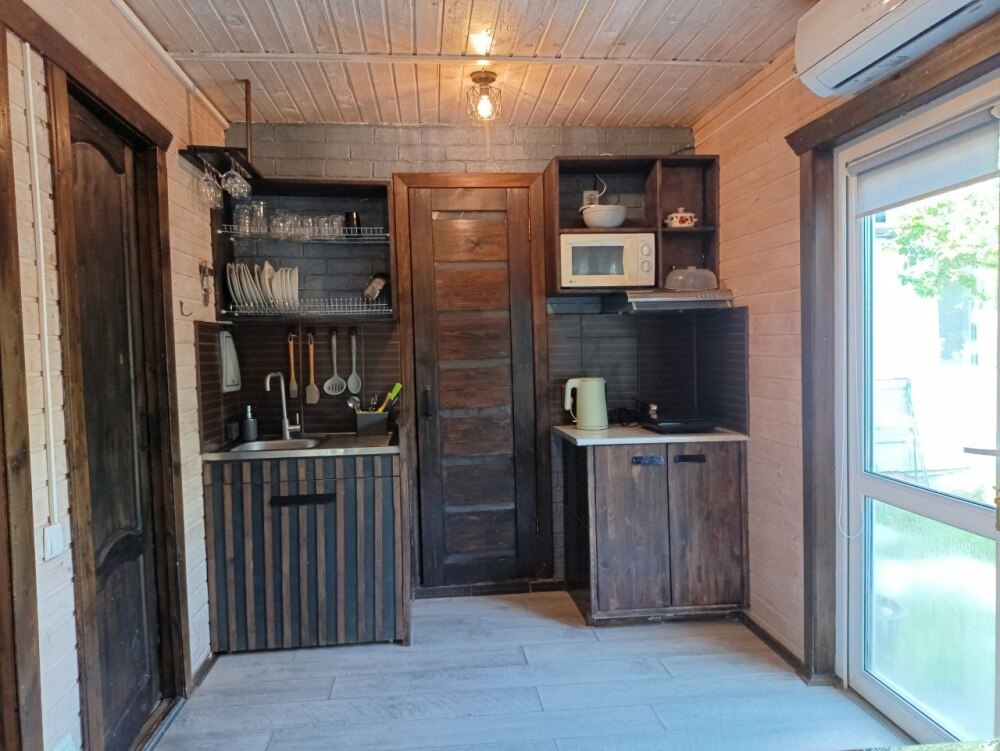 Отдельная кухня в гостевом доме на 4 комнаты. На территории: 1) большая беседка с летней кухней (мангал-барбекю, газовая плита, мойка, столы, посуда, барная стойка, музыкальный центр); 2) очаг-кострище с креслами и столом; 3) беседка с мангалом, столом и стульями; 4) площадка с искусственной травой и креслами-мешками; 5)просторный двор с плодовыми и хвойными деревьями.