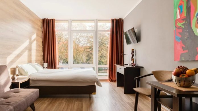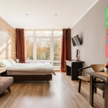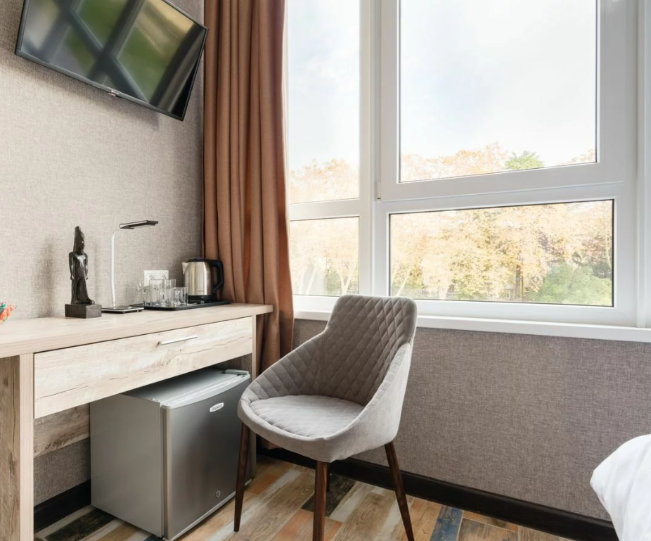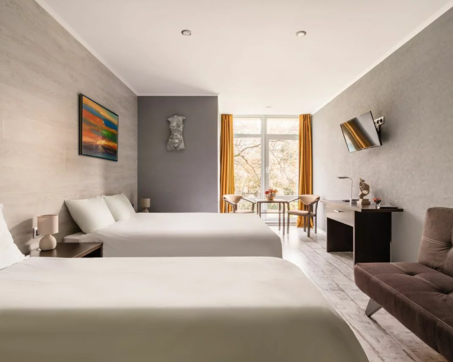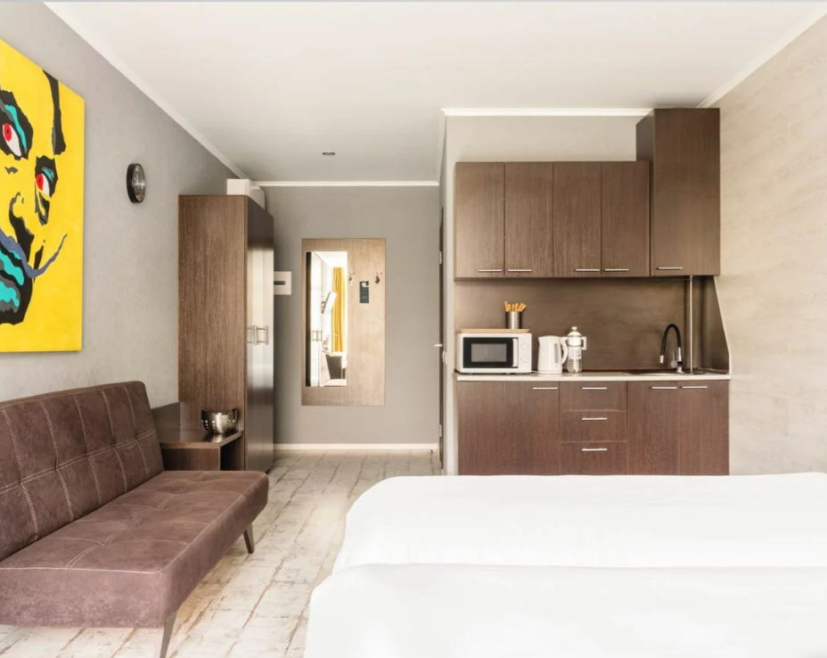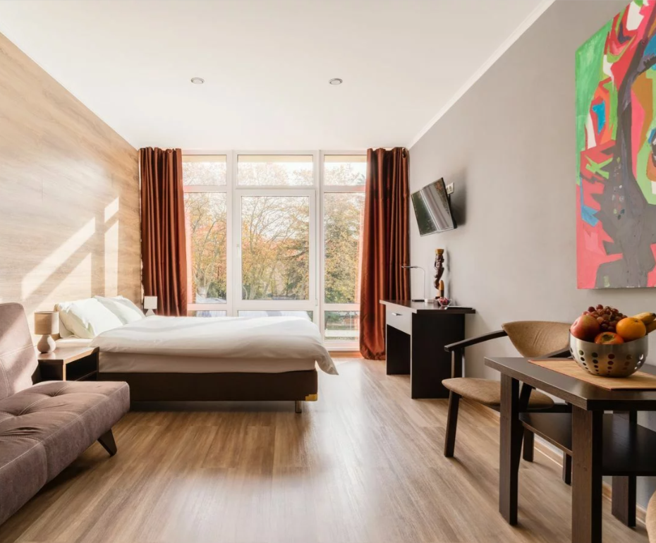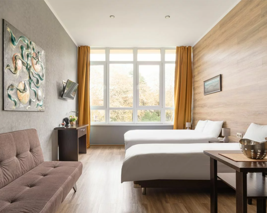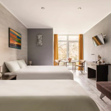 Номера отеля имеют современный дизайн и украшены картинами, скульптурами современных художников. Мы постарались сделать все и для Вашего комфорта, укомплектовав комнаты сейфами, стиральными машинами, гладильными принадлежностями, мини-кухнями, сушилками и прочим необходимым оборудованием. Мы готовы предоставить Вам номера и апартаменты класса люкс, оборудованные всем необходимым для комфортного проживания. У нас есть и семейные номера, и номера для 1-2 гостей.