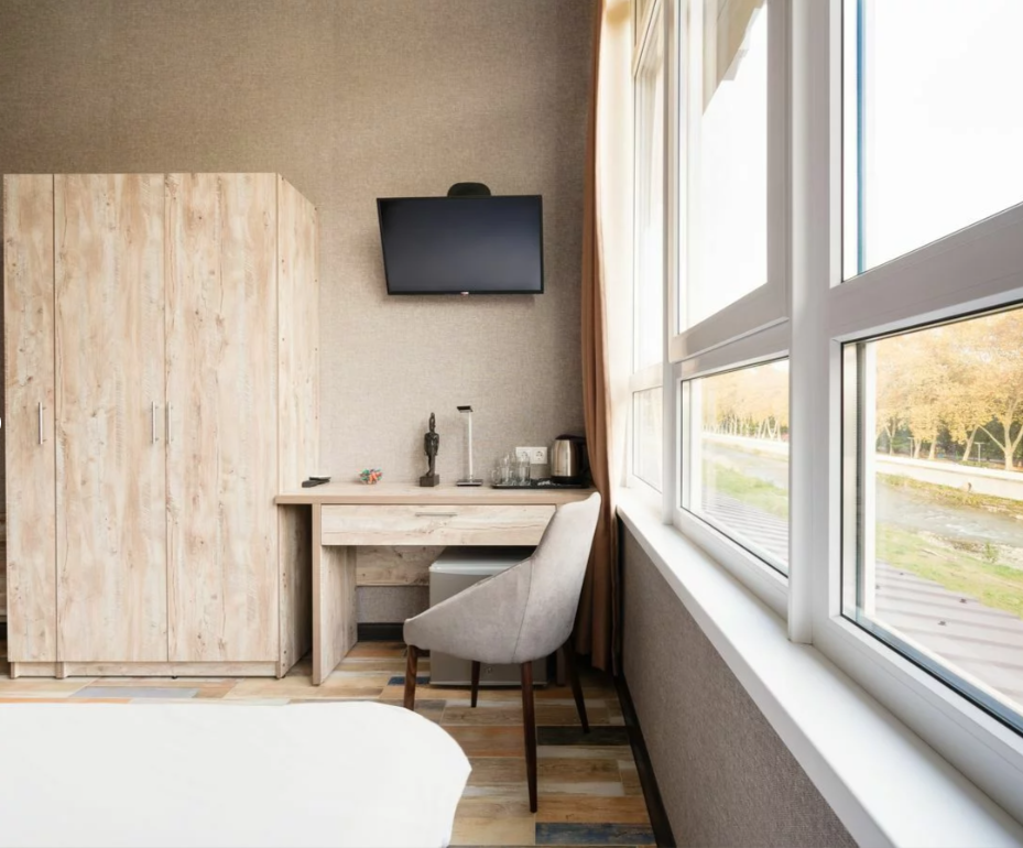 Каждый номер оборудован гладильной доской и утюгом, микроволновой печью, индукционной плитой, всей необходимой посудой, и т. д.