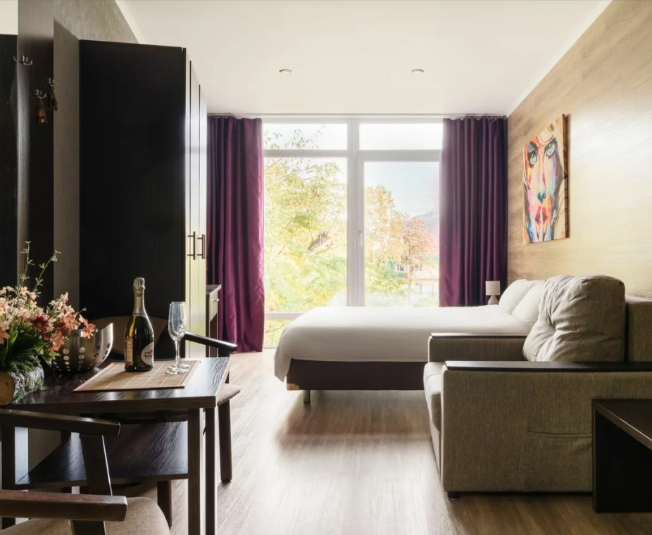 В номере имеется одна двуспальная кровать King size (по желанию может заменяться на две односпальные), одна одноместная кровать и диван-кровать (трансформируется в спальное место). Максимальная вместимость до 4 человек.
