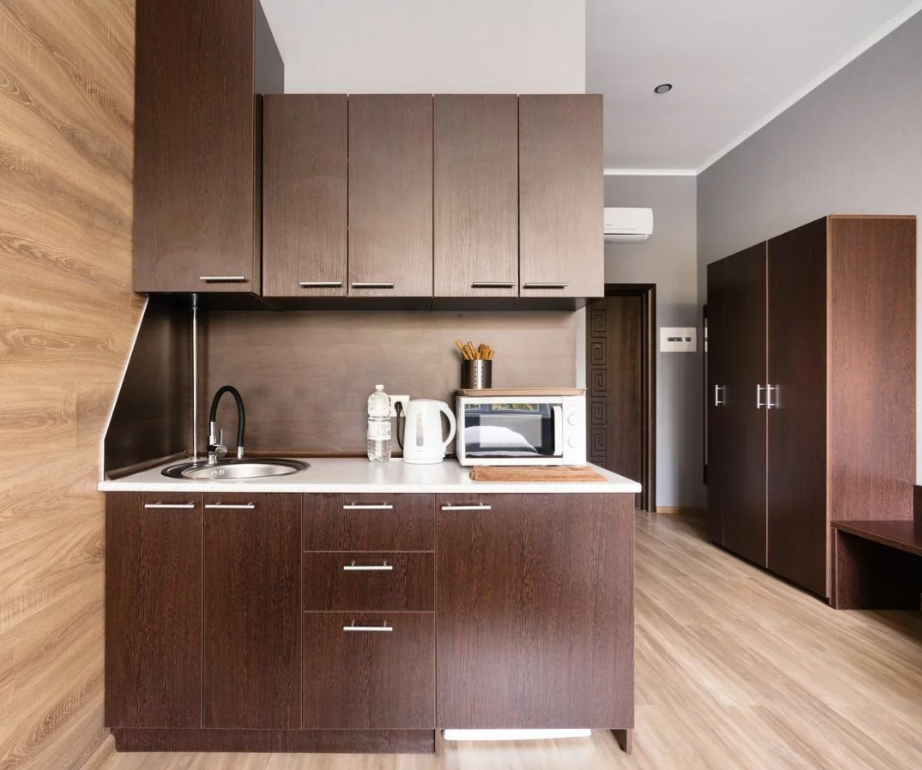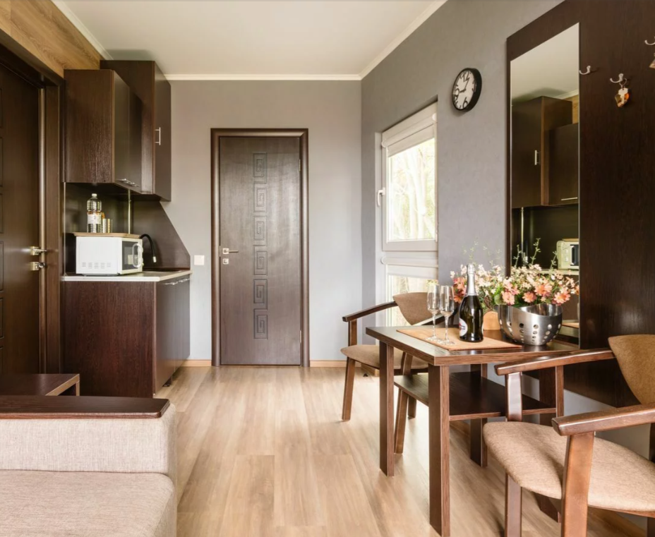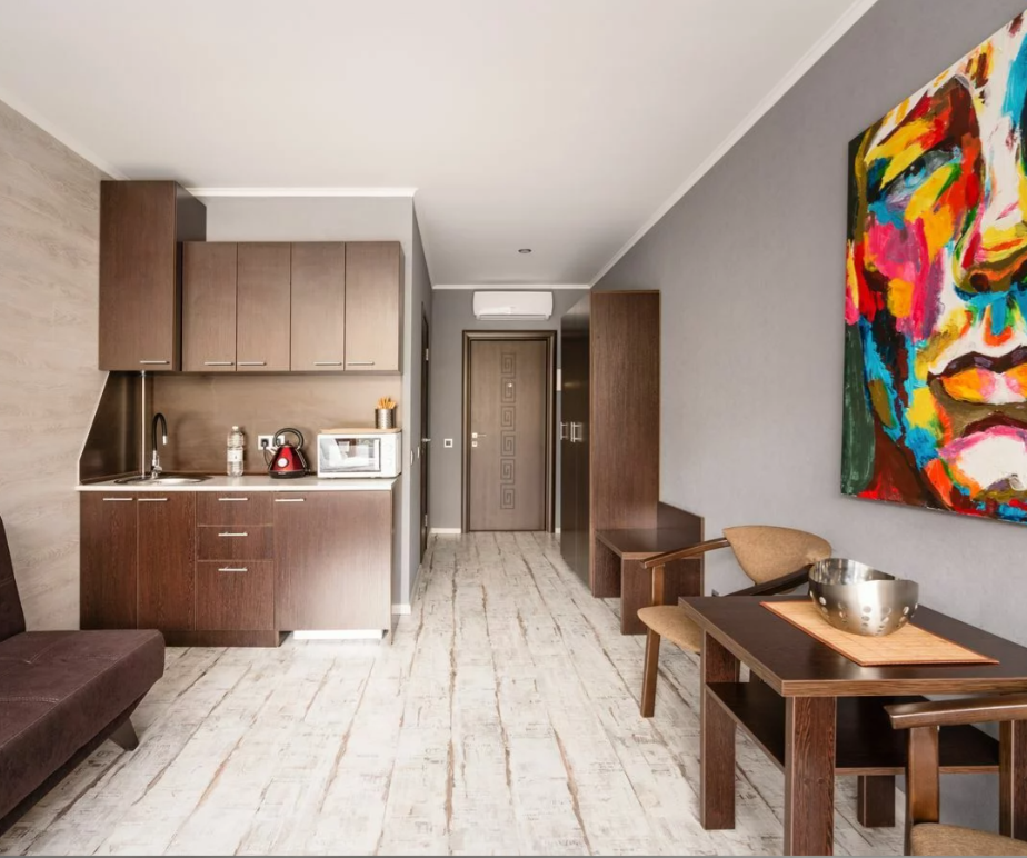 Номер оборудован гладильной доской и утюгом, мини-кухней с микроволновой печью, индукционной плитой, всей необходимой посудой, и т. д.