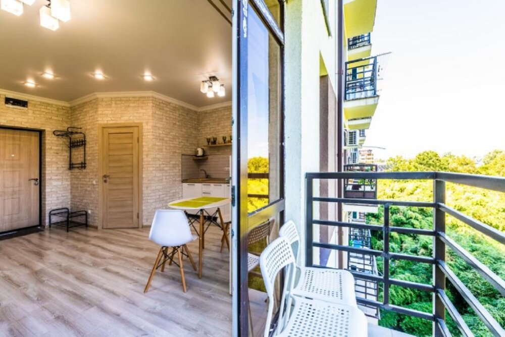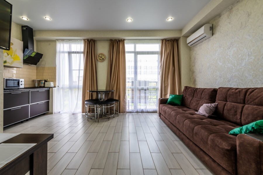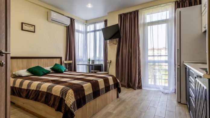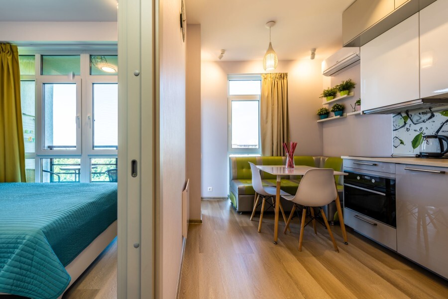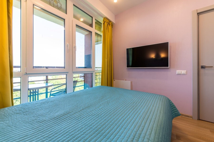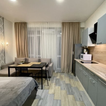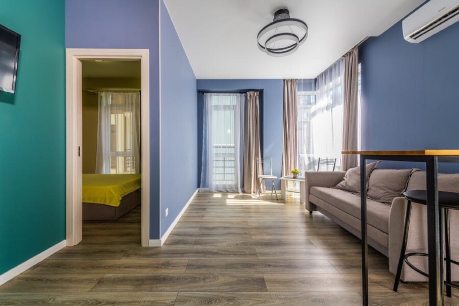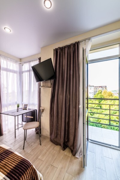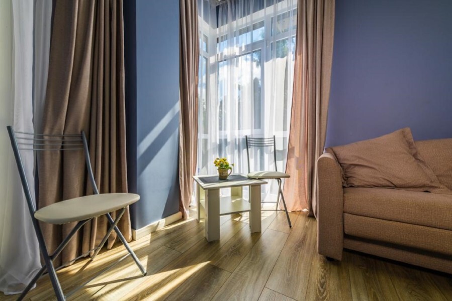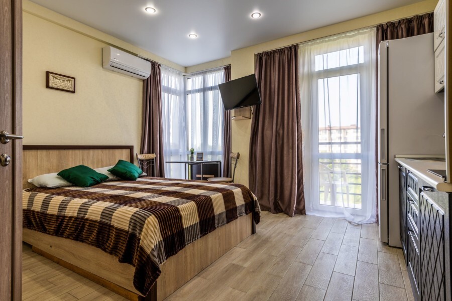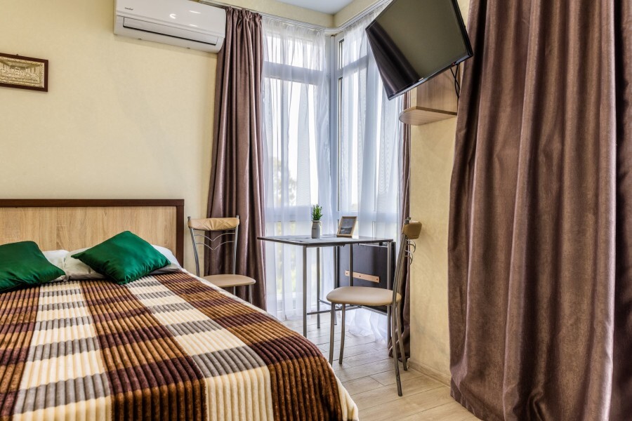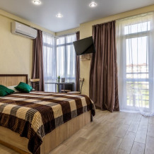 Современное десятиэтажное здание отеля, оснащенное лифтом, разместилось в курортной зоне «Сириус». В распоряжении гостей комфортабельные Апартаменты, оснащенные кухней и собственной ванной комнатой. В номерах стильный лаконичный интерьер, есть вся необходимая техника. Помимо кухонной техники, в апартаментах есть плазменный телевизор, фен, кондиционер и стиральная машина. Некоторые номера оборудованы балконами, откуда открываются красивые виды на море.