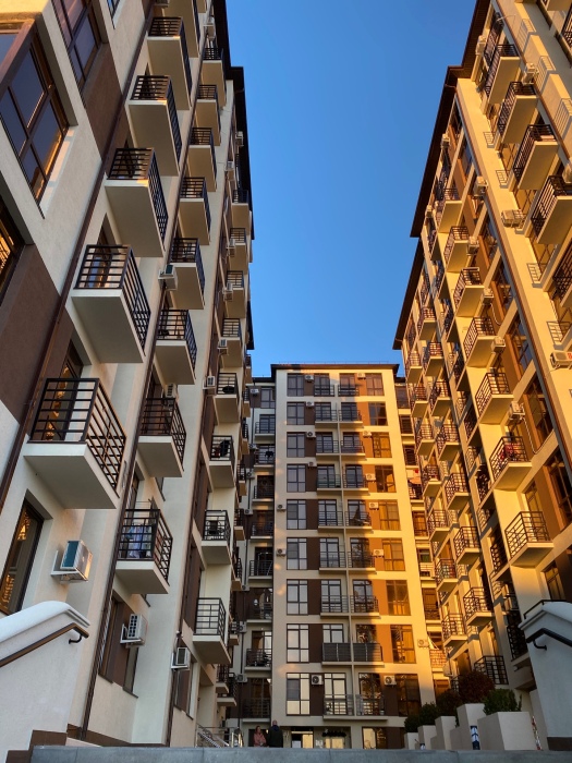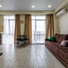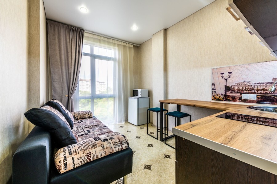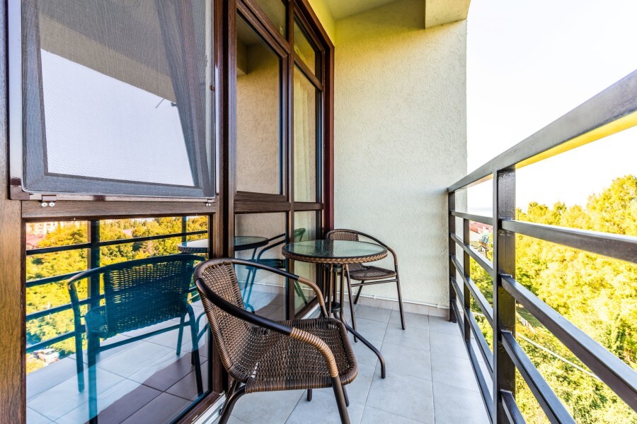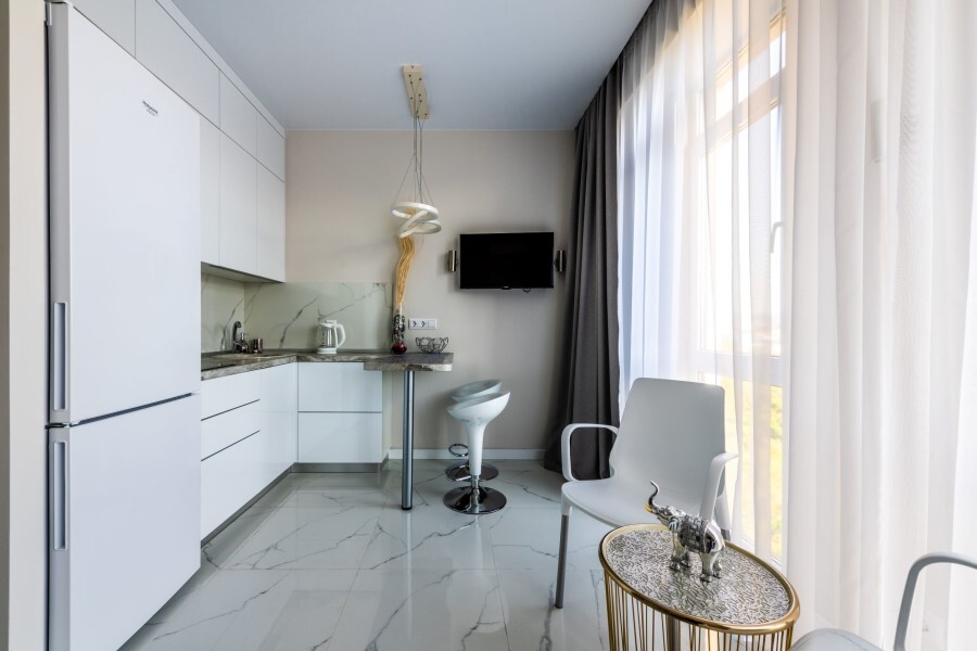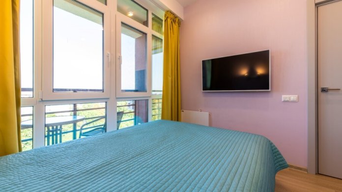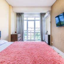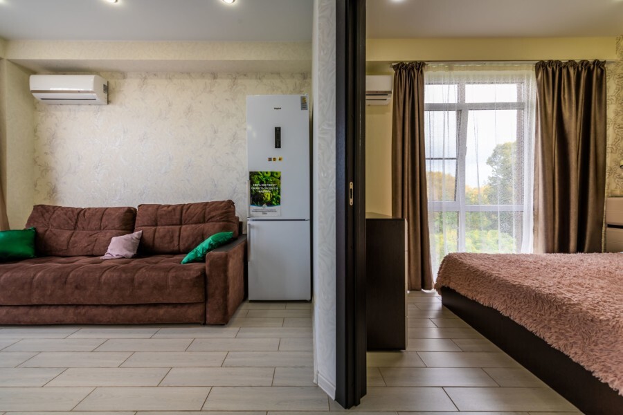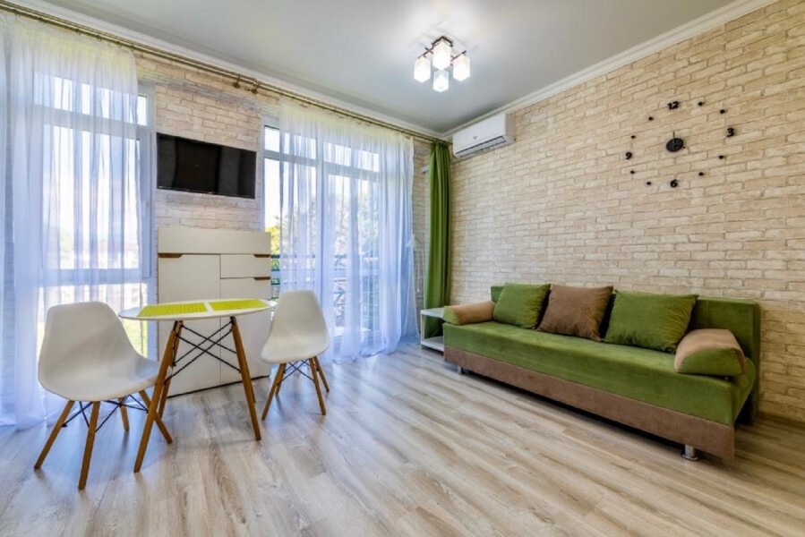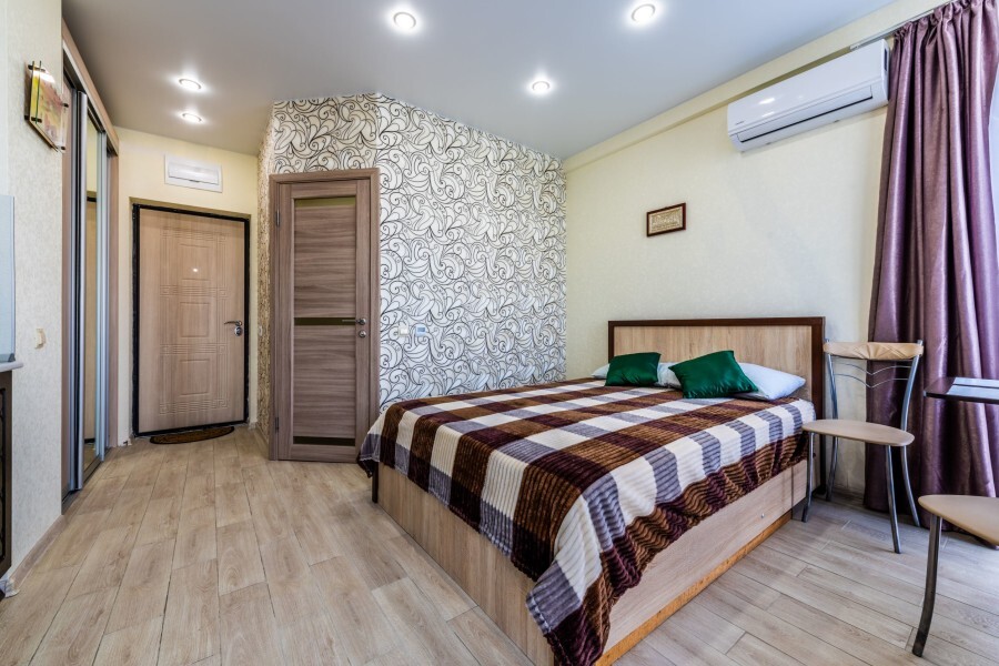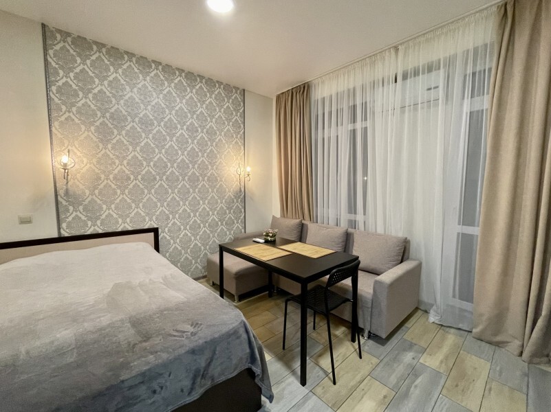 Современное десятиэтажное здание отеля, оснащенное лифтом, разместилось в курортной зоне «Сириус». В распоряжении гостей комфортабельные Апартаменты, оснащенные кухней и собственной ванной комнатой. В номерах стильный лаконичный интерьер, есть вся необходимая техника. Помимо кухонной техники, в апартаментах есть плазменный телевизор, фен, кондиционер и стиральная машина. Некоторые номера оборудованы балконами, откуда открываются красивые виды на море.
