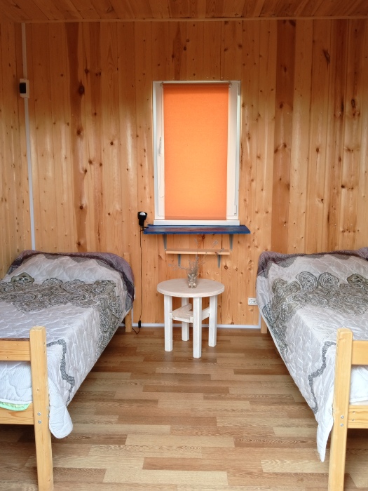 Номер с 4 двухспальными кроватями. У номера отдельный вход, на участке есть зоны для отдыха со столами и стульями, беседка, мангальная зона, гамак. В номере гостям предоставляется новое постельное белье, хорошие матрасы, полотенца. В номере есть место для размещения багажа, полки для вещей. Души с горячей водой и туалеты расположены в отдельностоящем помещении.