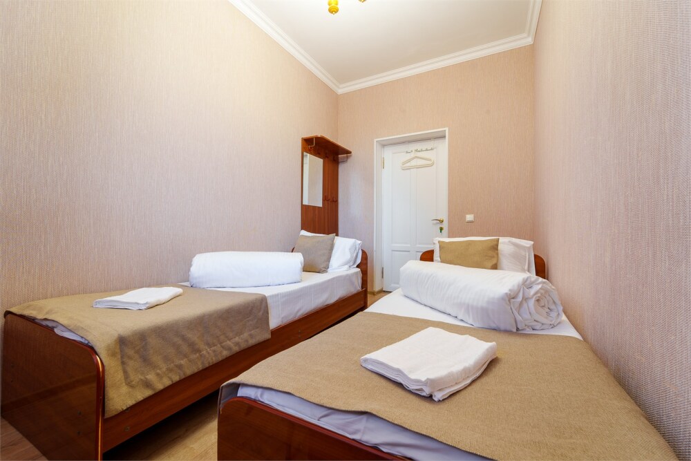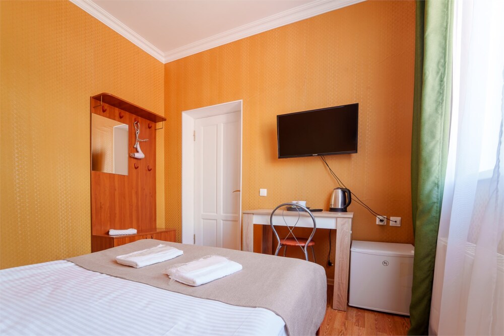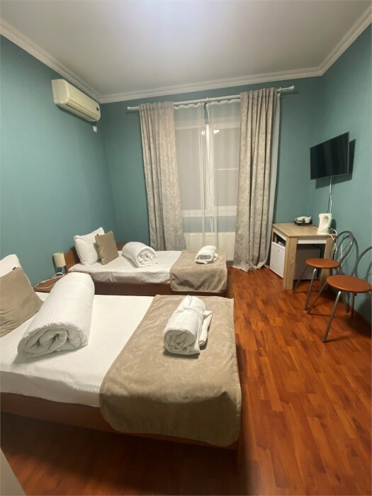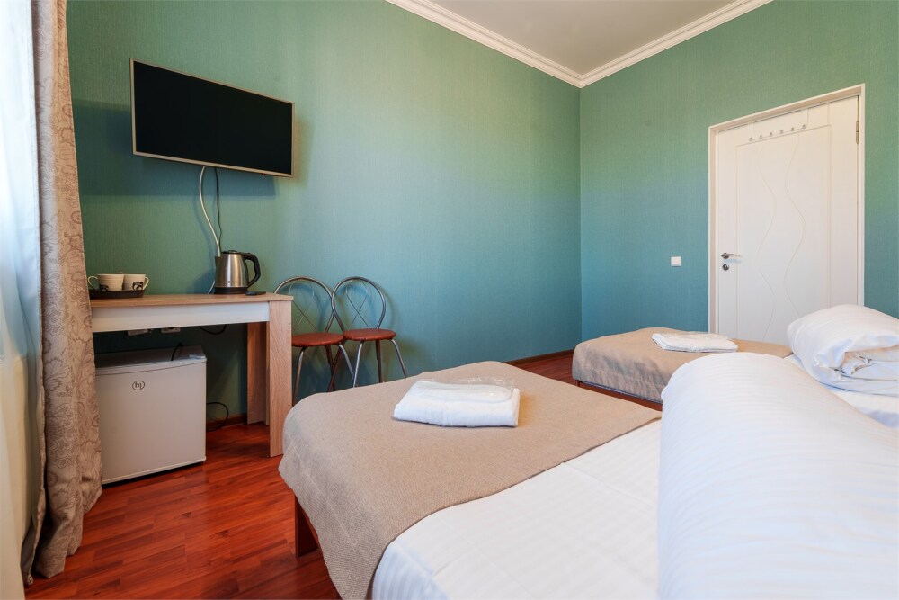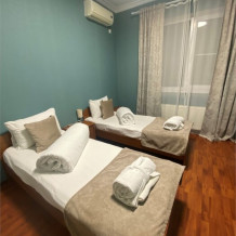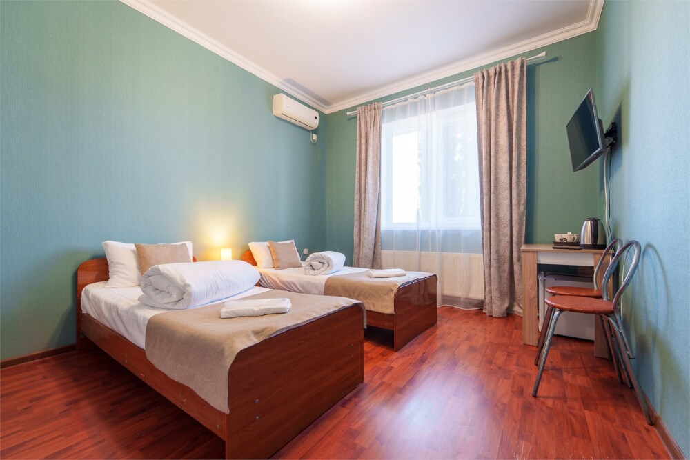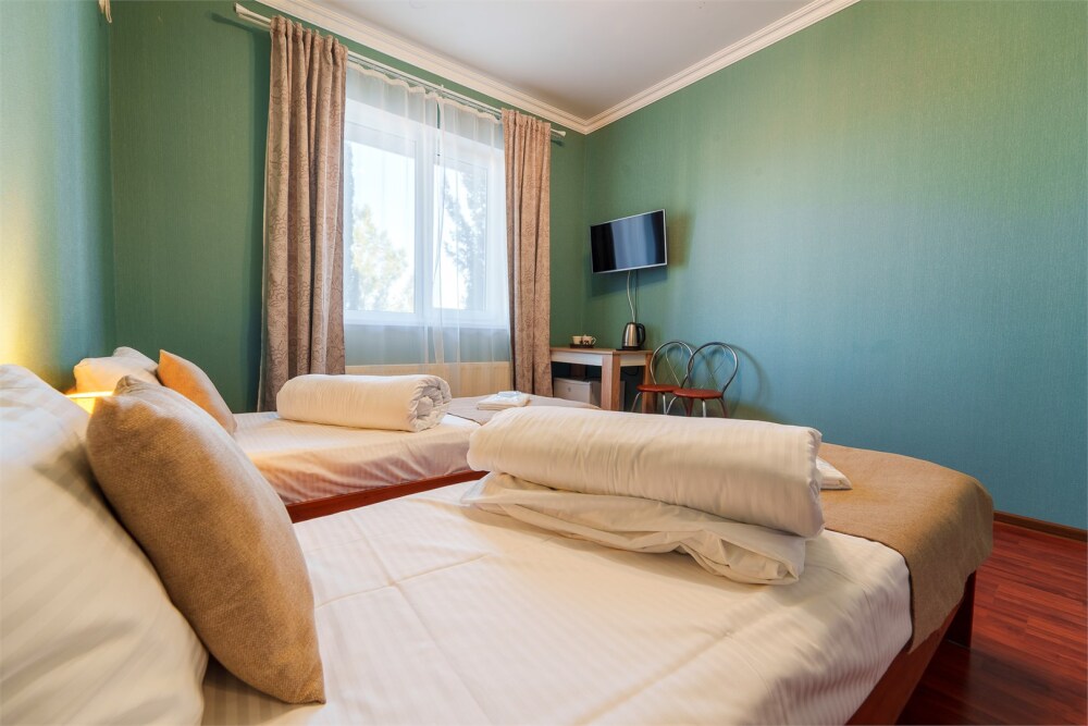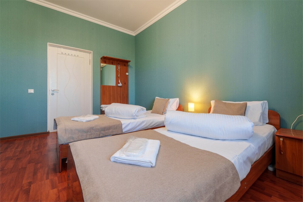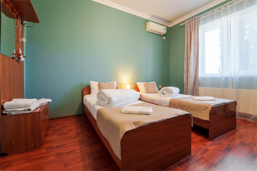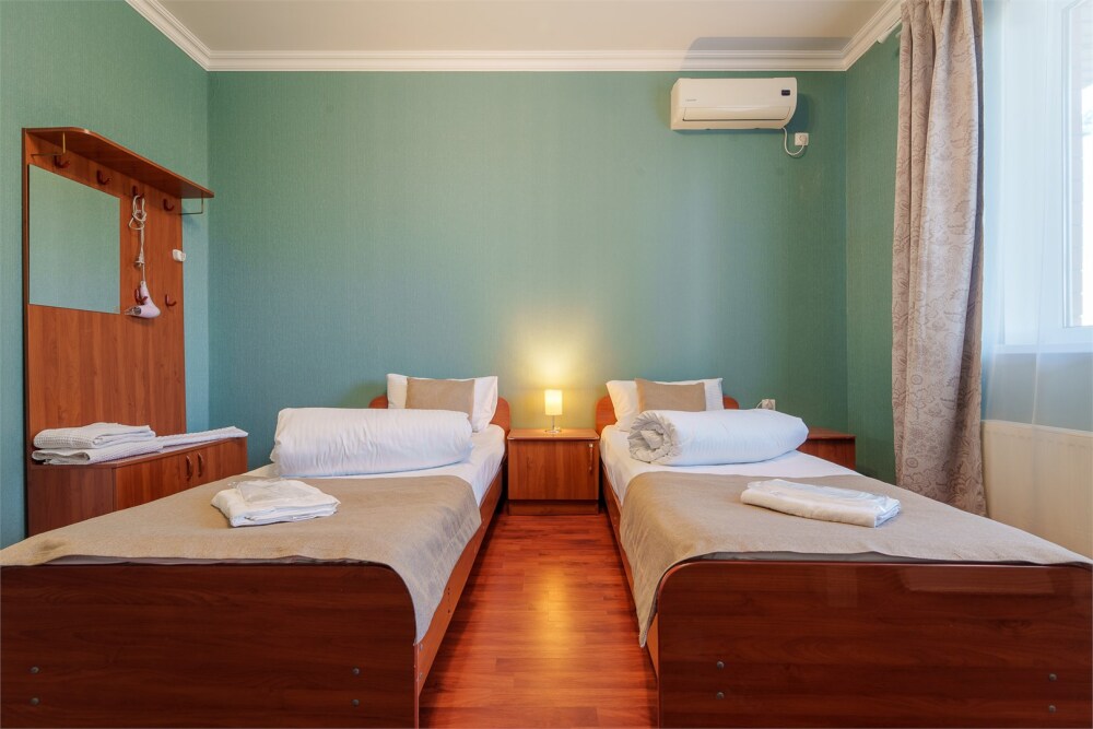 Стандарт с личной ванной комнатой возле номера, ванная комната предназначена для пользования только гостями проживающими в этом номере. В номере телевизор, кондиционер, холодильник, мебель. Раздельные кровати -2. Возможно размещение до 2 человек (на основном месте) и 1 человек на дополнительном месте (еврораскладушка).
