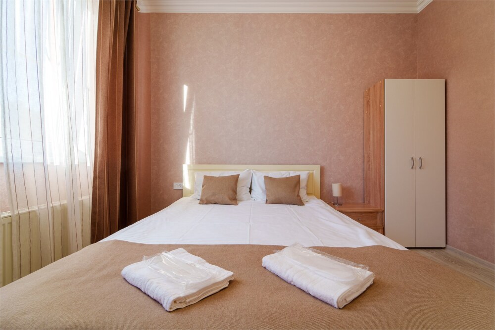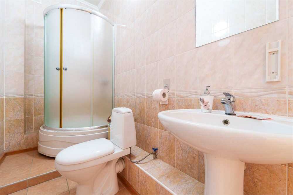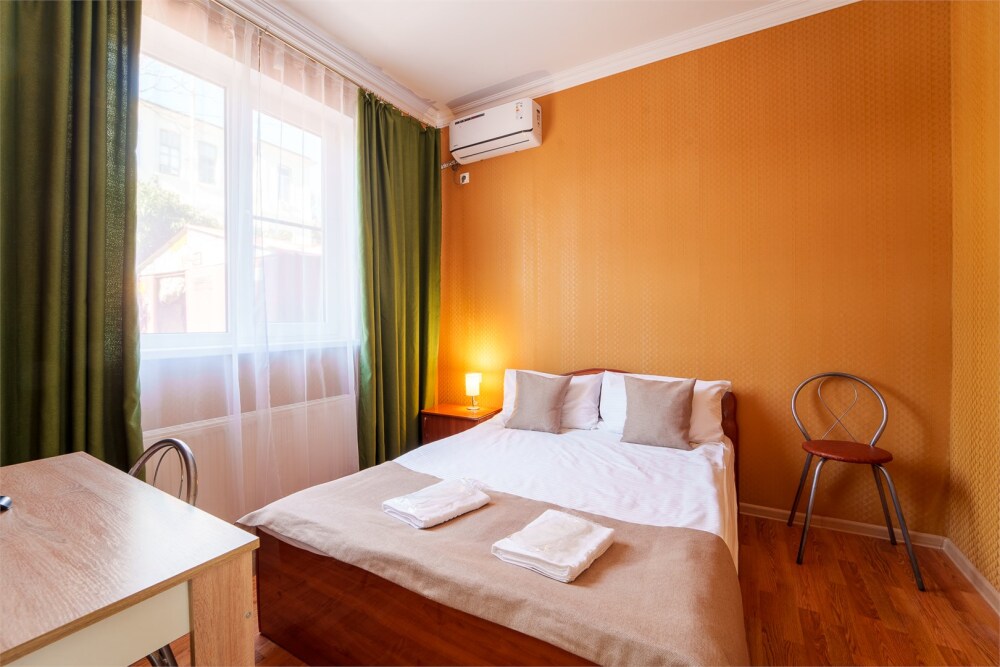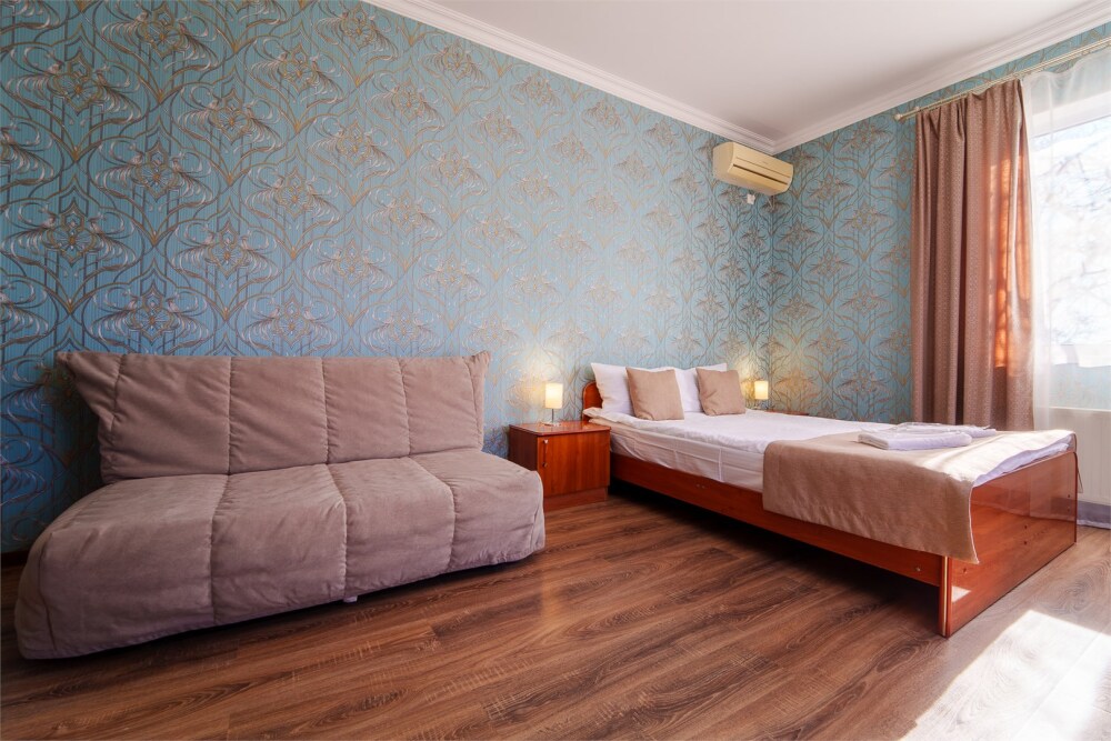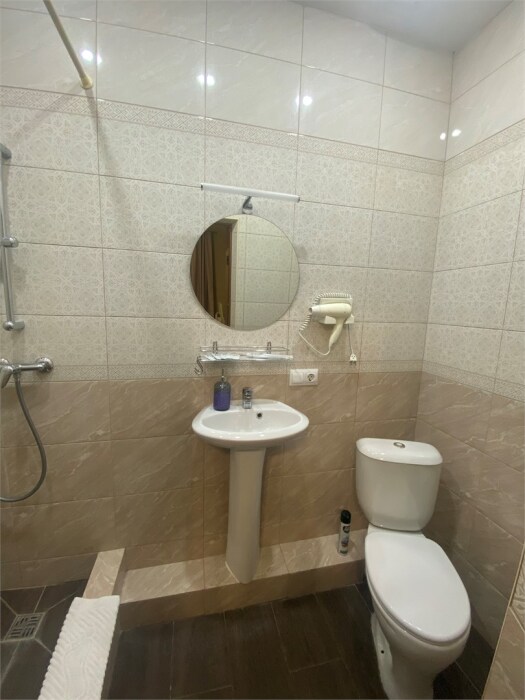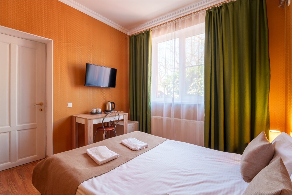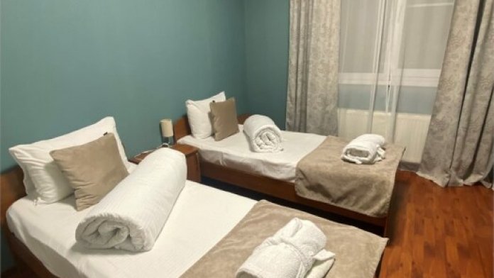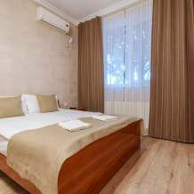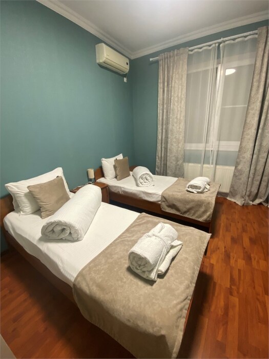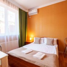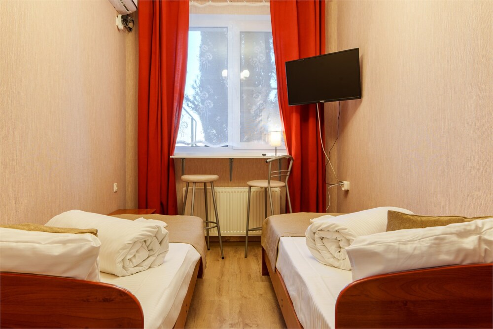 Стандарт с личной ванной комнатой возле номера, ванная комната предназначена для пользования только гостями проживающими в этом номере. В номере телевизор, кондиционер, холодильник, мебель. Раздельные кровати -2. Возможно размещение до 2 человек (на основном месте) и 1 человек на дополнительном месте (еврораскладушка).