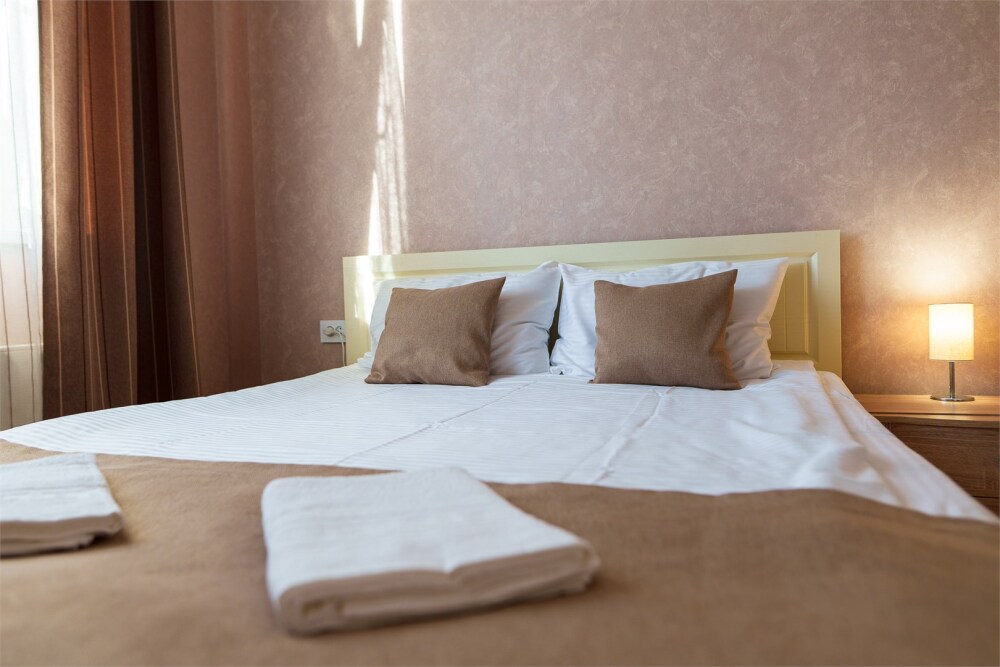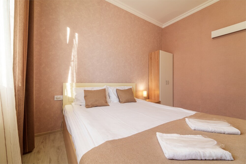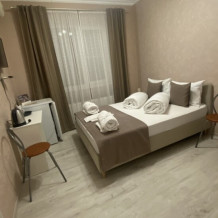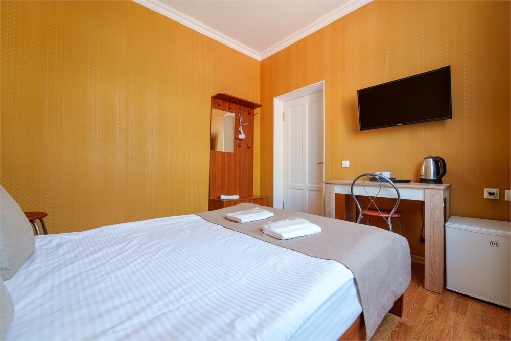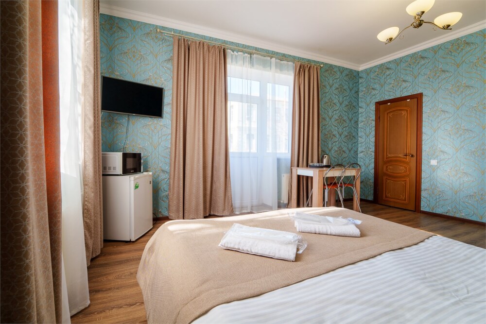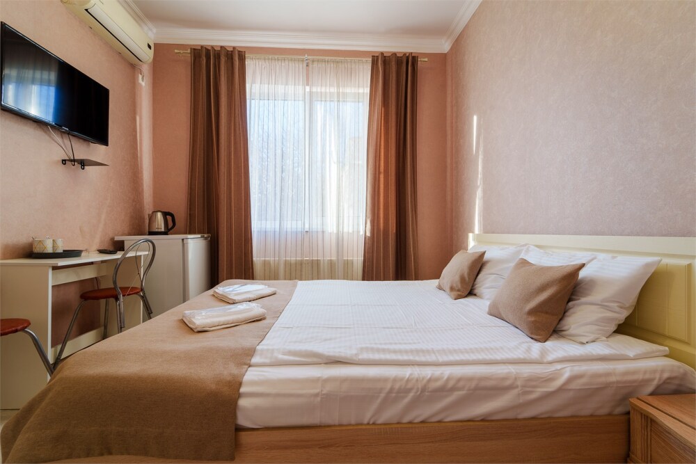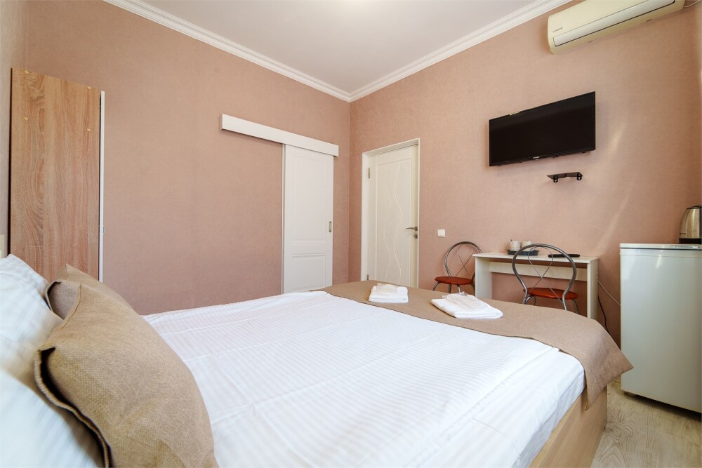 Двухместный номер категории стандарт. В ванной комнате душевая кабинка, раковина, унитаз, диспенсер с мылом, шампунь, гель для душа. В номере большая кровать для 1-2 человек. Номер оснащен кондиционером, телевизором, холодильником. Wi-fi в номере и на территории всего отеля. Белое белье, полотенца.
