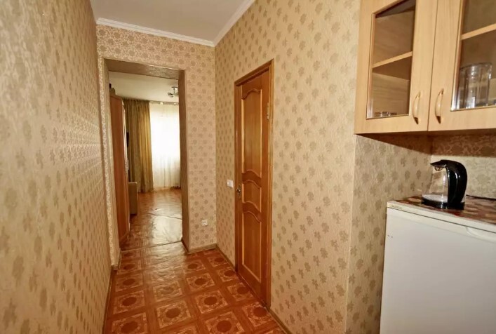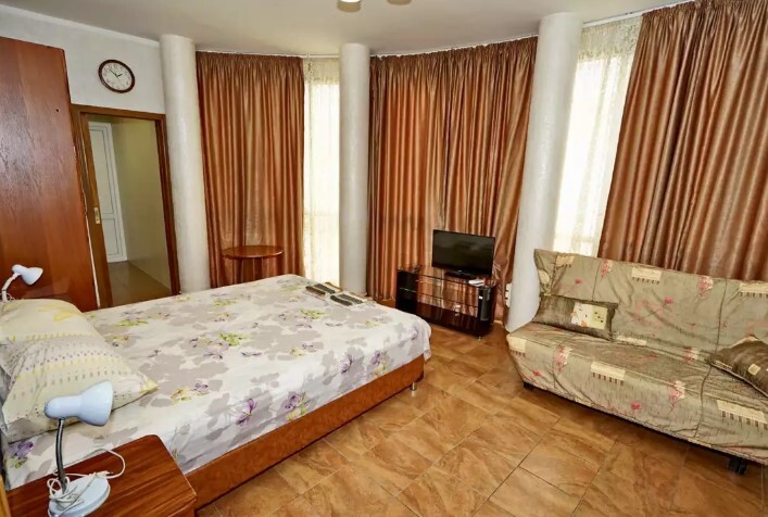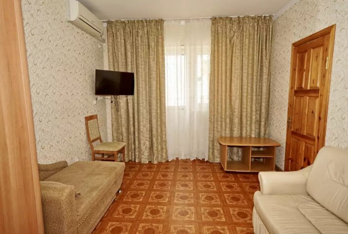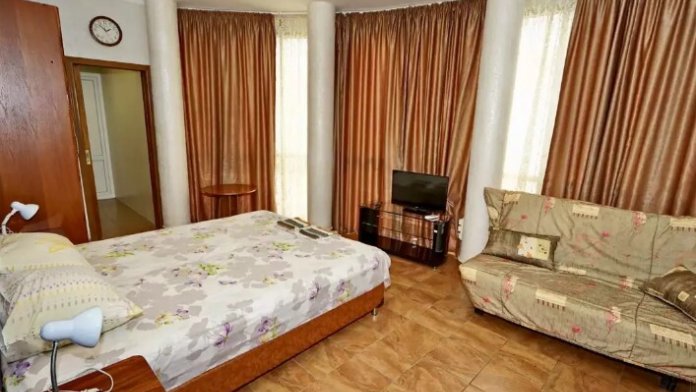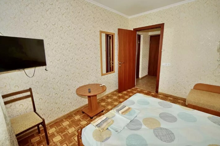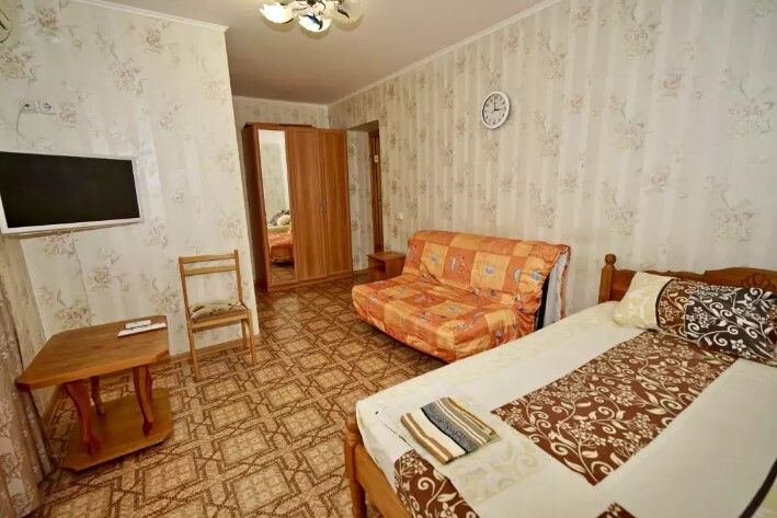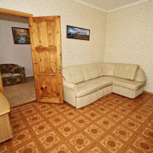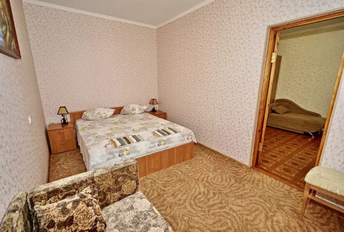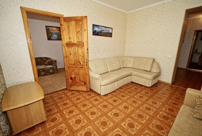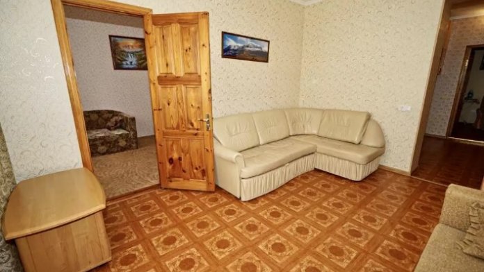 Спальные места:двух-спальная кровать, две односпальные и два кресло-кровать. Мебель: стулья, стол, шкаф, прикроватные тумбочки, прихожая, вешалка, зеркало. Одна комната проходная. Дополнительное место не входит в стоимость номера. Примечания к цене: Если в номере людей будет проживать больше, чем положено, нужно оплатить дополнительные места.