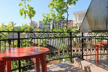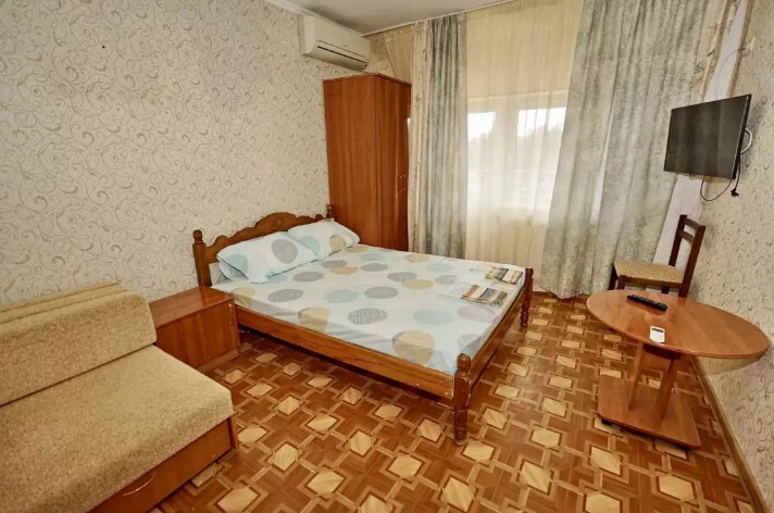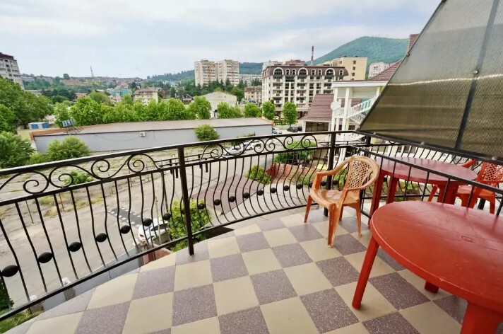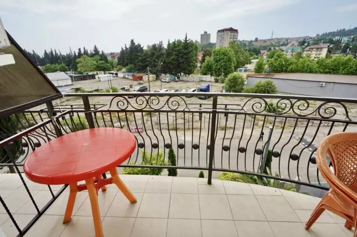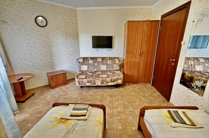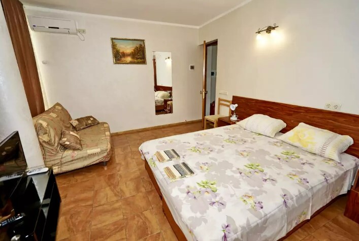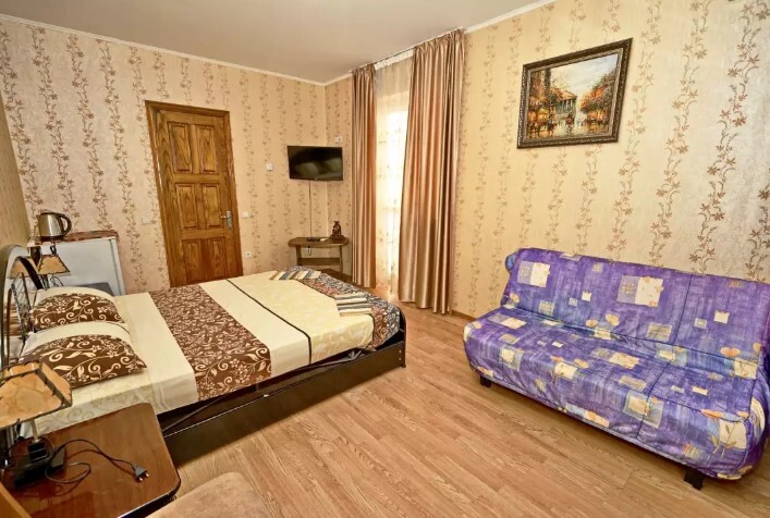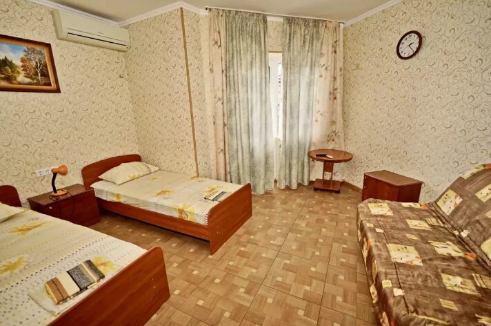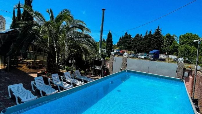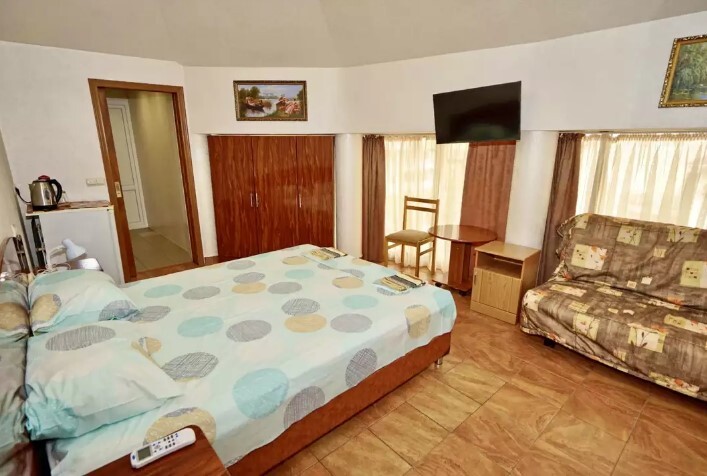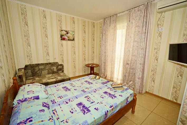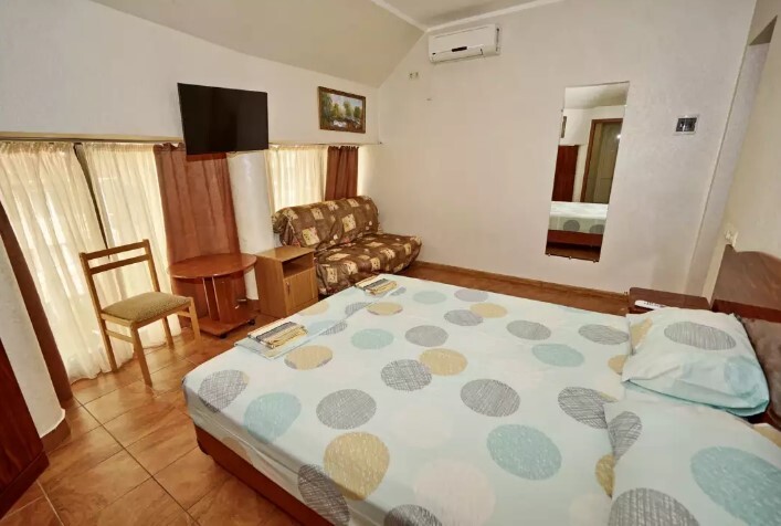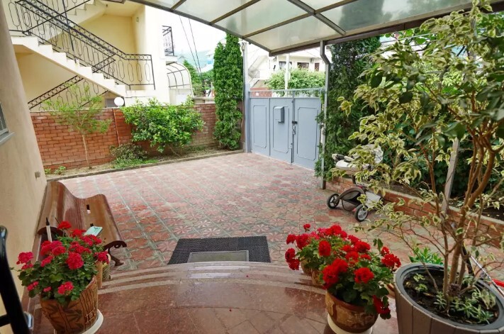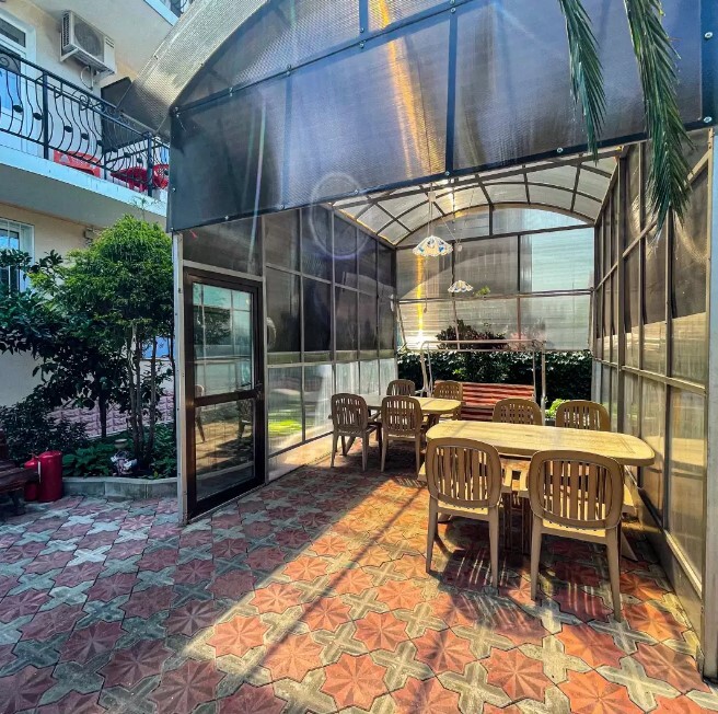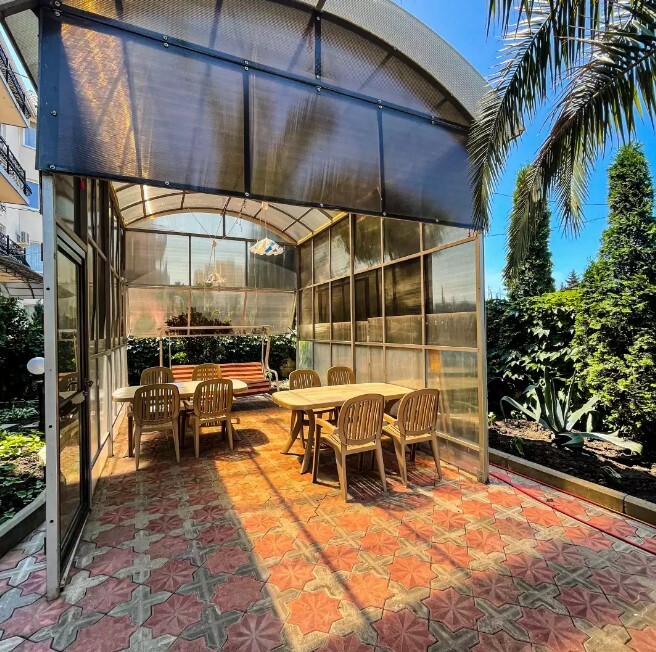 Двор оснащенный скамейками ,стульями, столами, зонтами.Во дворе гостевого дома, имеется просторный, бесплатный бассейн с шезлонгами для детей и взрослых.