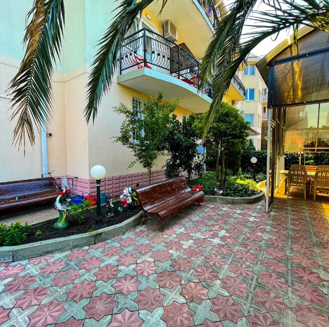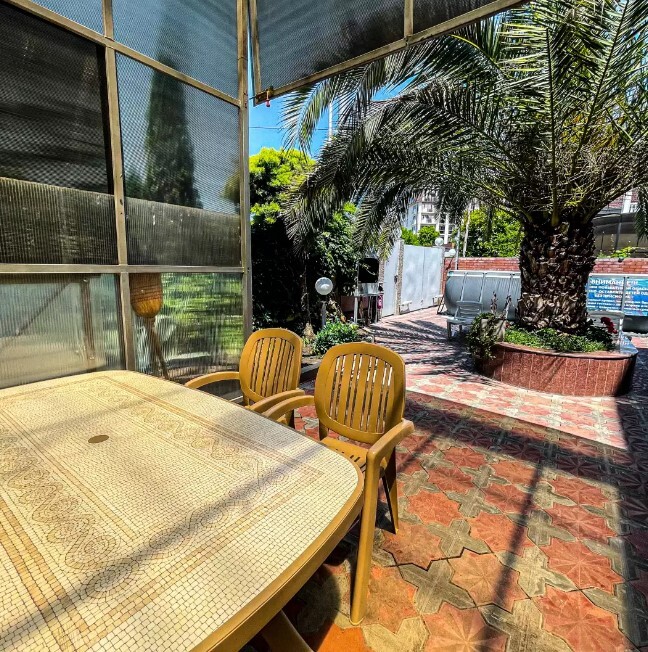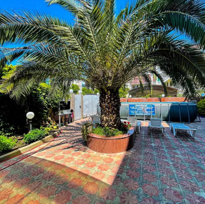 Для отдыха на свежем воздухе, есть просторный зеленый двор, со множеством южных растений и большими роскошными пальмами! Во дворе имеется мангальная зона со всем необходимым набором посуды.