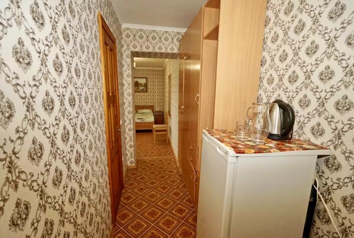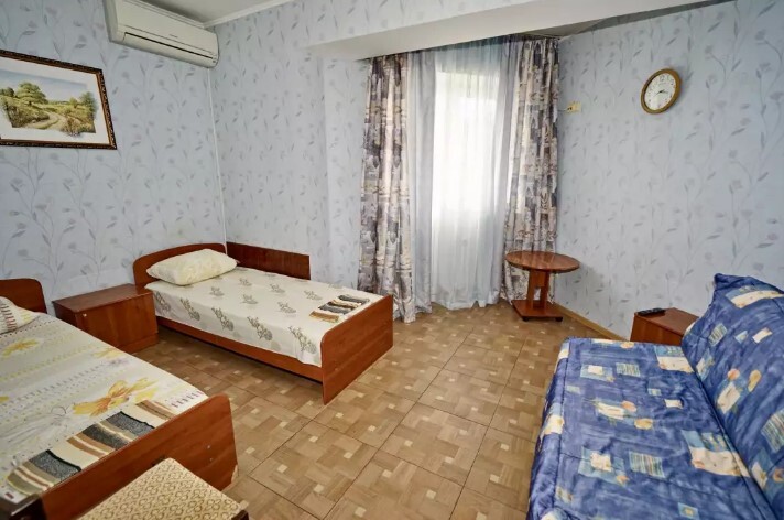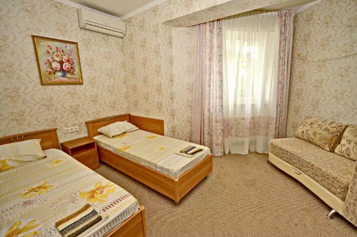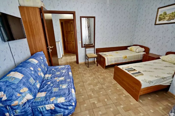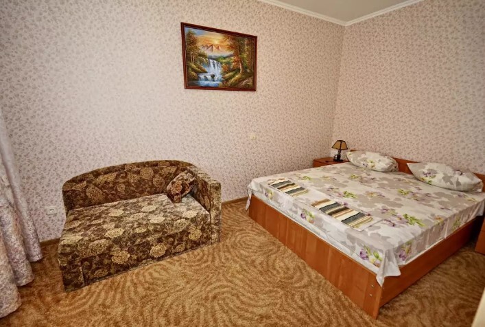 Спальные места:двух-спальная кровать или две односпальные и кресло-кровать. Мебель: стулья, стол, шкаф, прикроватные тумбочки, прихожая, вешалка, зеркало. Дополнительное место не входит в стоимость номера. Примечания к цене: Если в номере людей будет проживать больше, чем положено, нужно оплатить дополнительные места.