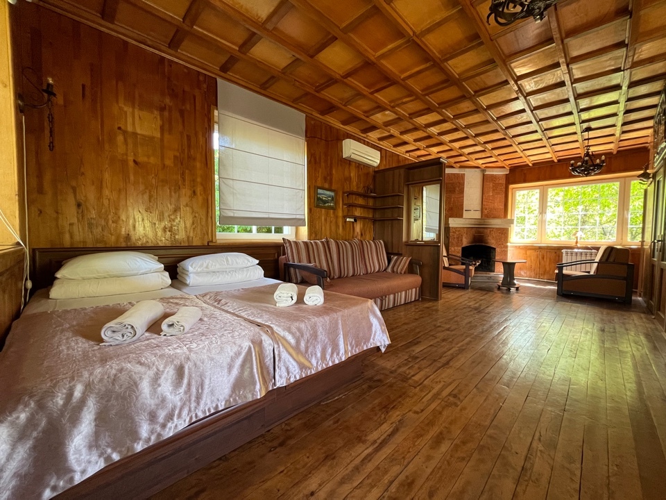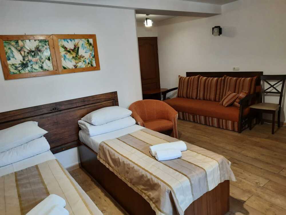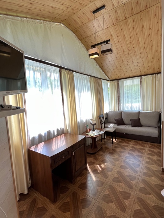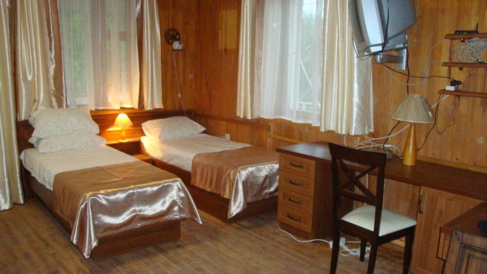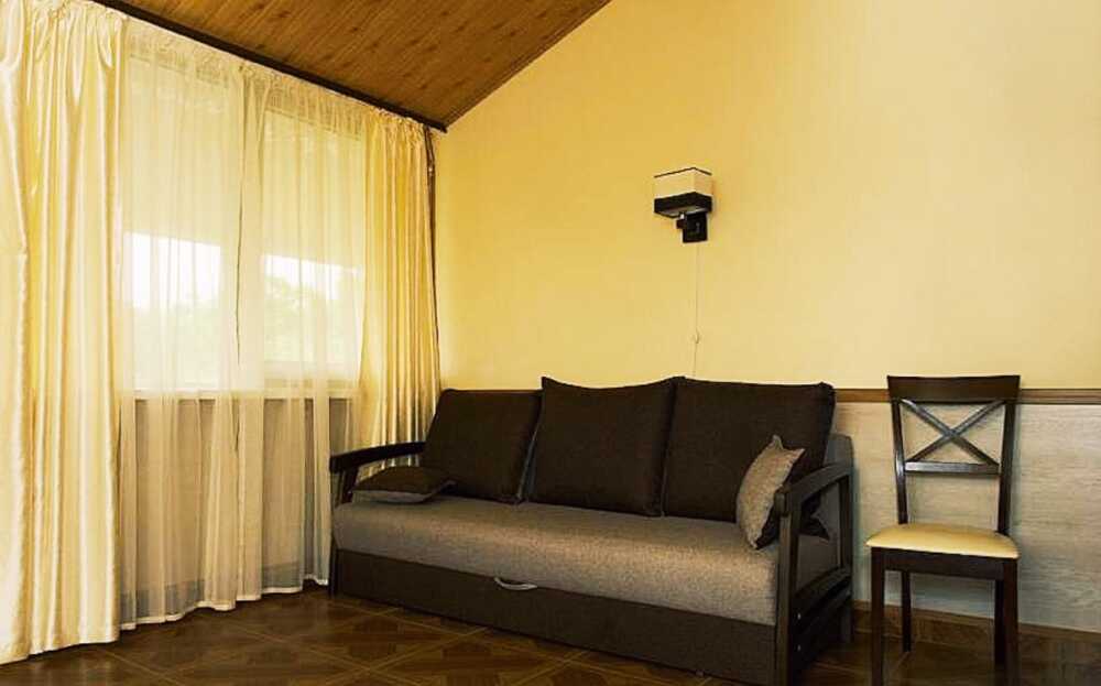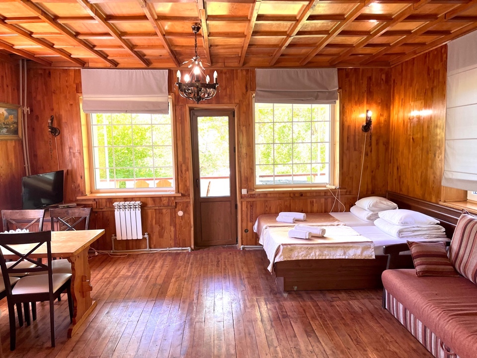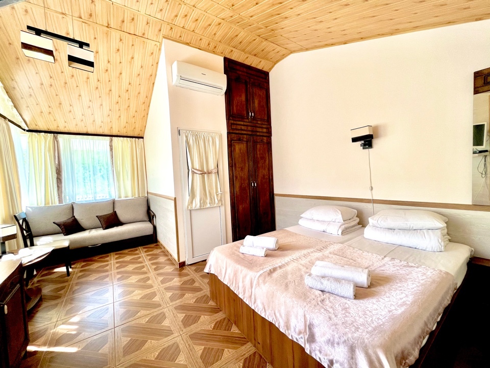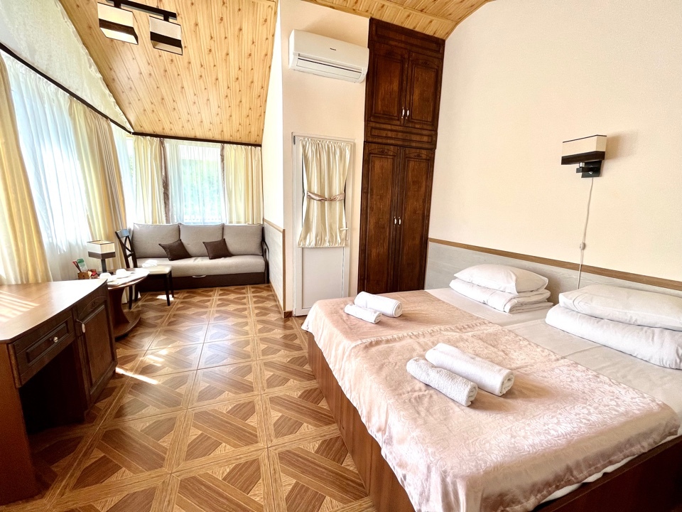 Уютная комната полулюкс семейная с двумя сдвигающимися односпальными кроватями или одной двуспальной кроватью и диван-кроватью 25 кв.м. Для гостей есть все необходимое для комфортного отдыха: балкон, кондиционер, место для хранения вещей, холодильник, кулер с питьевой водой (на этаже), телевизор с плоским экраном, посуда. В собственной ванной комнате: бесплатные туалетно-косметические принадлежности, полотенца, фен, туалетная бумага. В стоимость номера входит пользование бассейном, мангальной зоной, беседками, настольным теннисом, кострищем, залом для спортивных занятий.