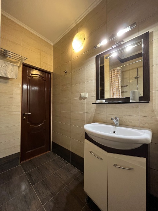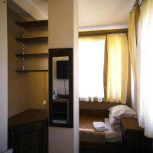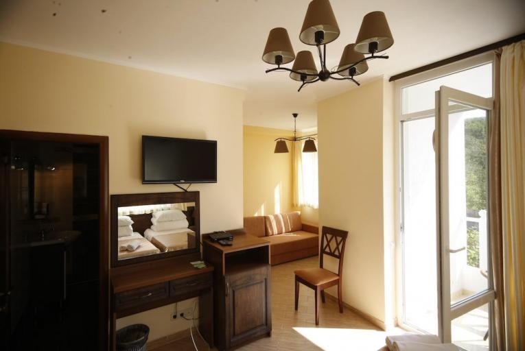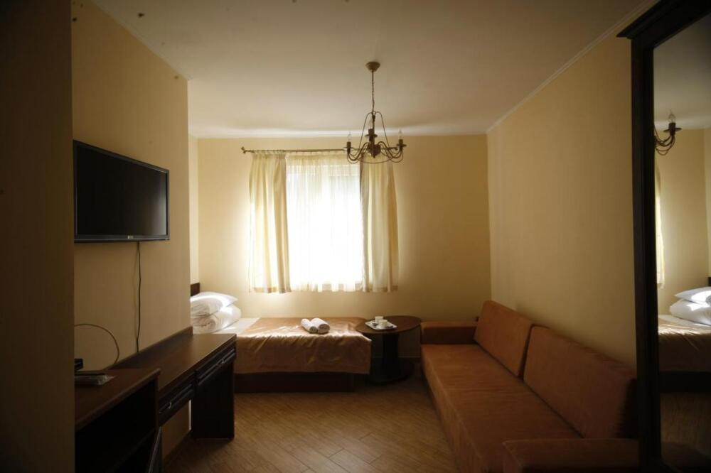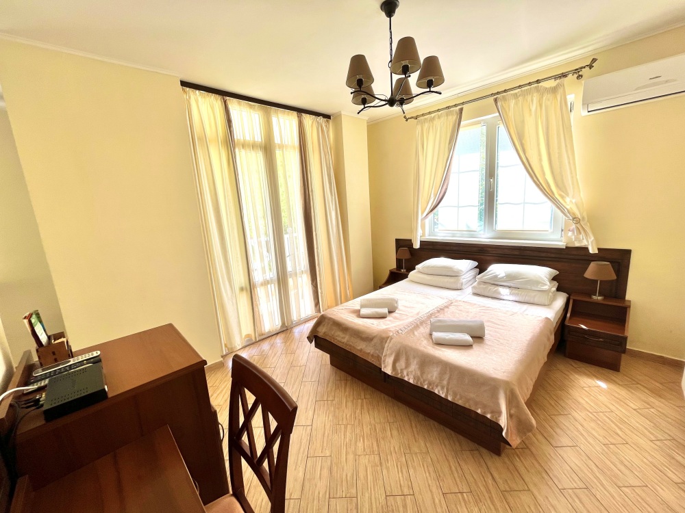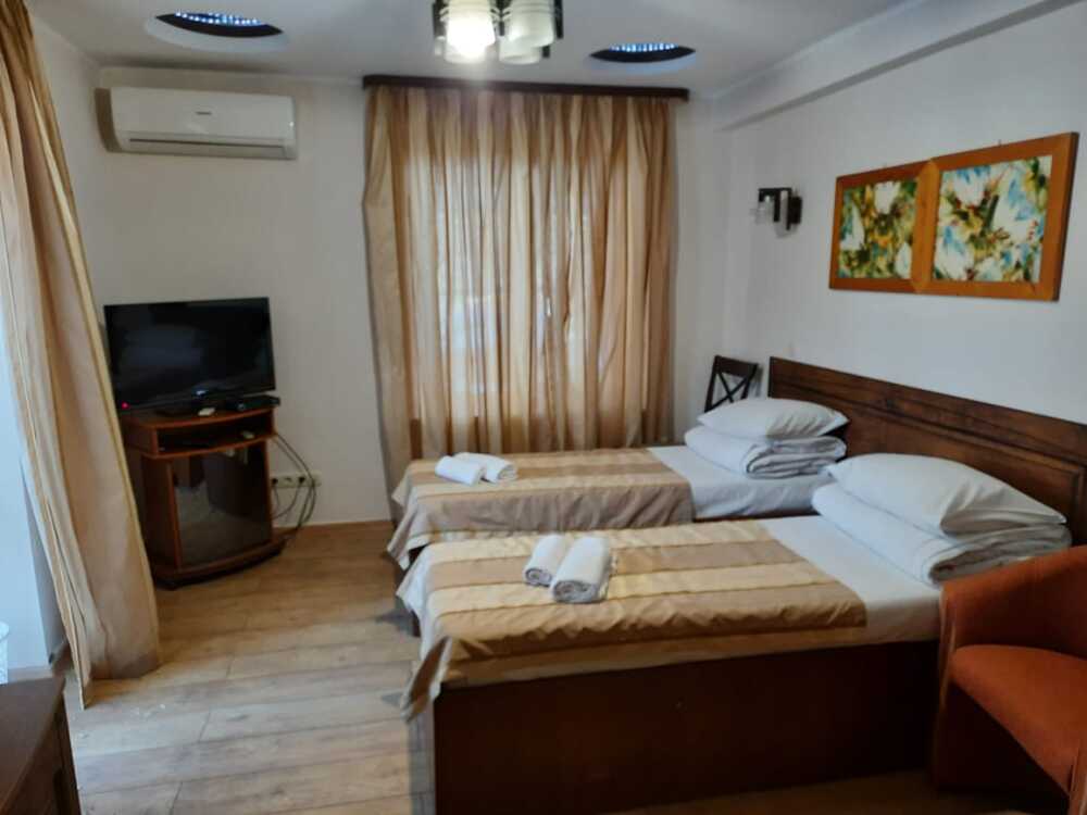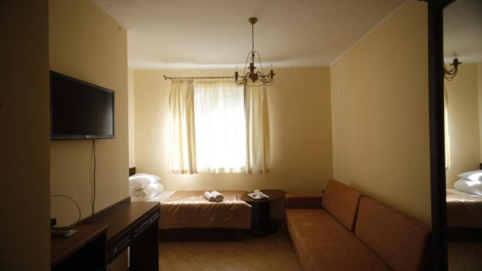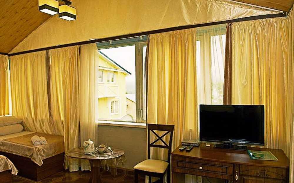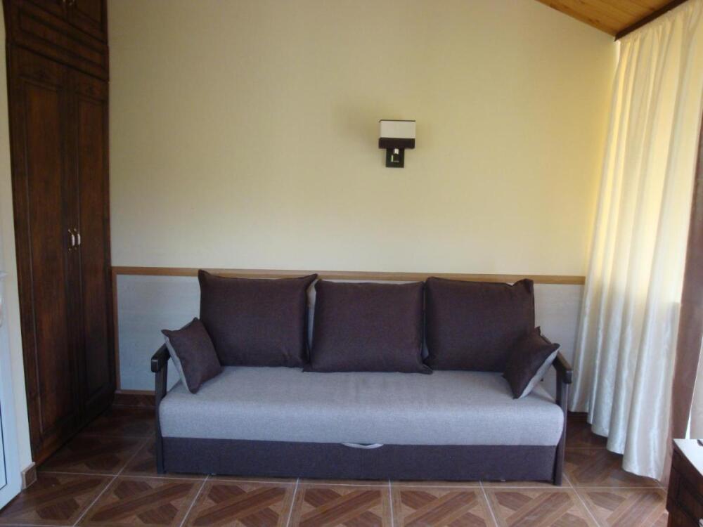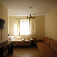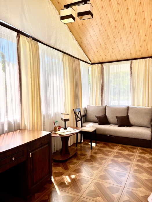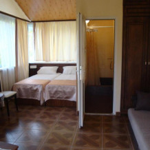 Уютная комната полулюкс семейная с двумя сдвигающимися односпальными кроватями или одной двуспальной кроватью и диван-кроватью 25 кв.м. Для гостей есть все необходимое для комфортного отдыха: балкон, кондиционер, место для хранения вещей, холодильник, кулер с питьевой водой (на этаже), телевизор с плоским экраном, посуда. В собственной ванной комнате: бесплатные туалетно-косметические принадлежности, полотенца, фен, туалетная бумага. В стоимость номера входит пользование бассейном, мангальной зоной, беседками, настольным теннисом, кострищем, залом для спортивных занятий.