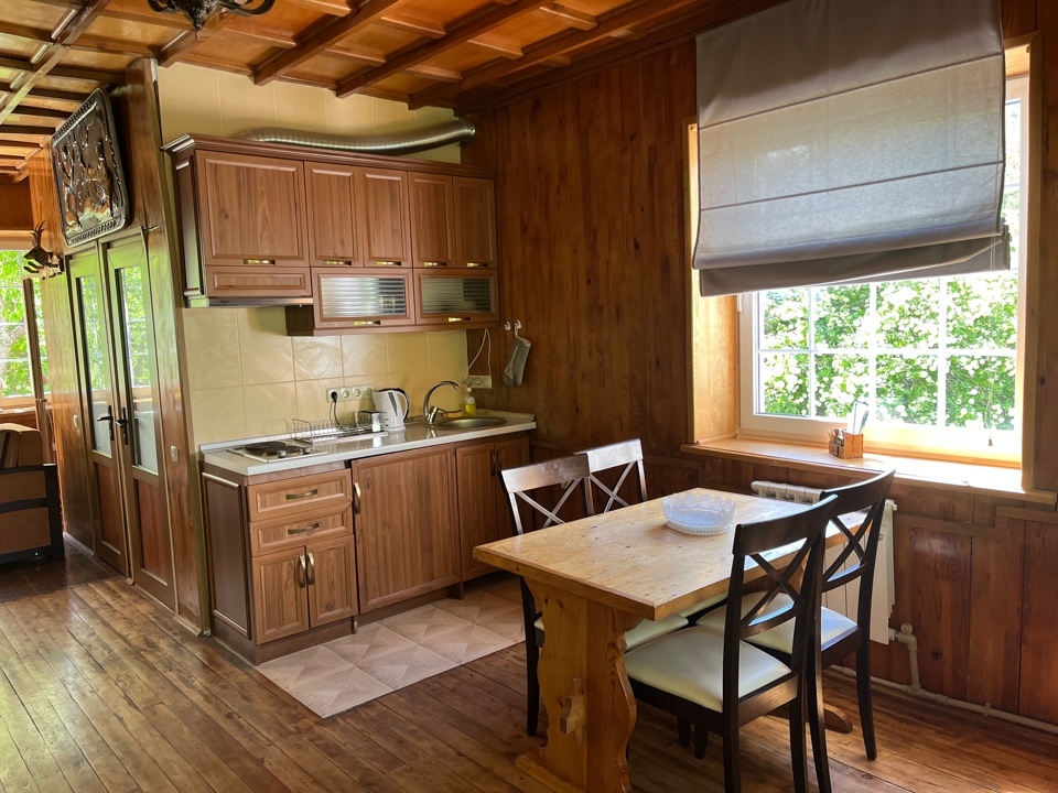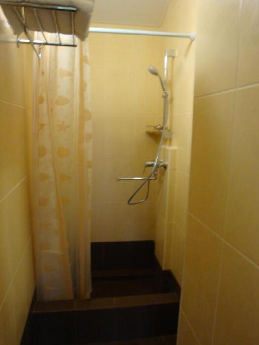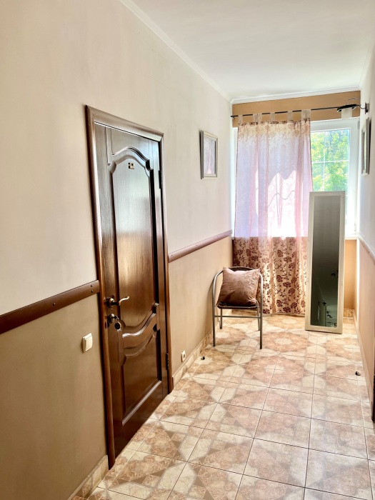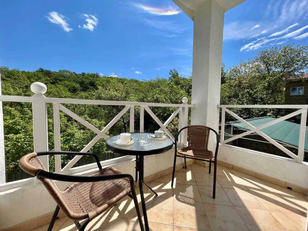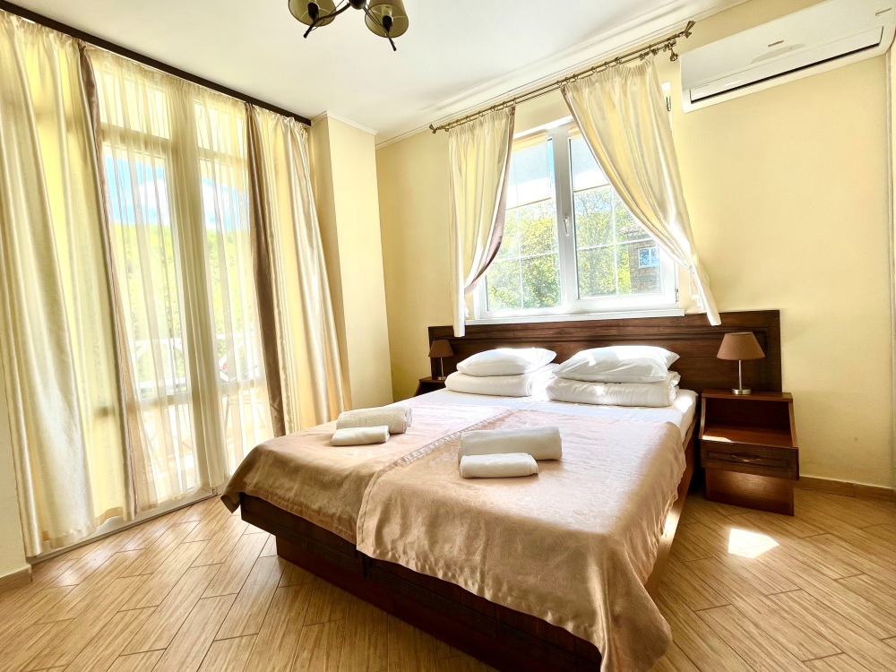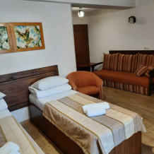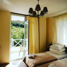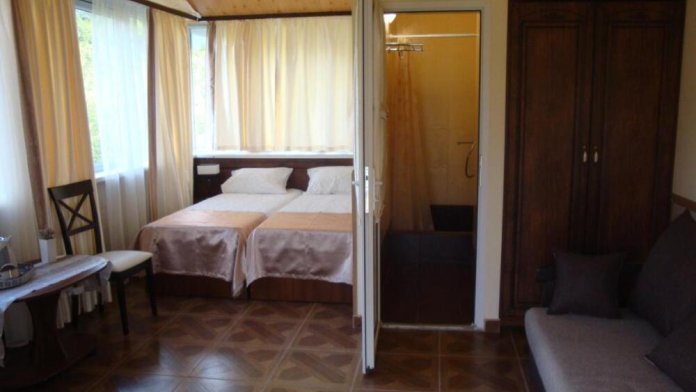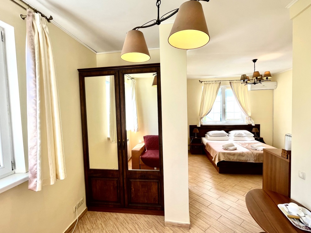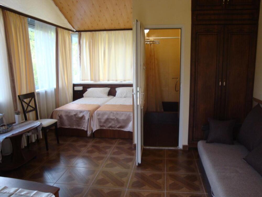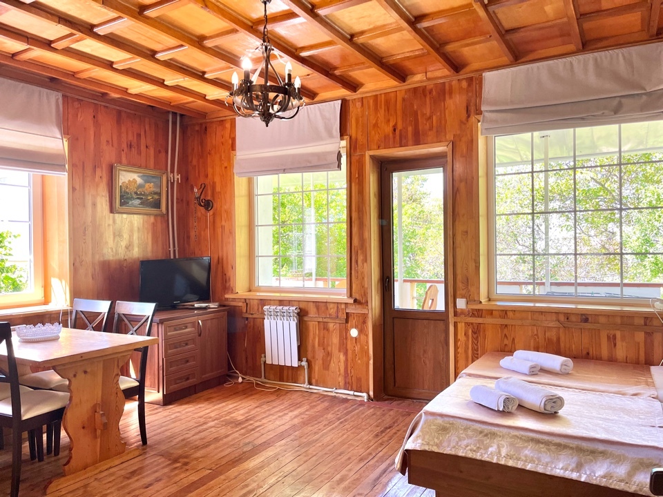 Удобная комната полулюкс с двумя сдвигающимися односпальными кроватями и диван-кроватью, 20 кв. м. Расположена на первом этаже с отдельным входом. Особенностью является наличие смежной двери с общей кухней, что очень удобно для гостей, которые планируют готовить. В номере для гостей есть все необходимое для комфортного отдыха: терраса, кондиционер, платяной шкаф, холодильник, кулер с питьевой водой (на кухне), телевизор с плоским экраном, посуда. В собственной ванной комнате: бесплатные туалетно-косметические принадлежности, полотенца, фен, туалетная бумага, душевая со стеклом.