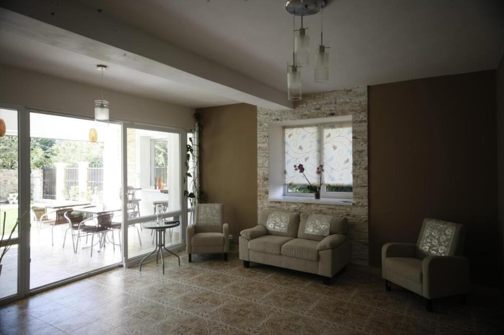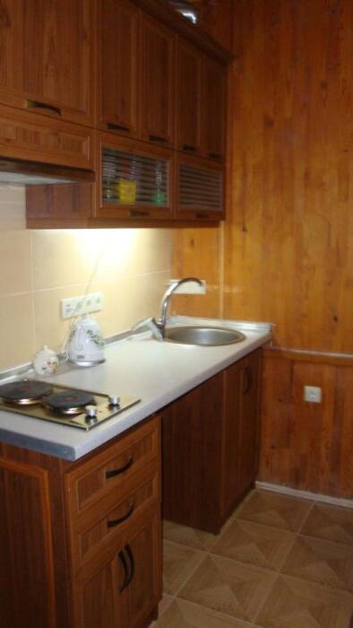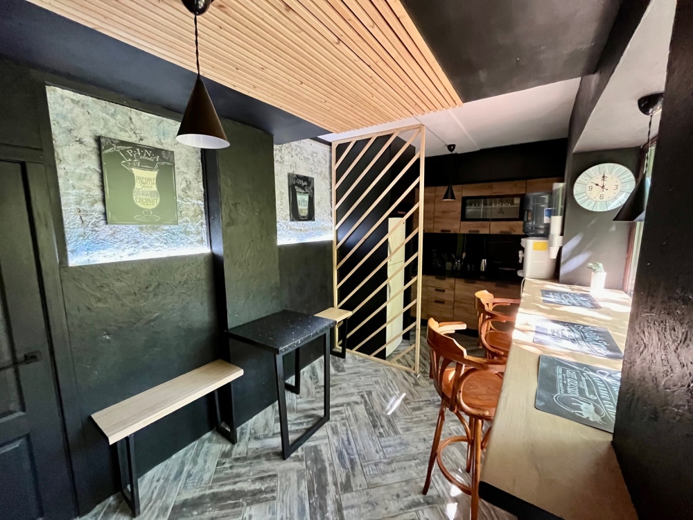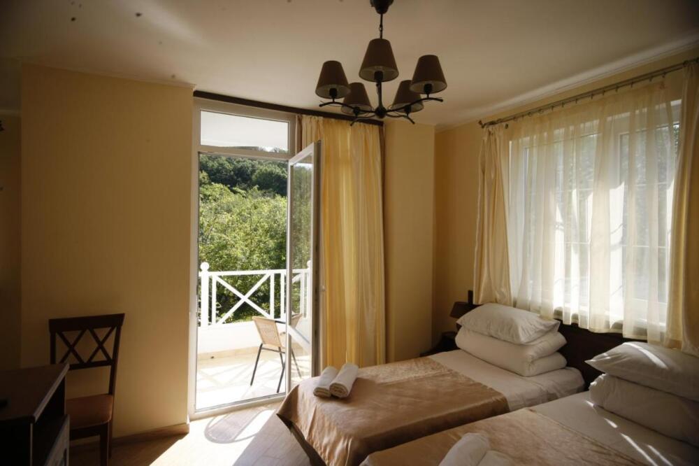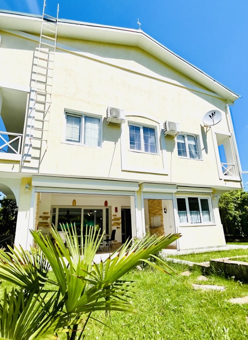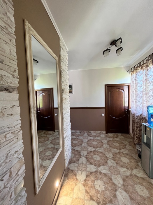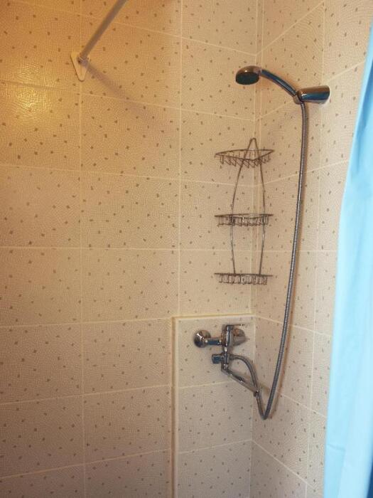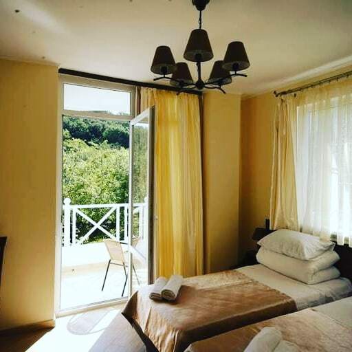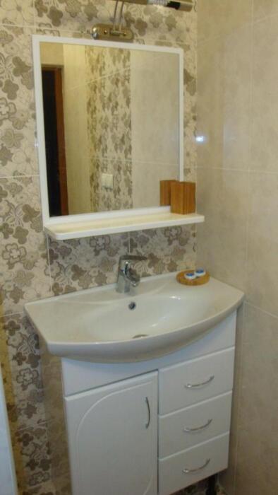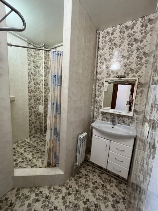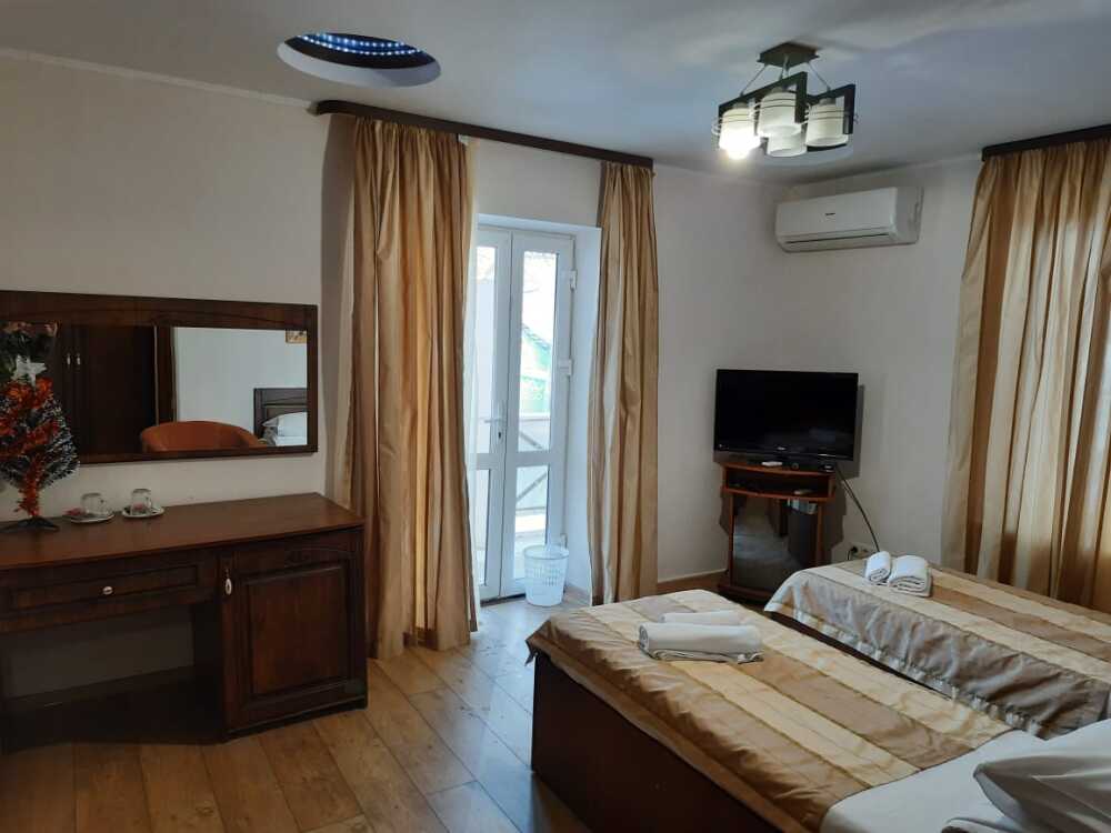 Удобная комната полулюкс с двумя сдвигающимися односпальными кроватями и диван-кроватью, 20 кв. м. Расположена на первом этаже с отдельным входом. Особенностью является наличие смежной двери с общей кухней, что очень удобно для гостей, которые планируют готовить. В номере для гостей есть все необходимое для комфортного отдыха: терраса, кондиционер, платяной шкаф, холодильник, кулер с питьевой водой (на кухне), телевизор с плоским экраном, посуда. В собственной ванной комнате: бесплатные туалетно-косметические принадлежности, полотенца, фен, туалетная бумага, душевая со стеклом.