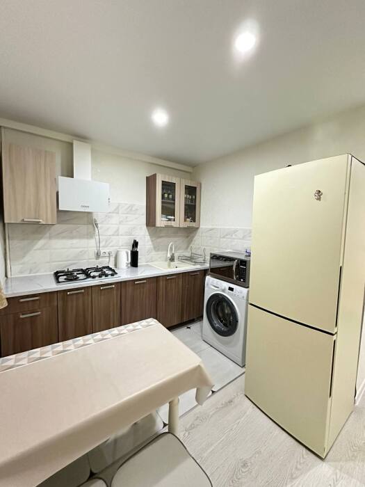 Полное оснащение кухни бытовой техникой, включая микроволновую печь и стиральную машину, позволяет полностью переложить бытовые заботы на технику и сосредоточиться на отпуске. Гладильные принадлежности в прихожей и сушилка за окном — практичные детали, которые делают пребывание здесь максимально автономным и удобным.
