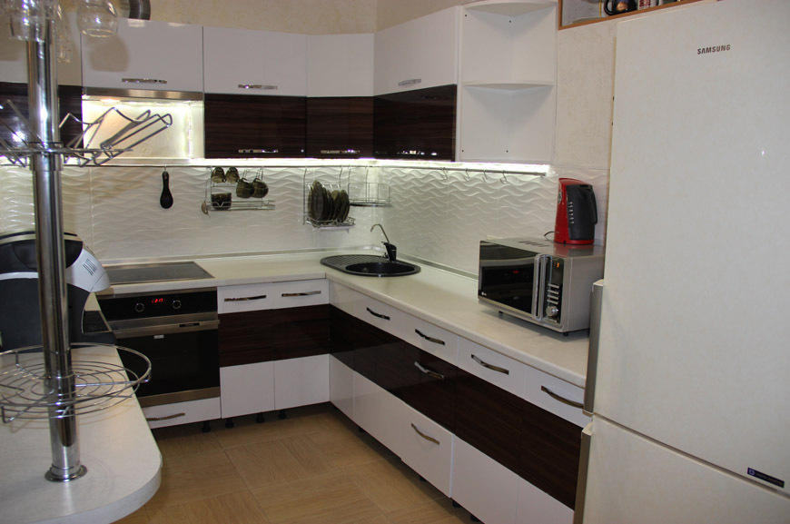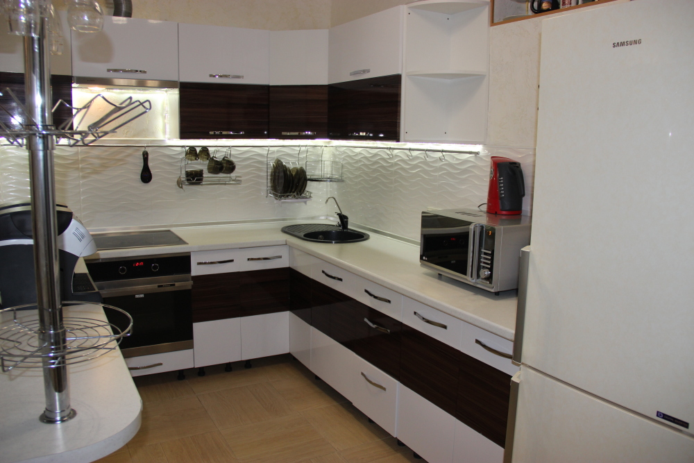 кухня (шкафы для посуды, холодильник, эл.печь, микроволновая печь, электрочайник, столовая посуда)
