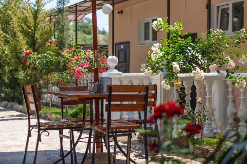 балкон из двух комнат со столиком и стульями.