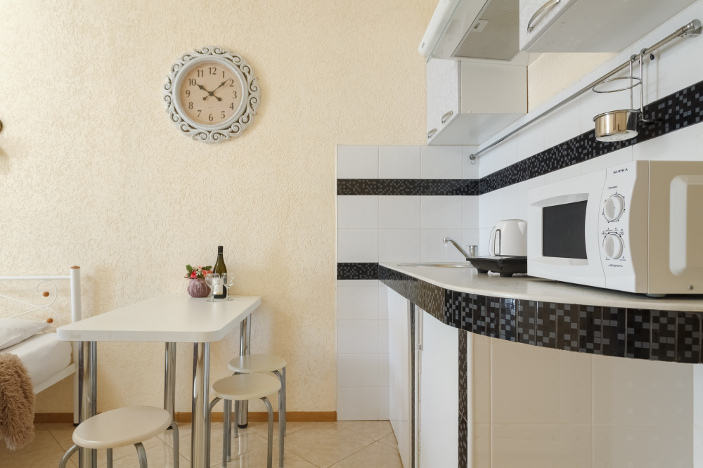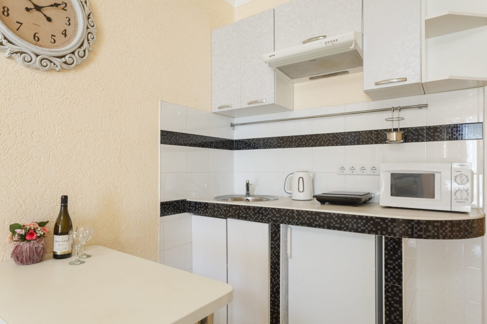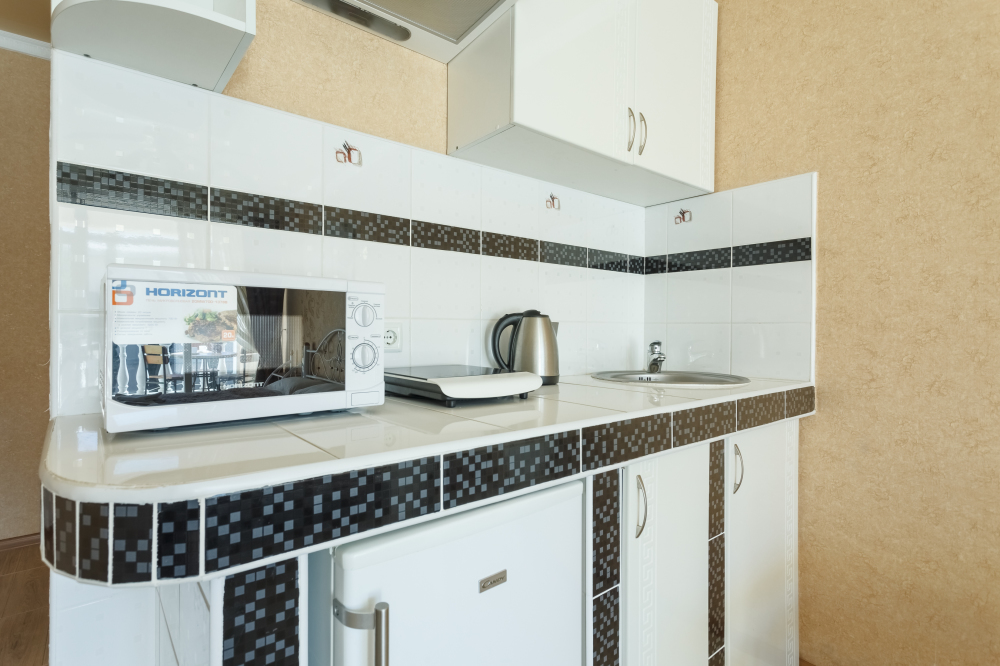 микроволновая печь, электрическая (индукционная) печь, посудомоечная машина, электрочайник, столовая посуда;