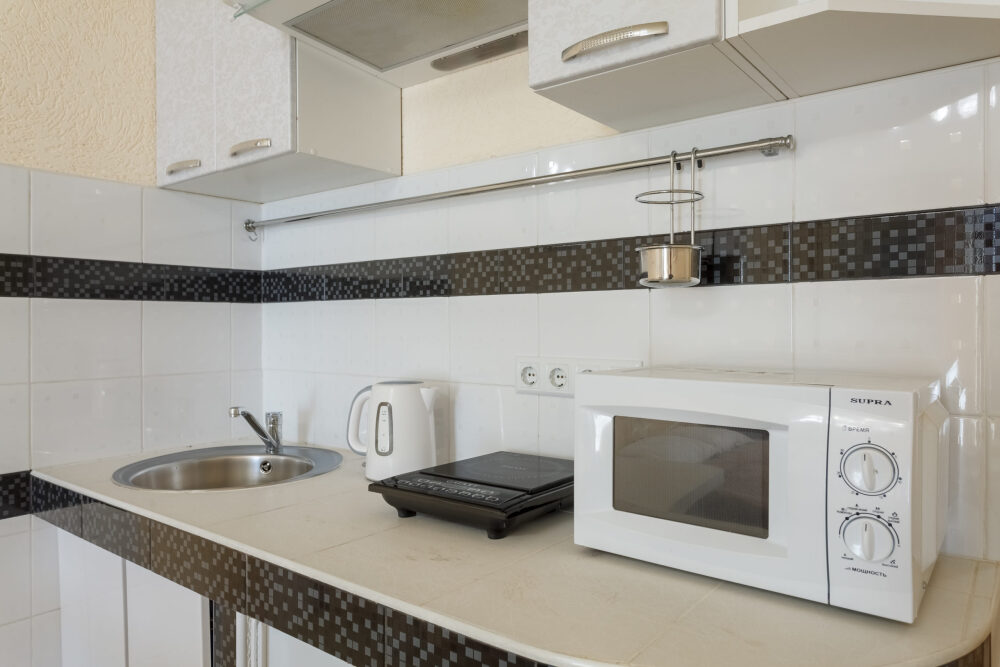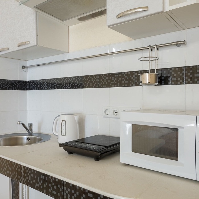 -электрическая индукц. плита, микроволновая печь, электрочайник, столовая посуда;
